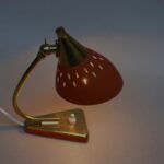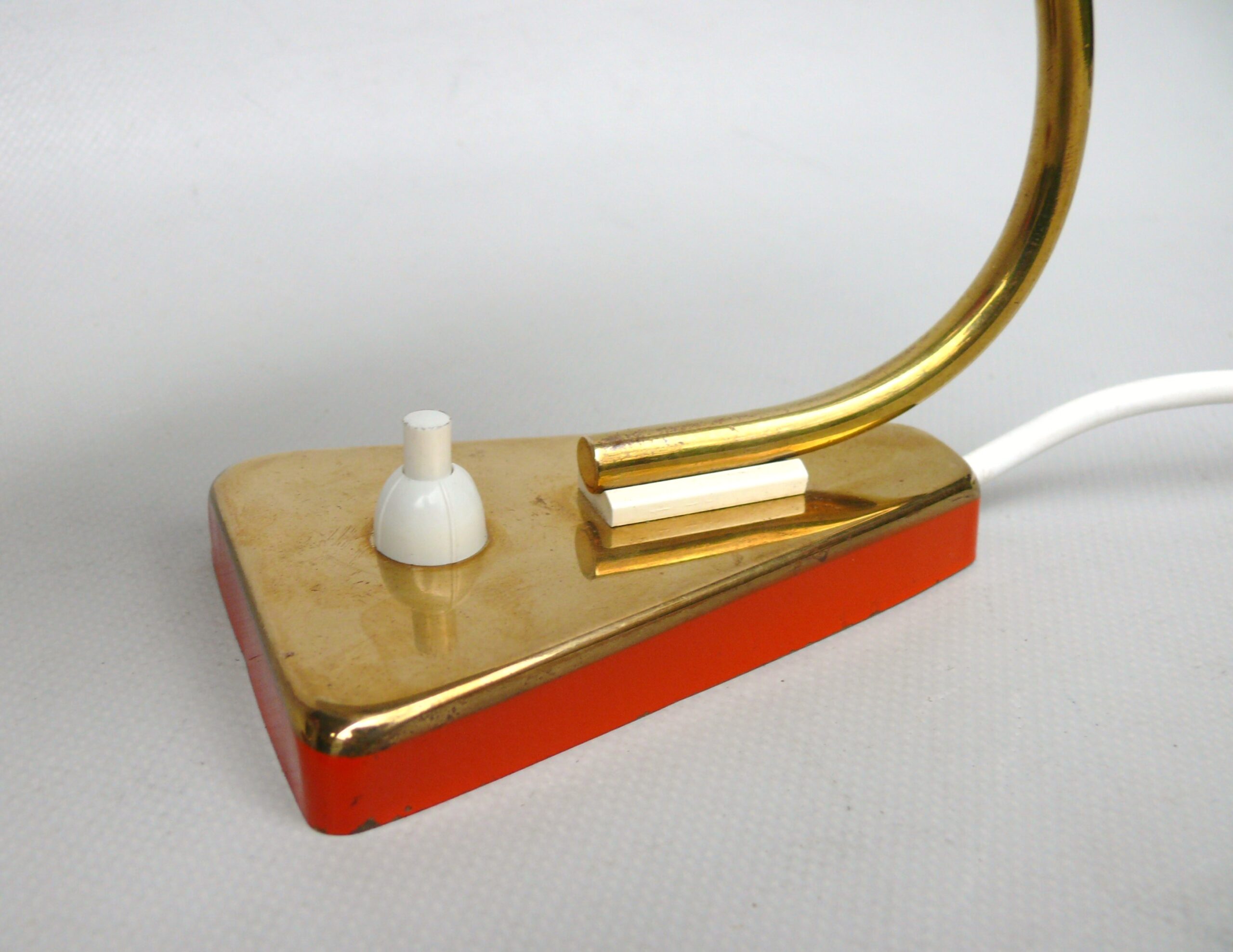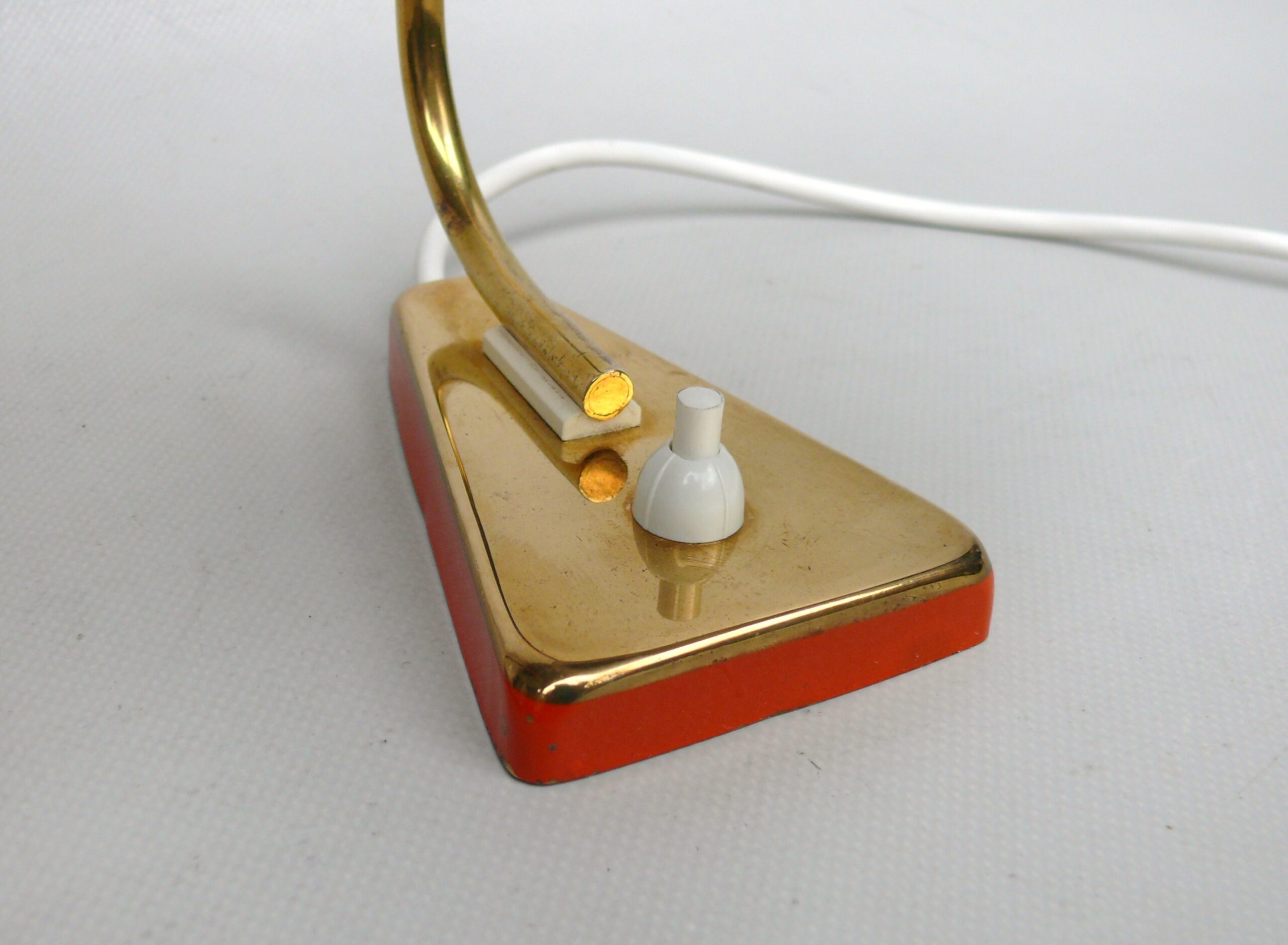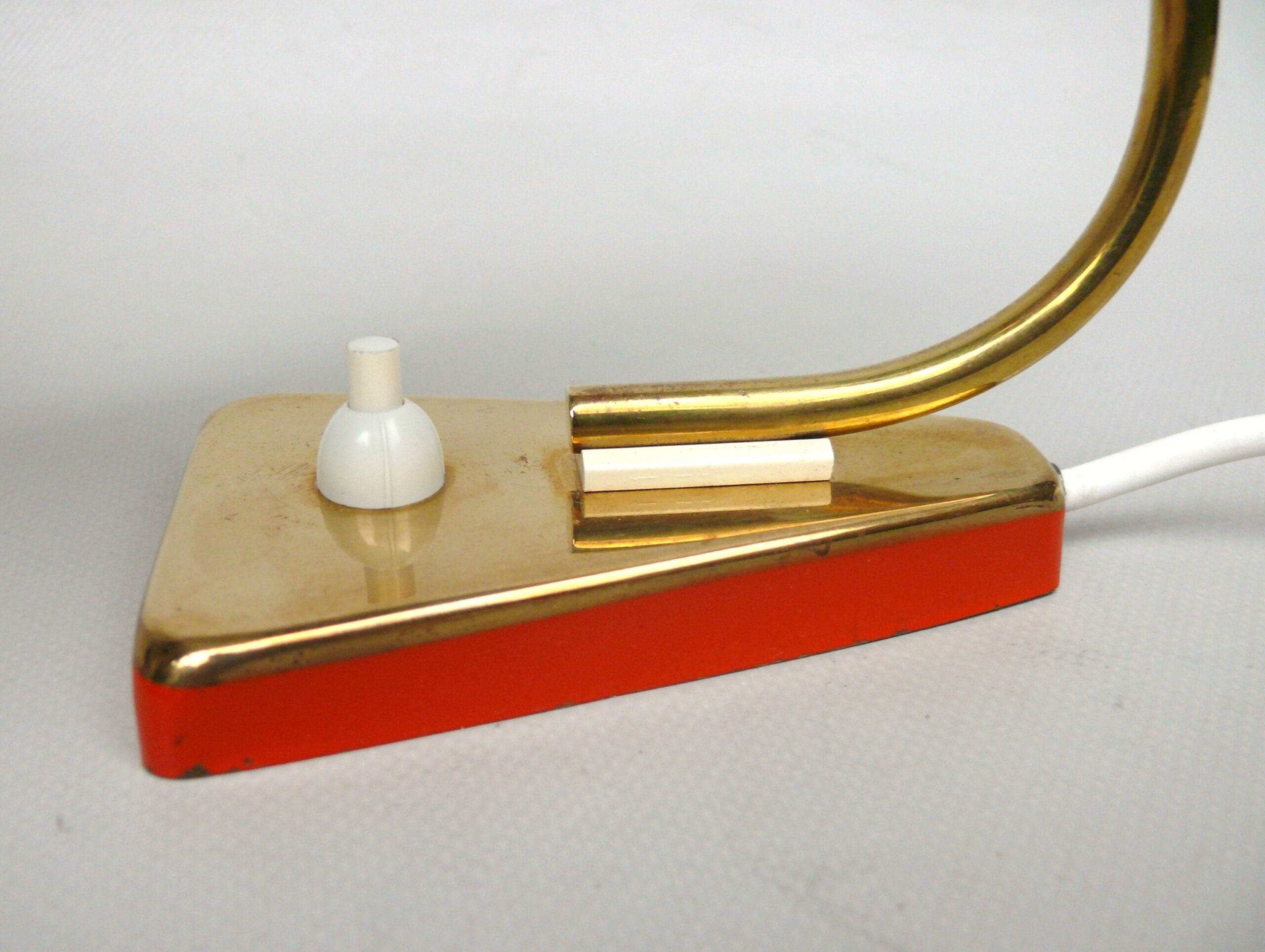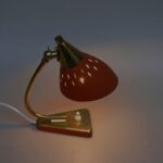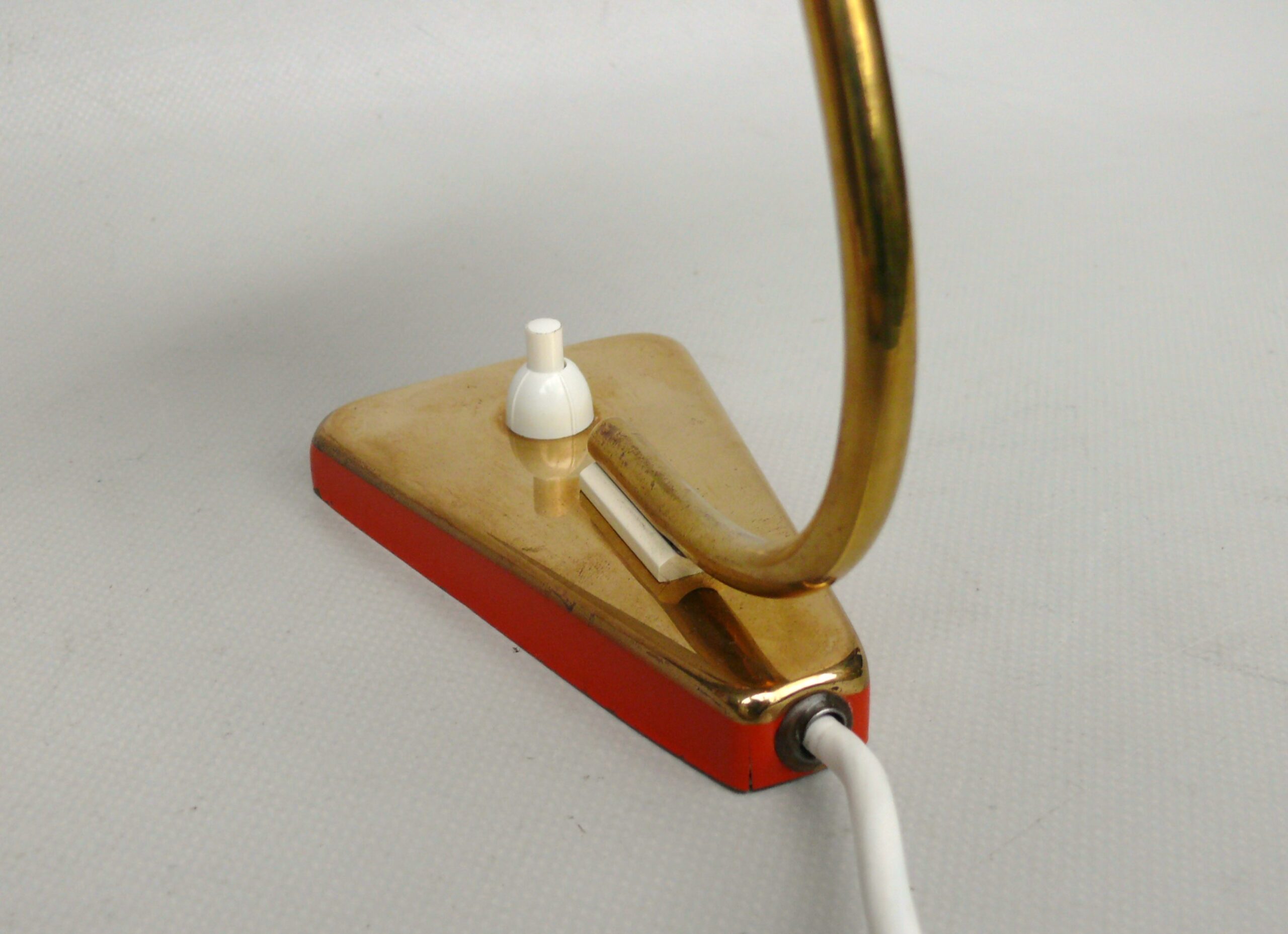 Ein Paar zierliche und außergewöhnlichte Nachttischleuchten, hergestellt in den 50er Jahren in Deutschland.Elegant ist die Kombination von Messing mit schwarz, rot und beige.