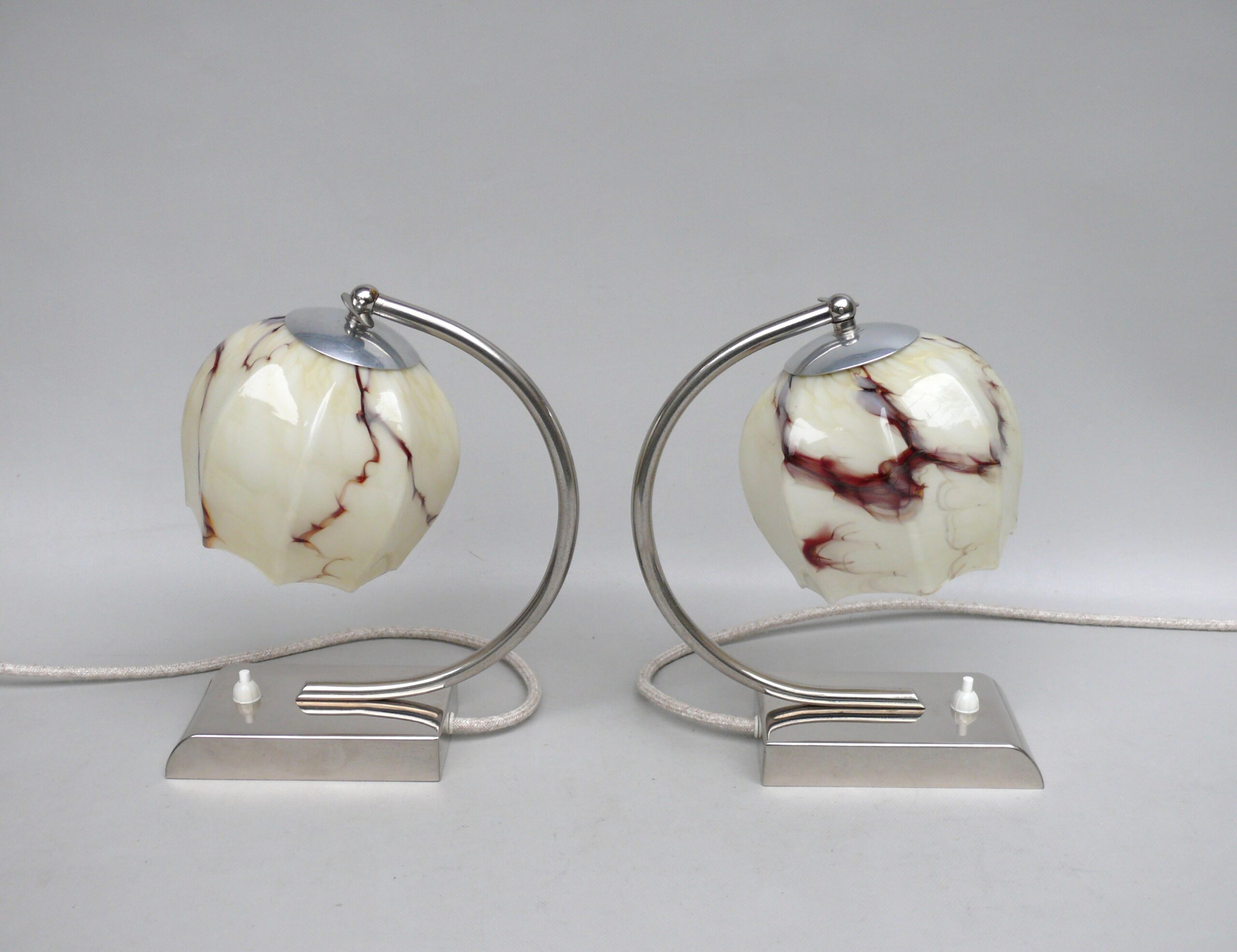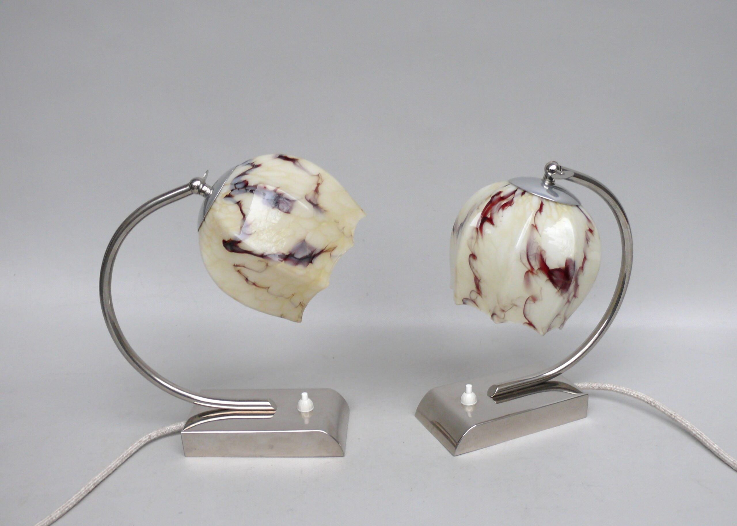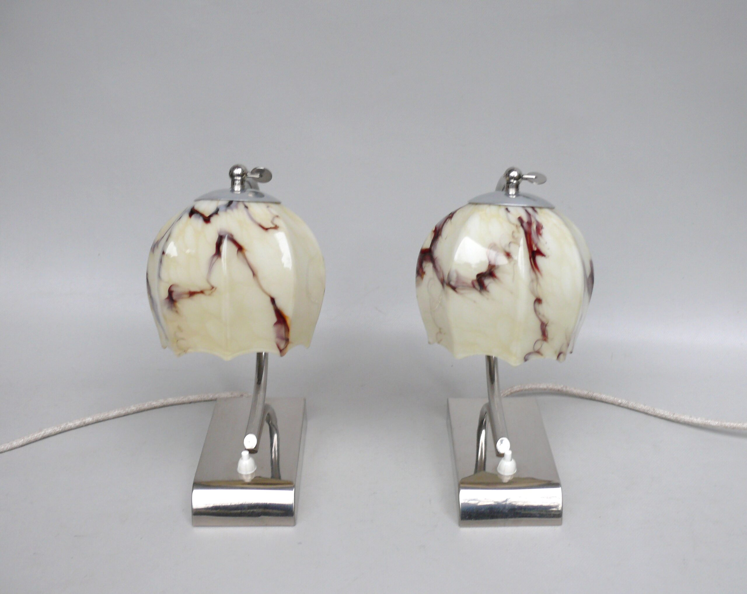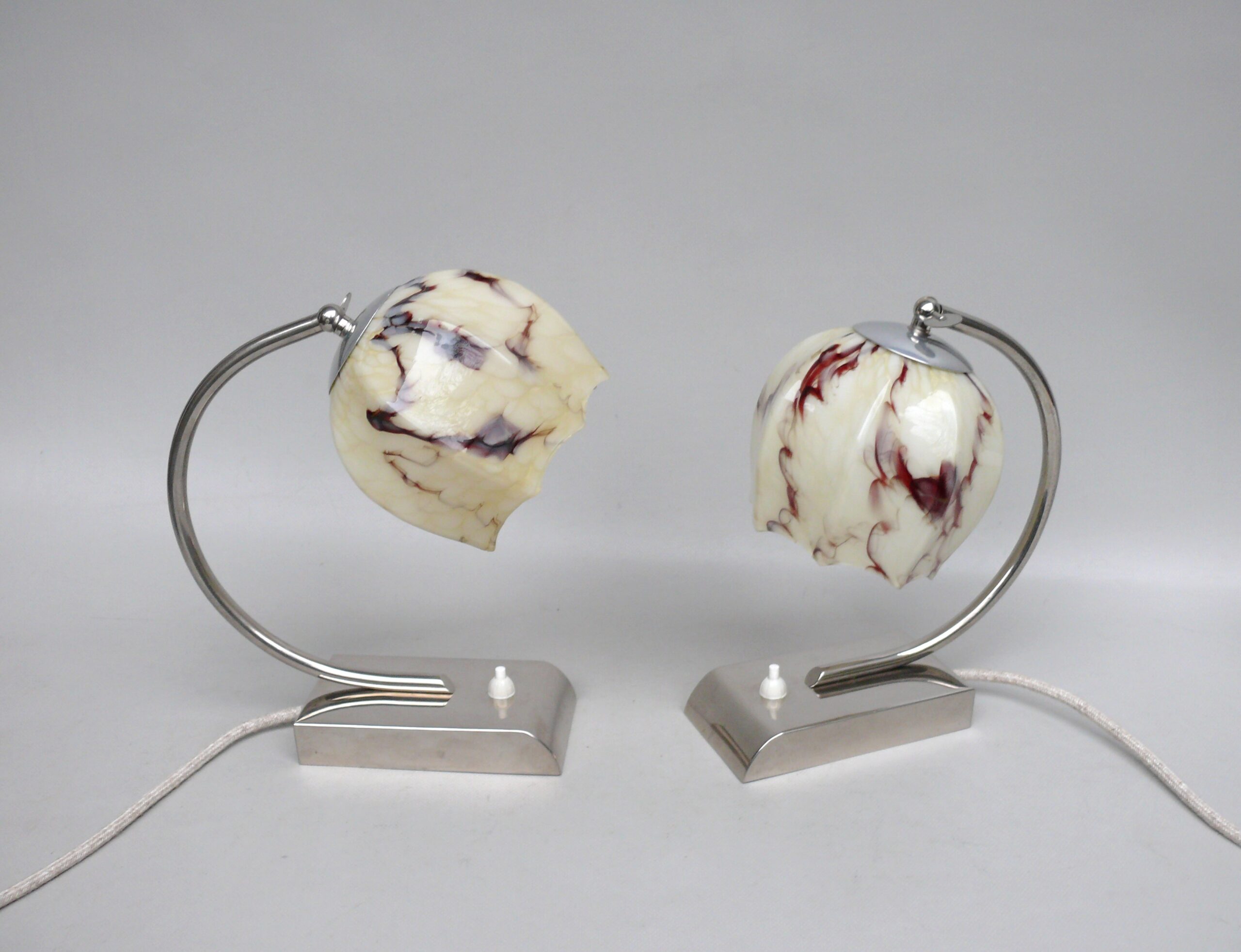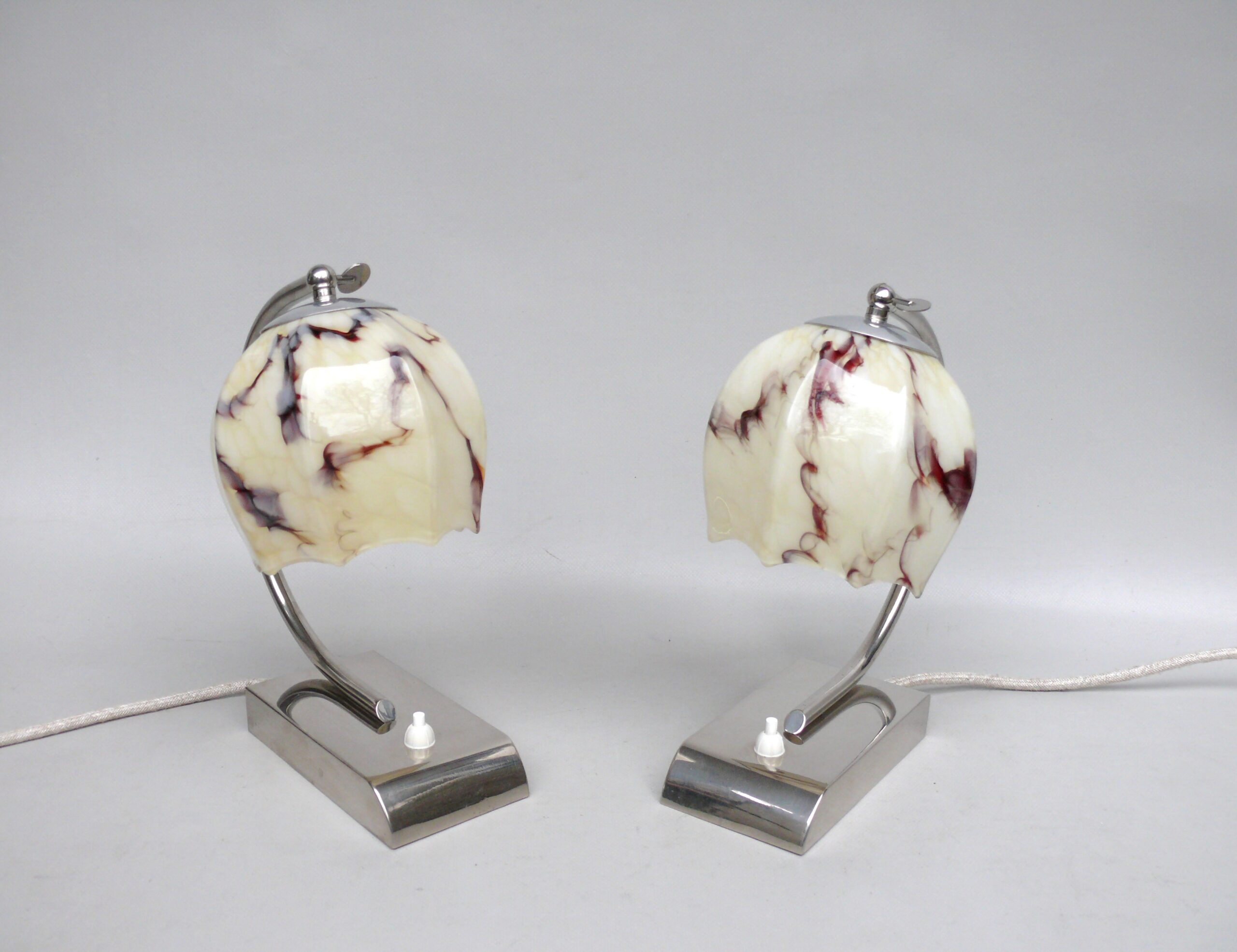 NP1 – 1 paif of bedside lamps, Art Deco, chromed, light beige flashed glass lampshade, extraordinary shape