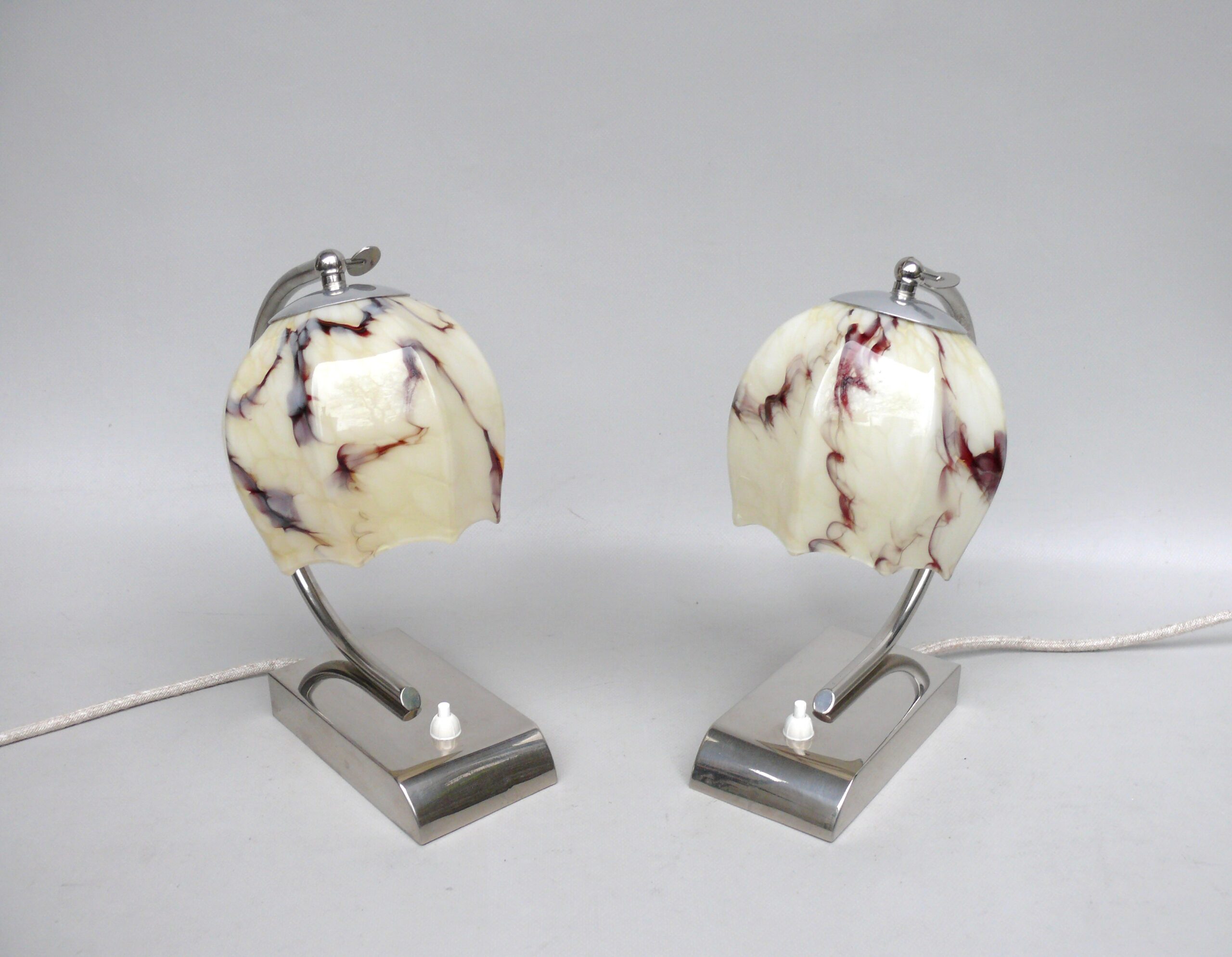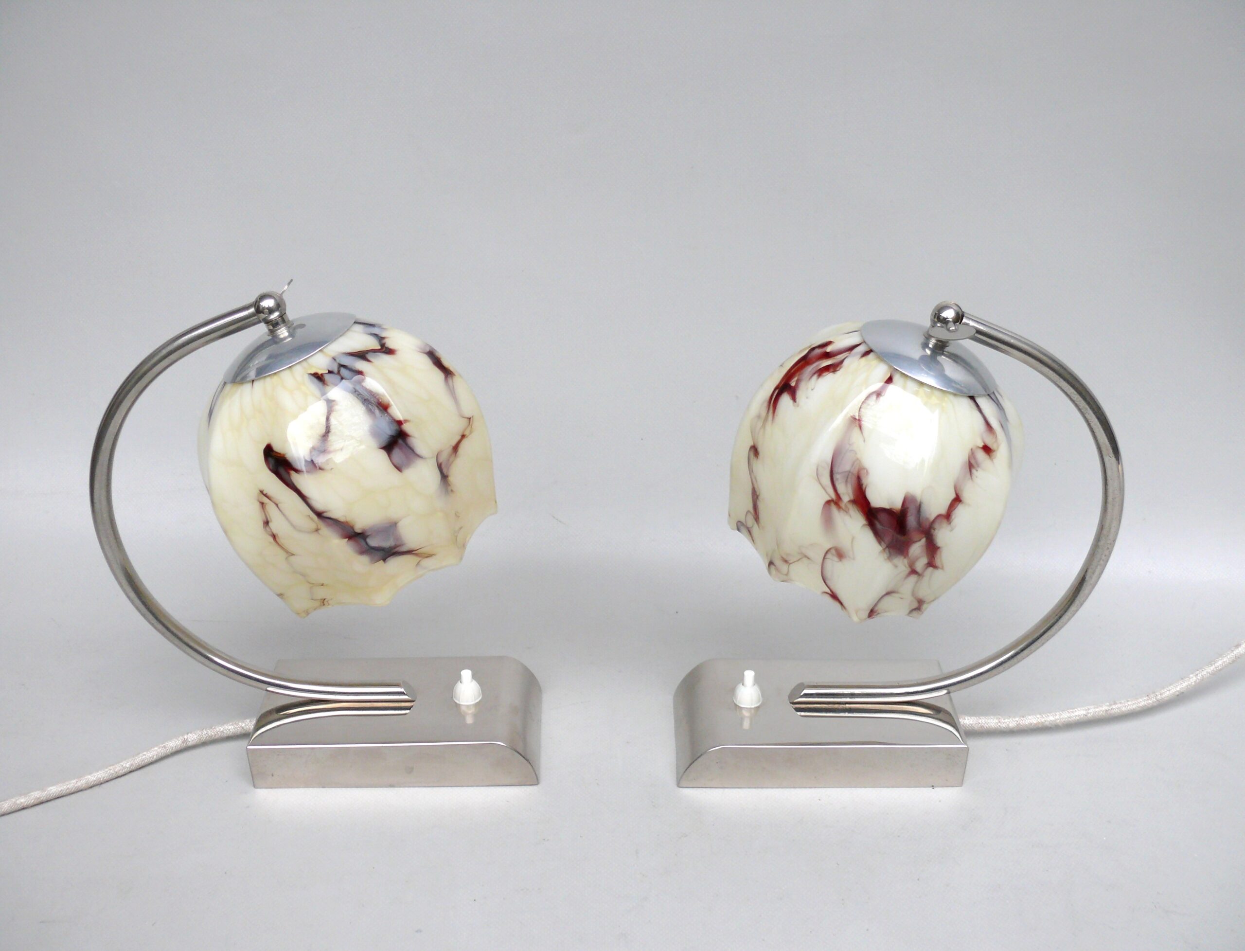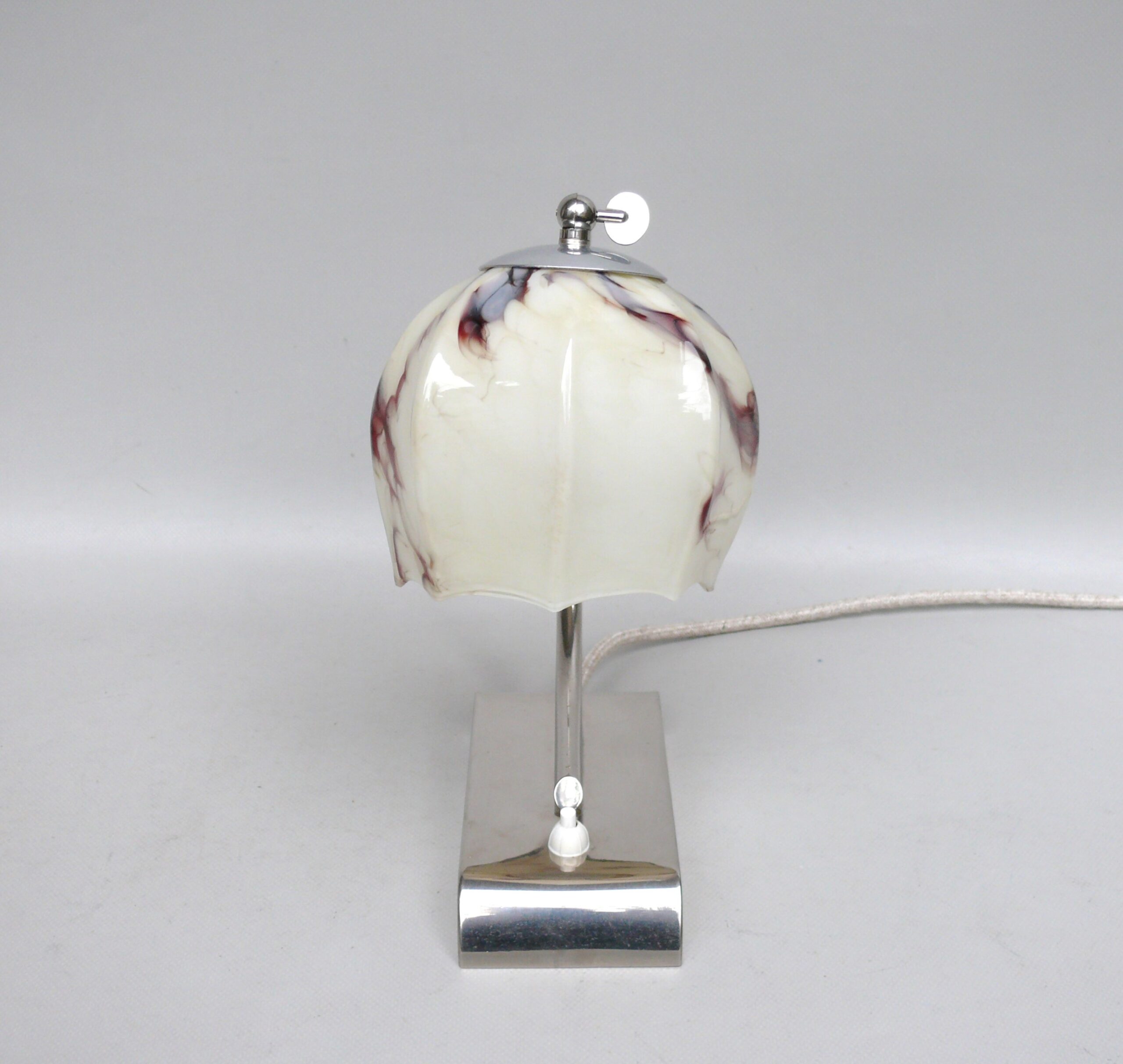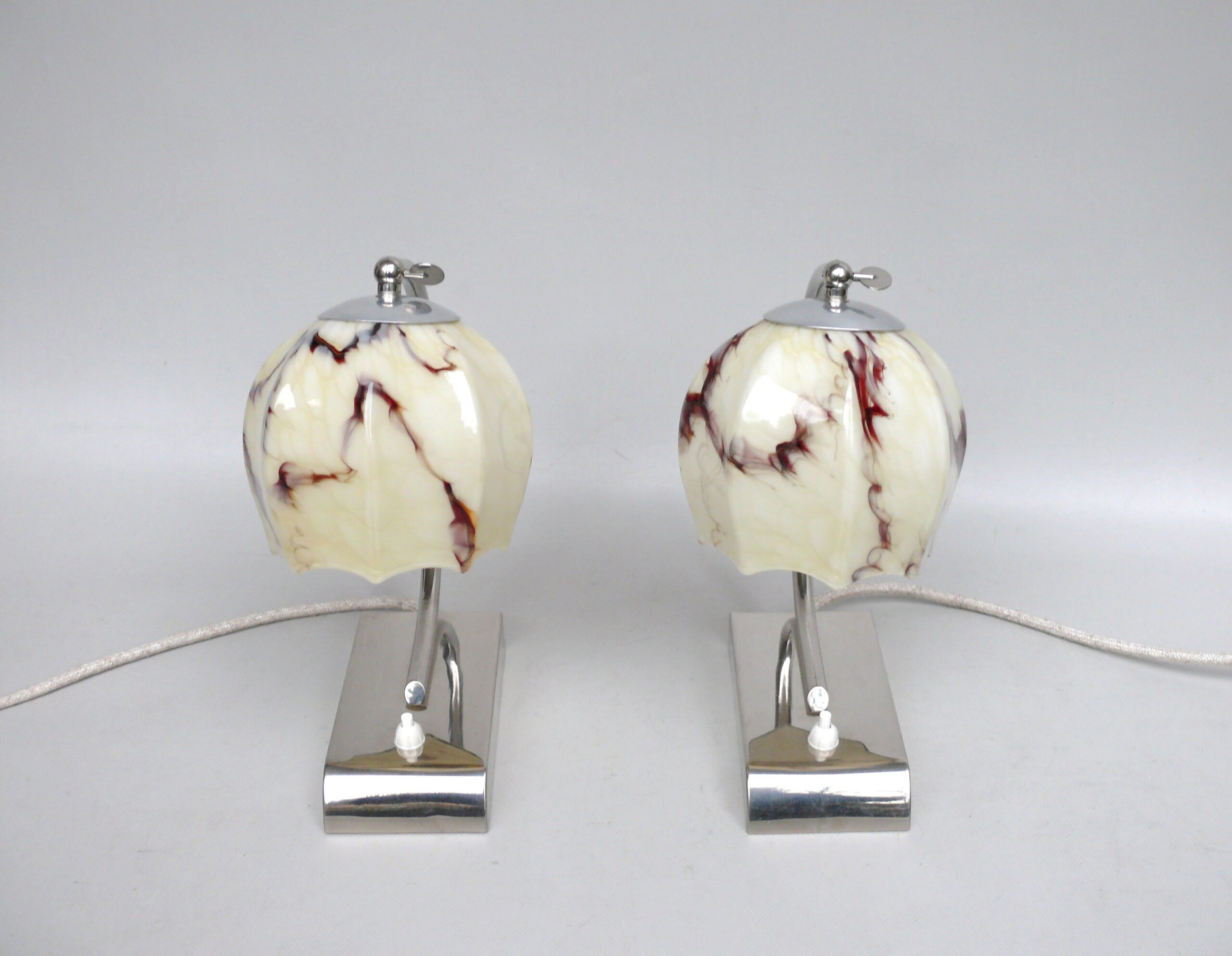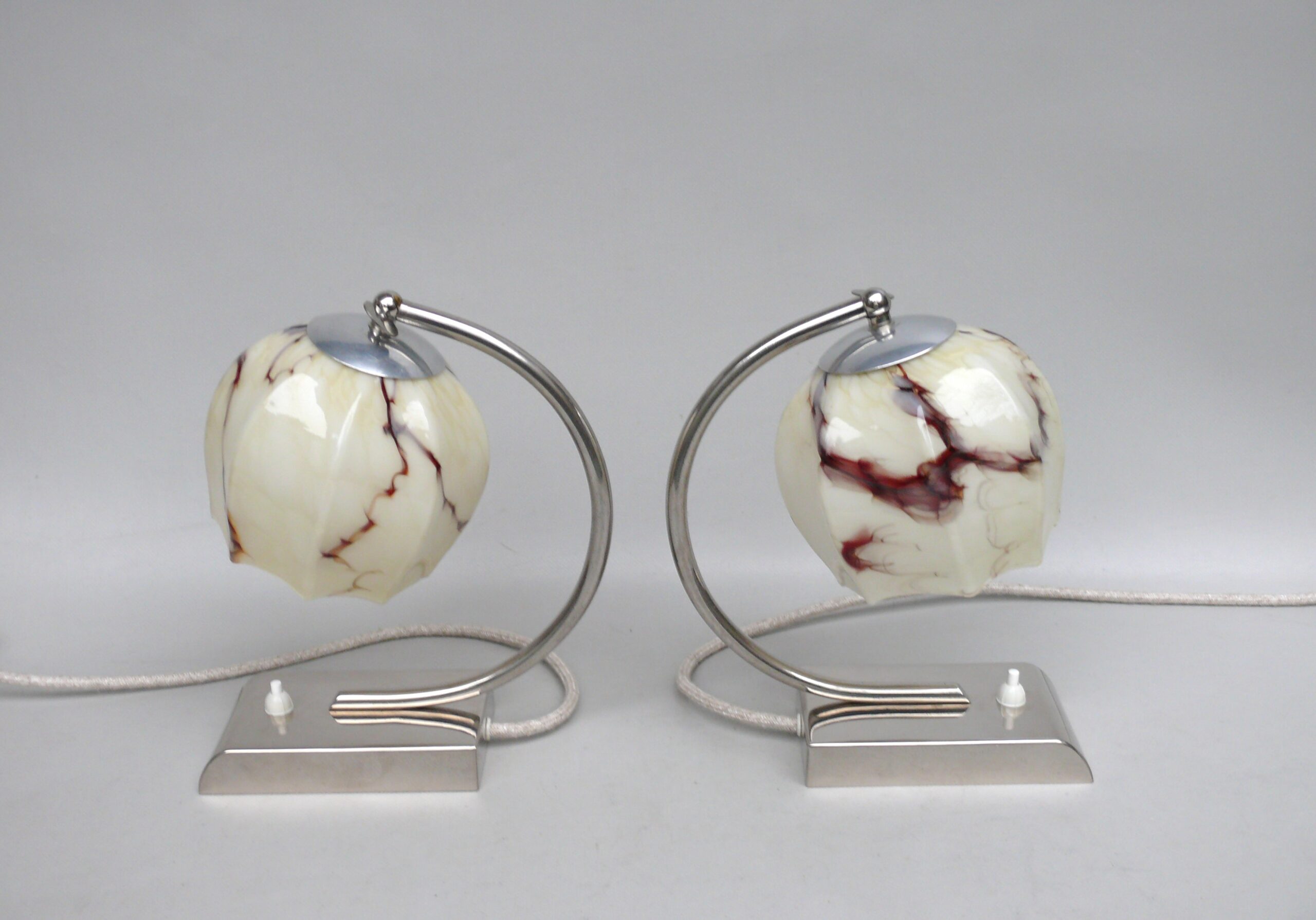 NP1 – 1 paif of bedside lamps, Art Deco, chromed, light beige flashed glass lampshade, extraordinary shape
