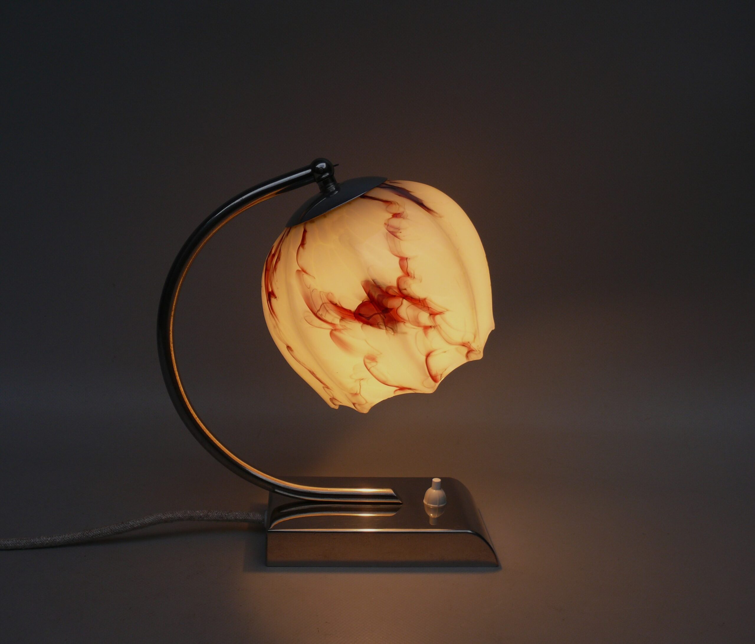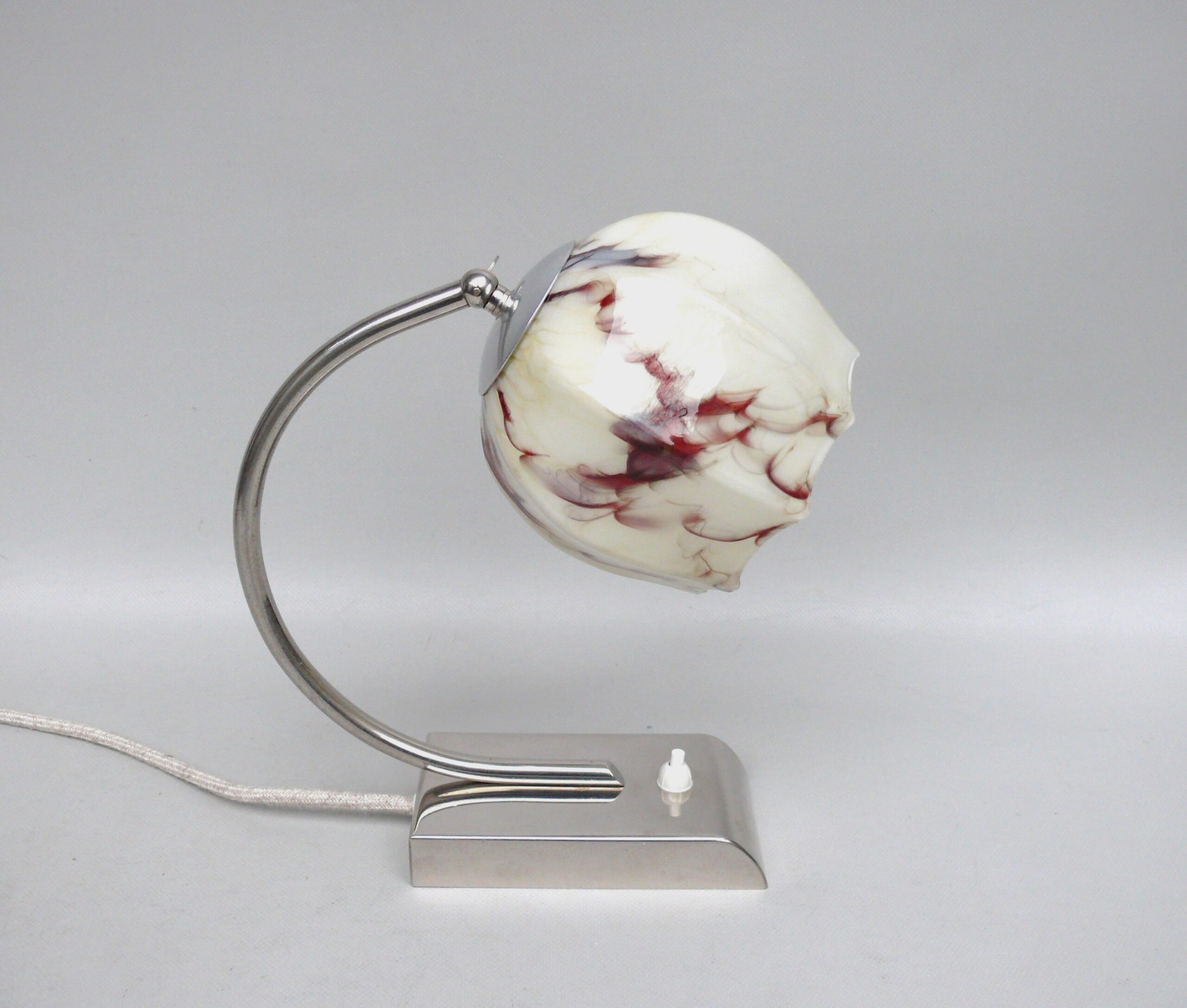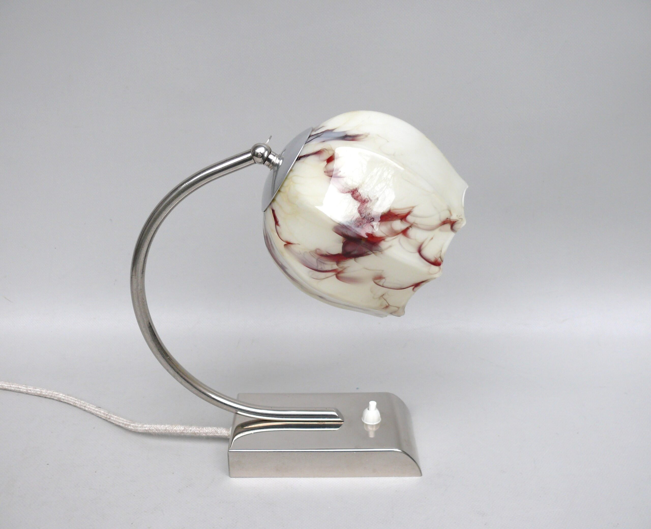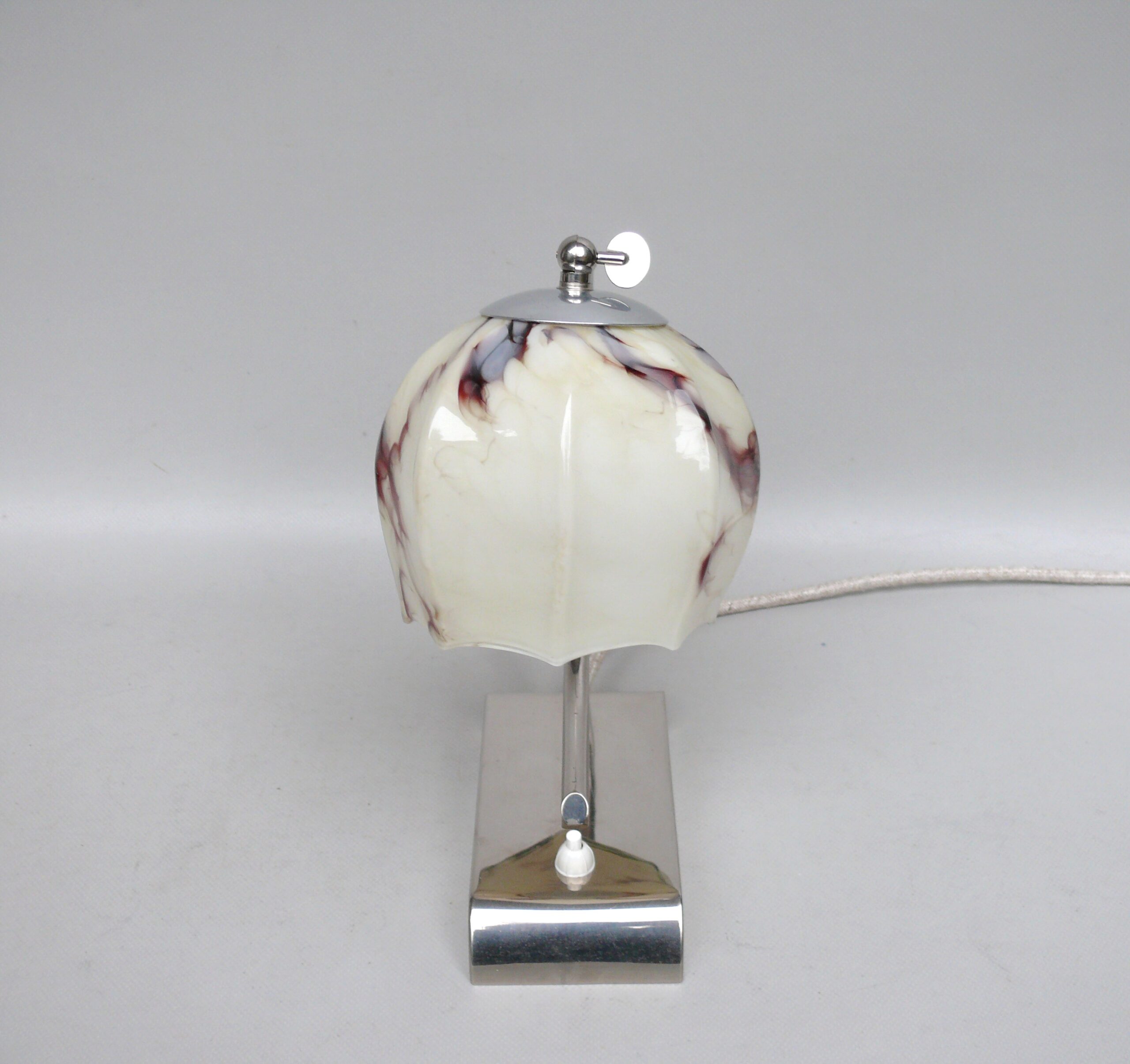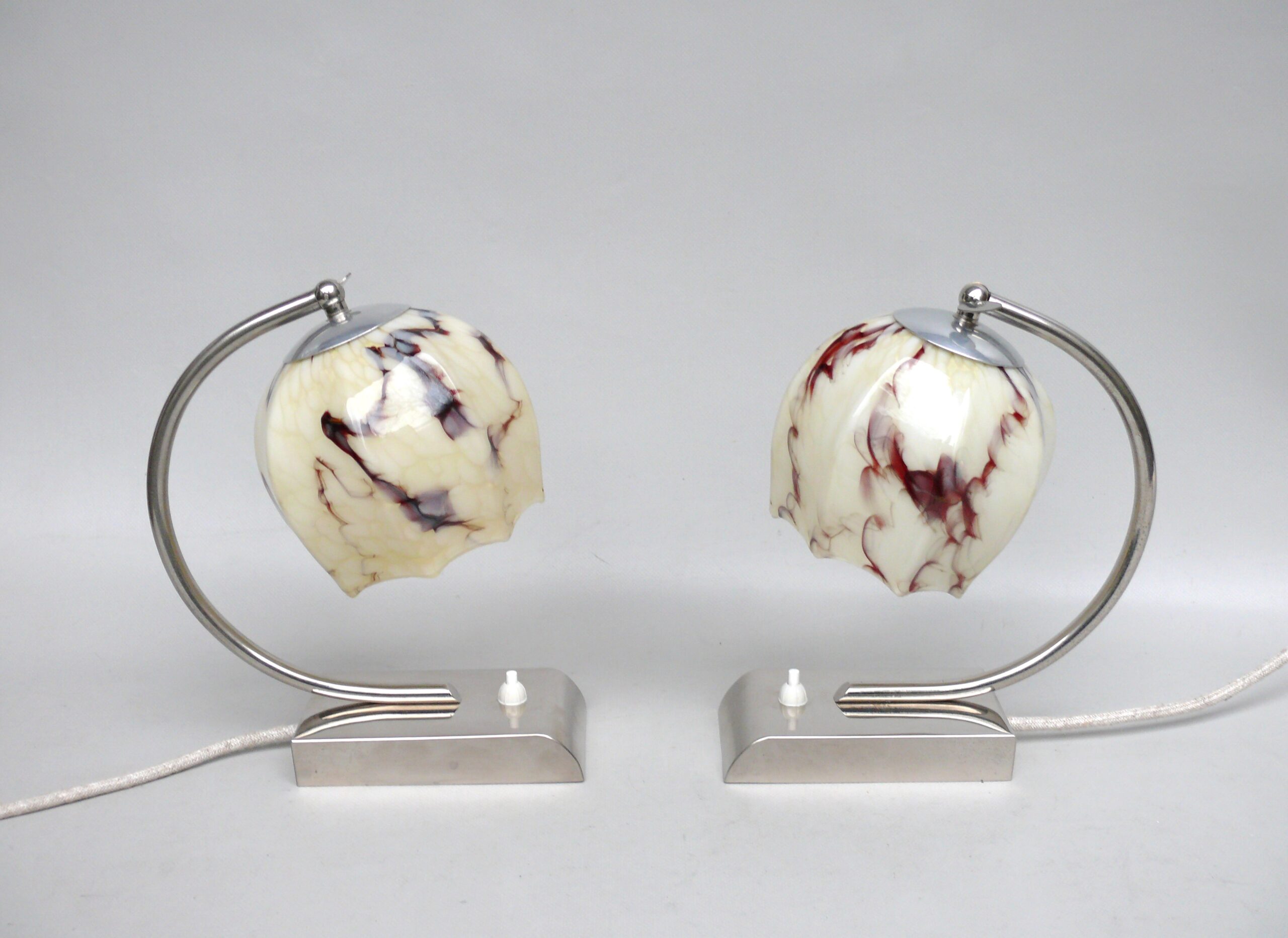 NP1 – 1 paif of bedside lamps, Art Deco, chromed, light beige flashed glass lampshade, extraordinary shape