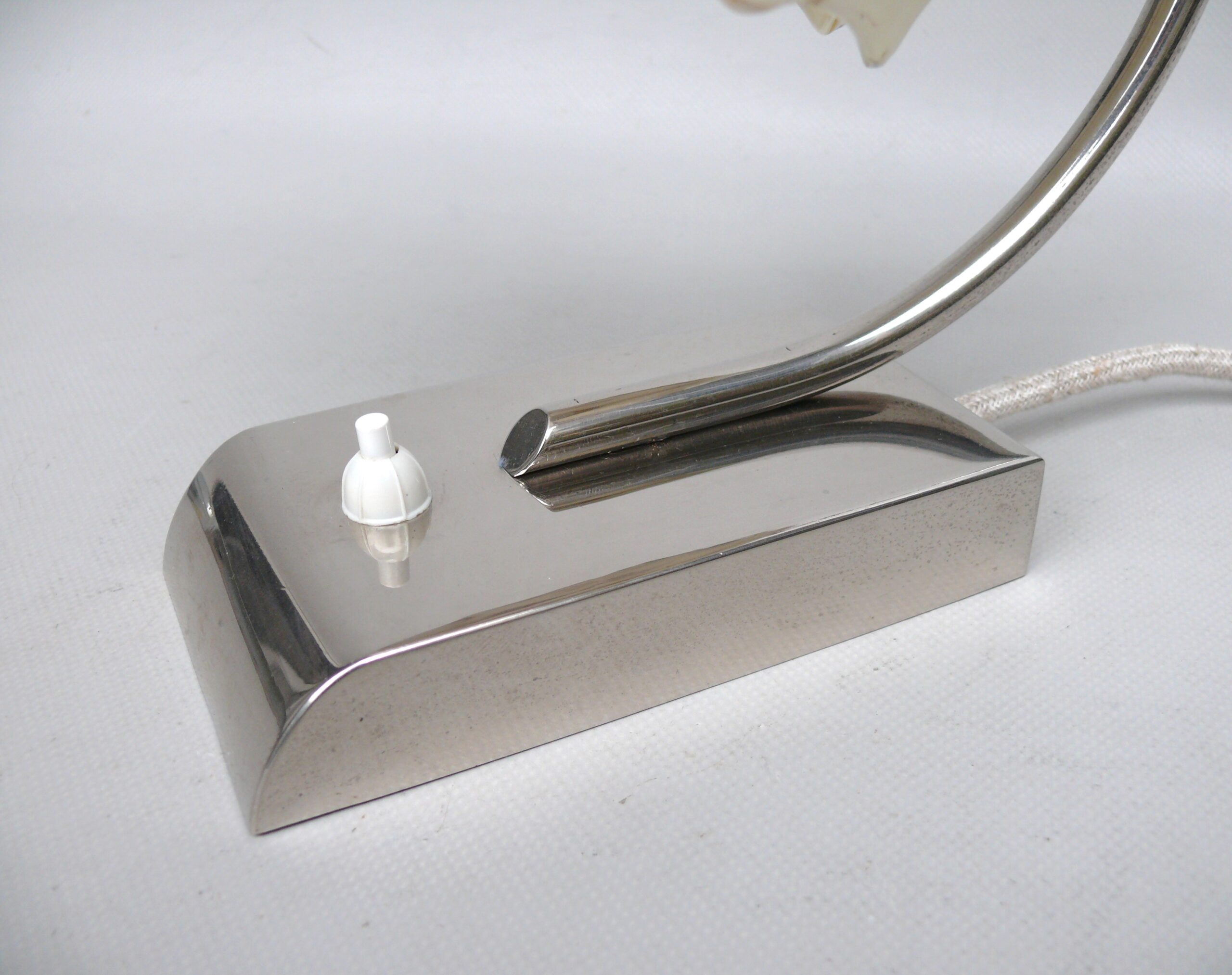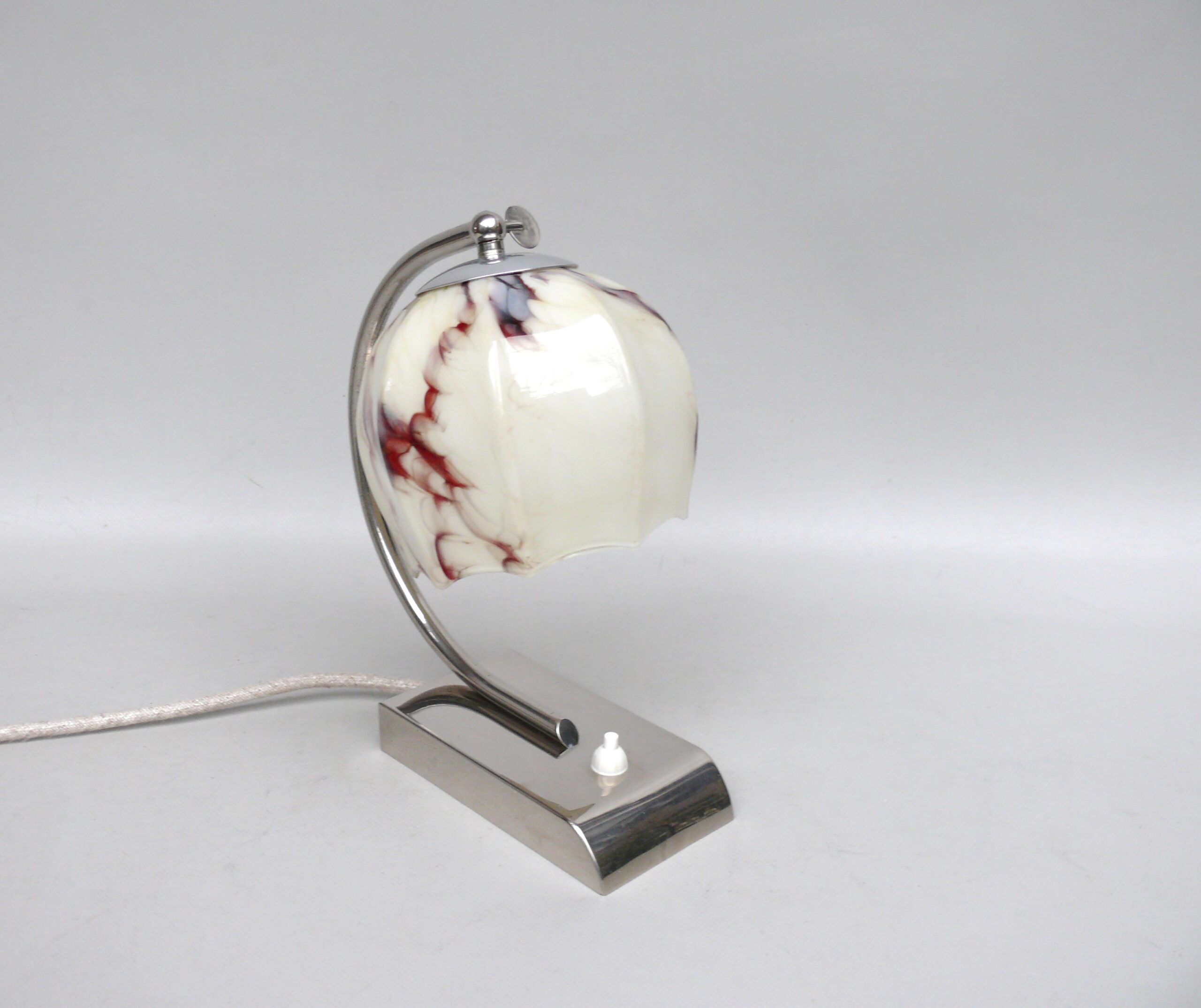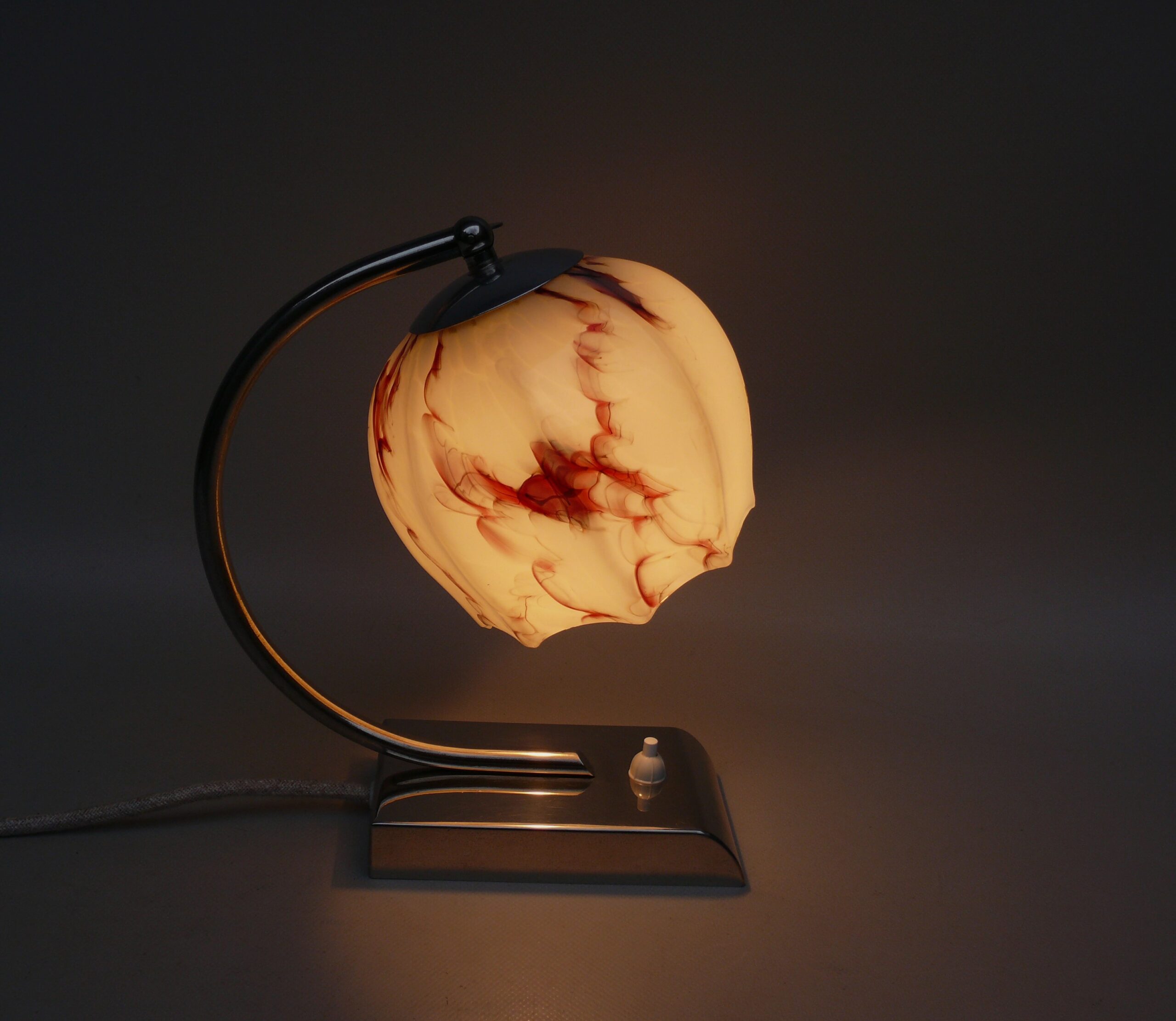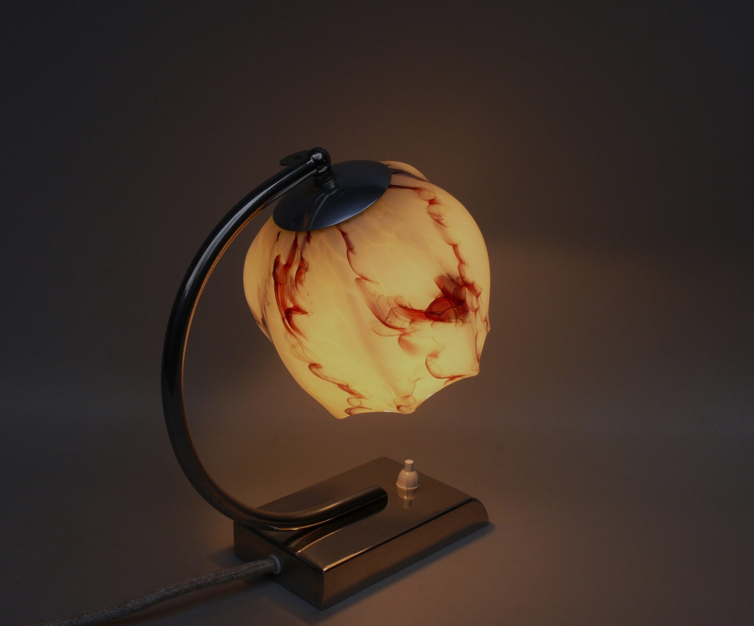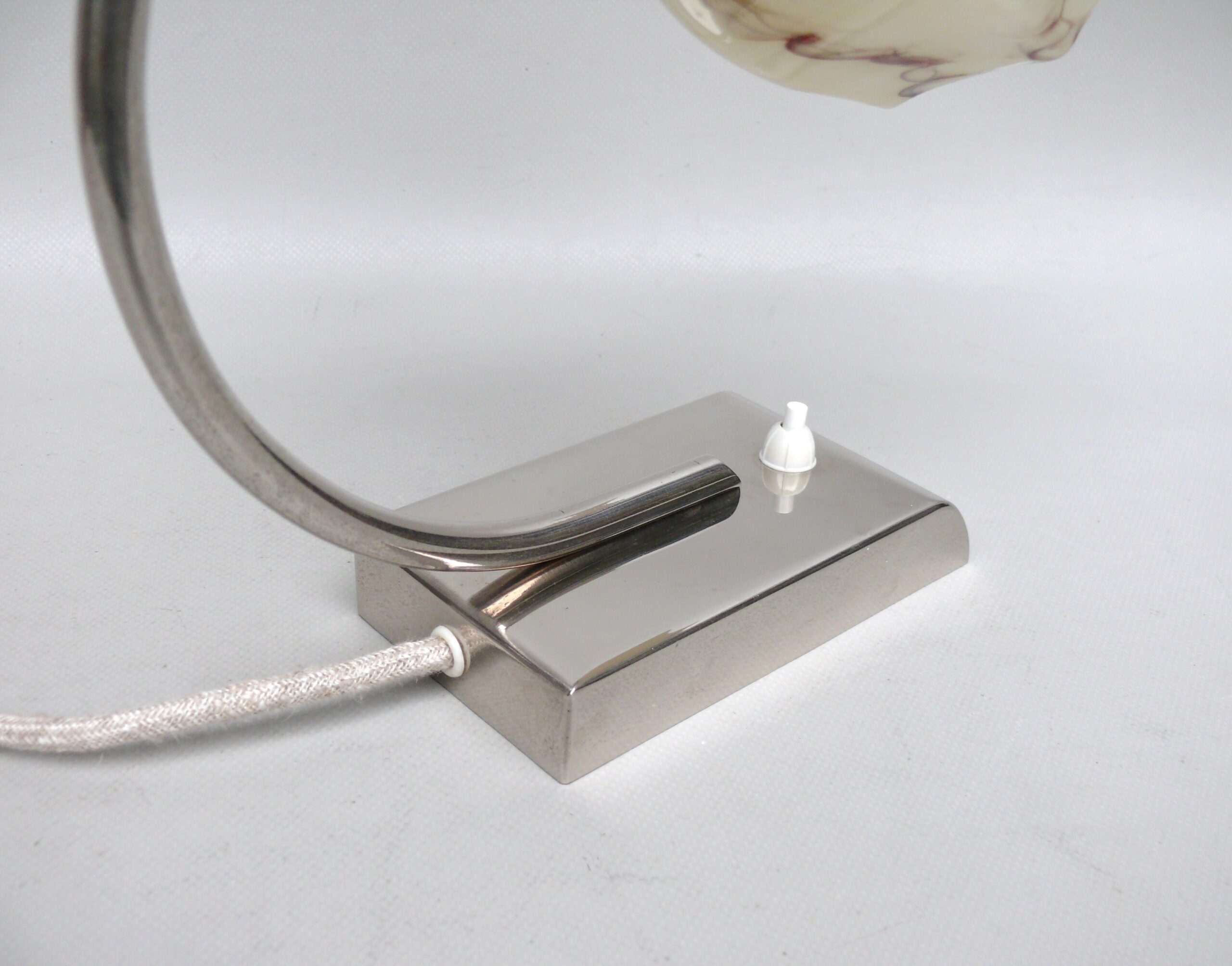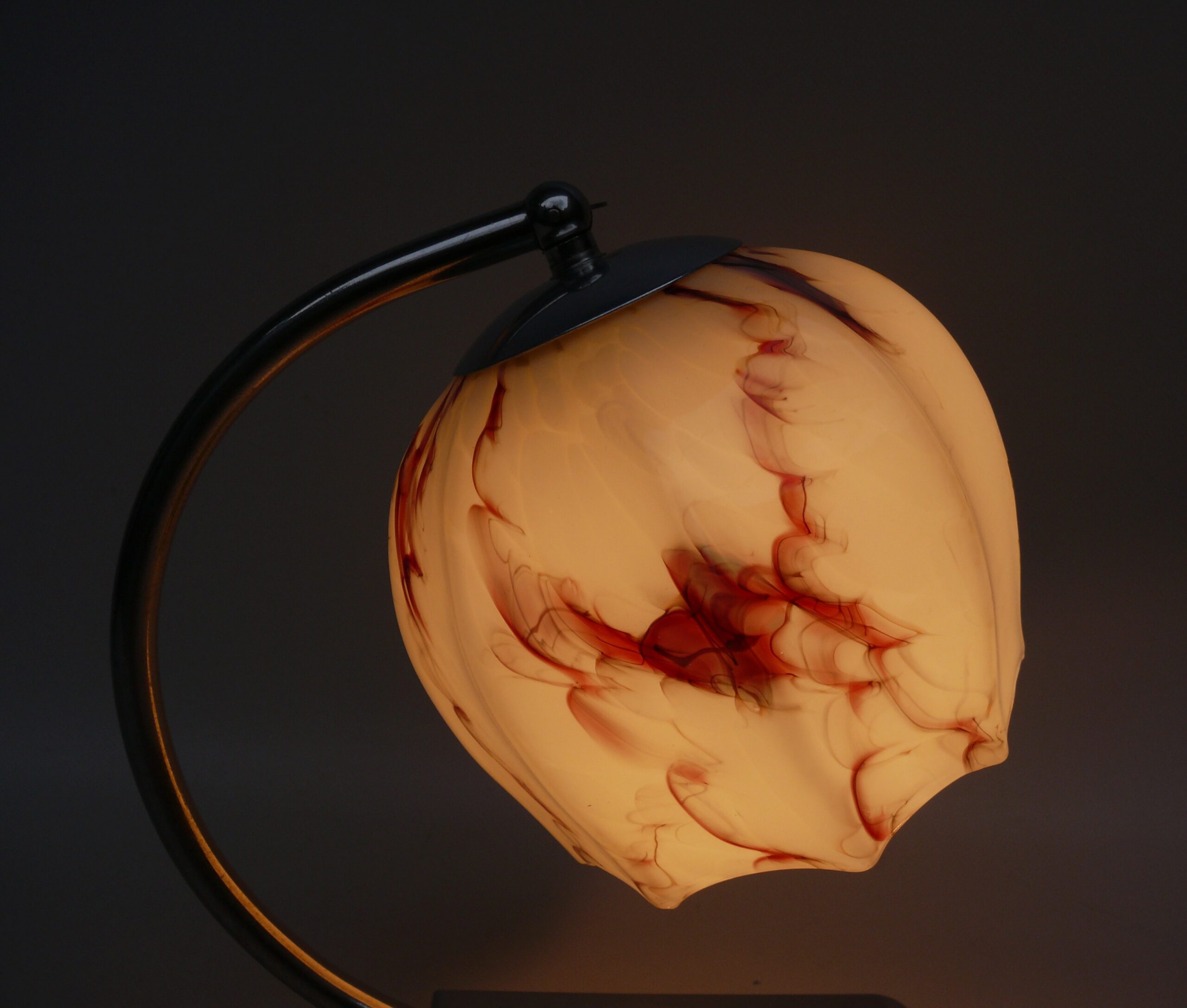NP1 – 1 paif of bedside lamps, Art Deco, chromed, light beige flashed glass lampshade, extraordinary shape