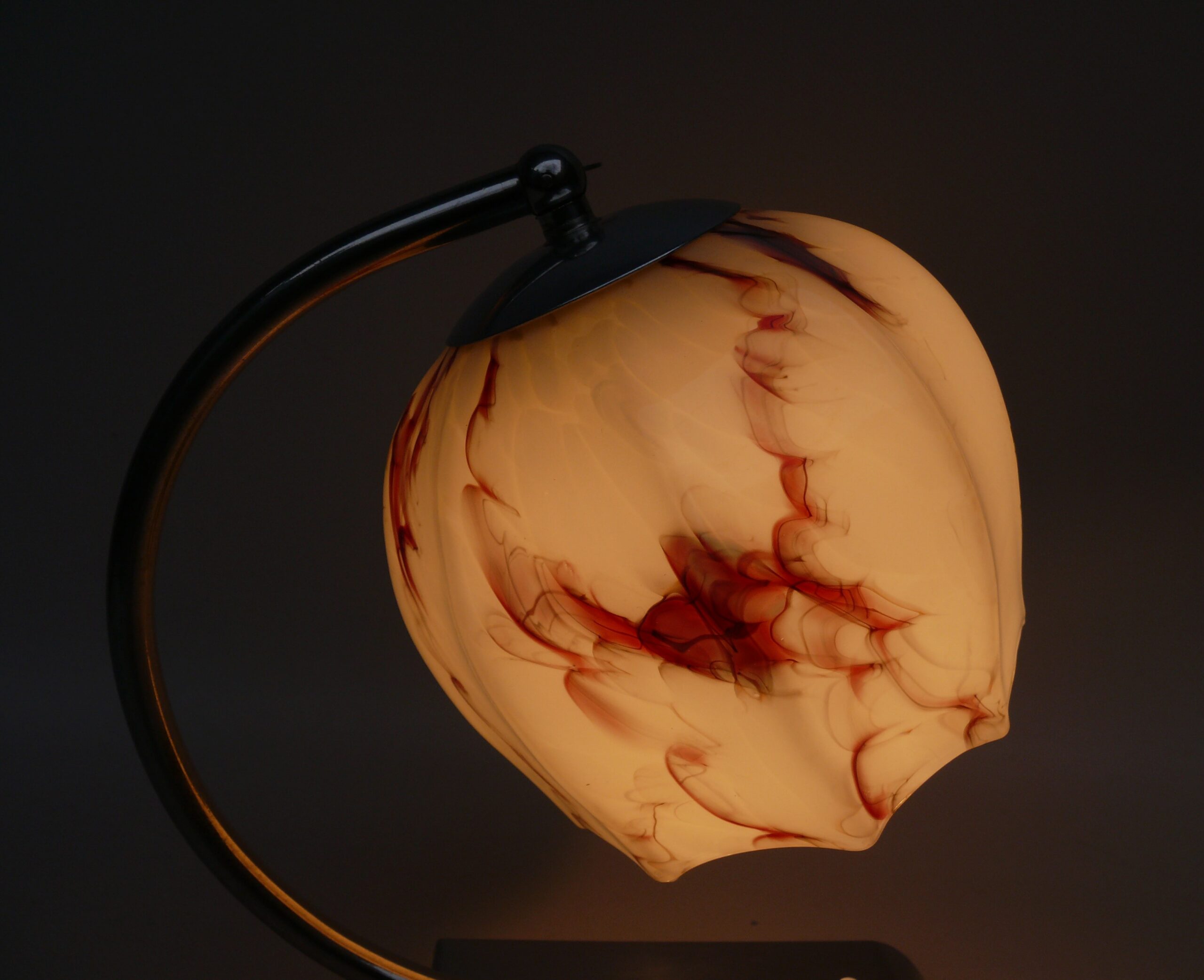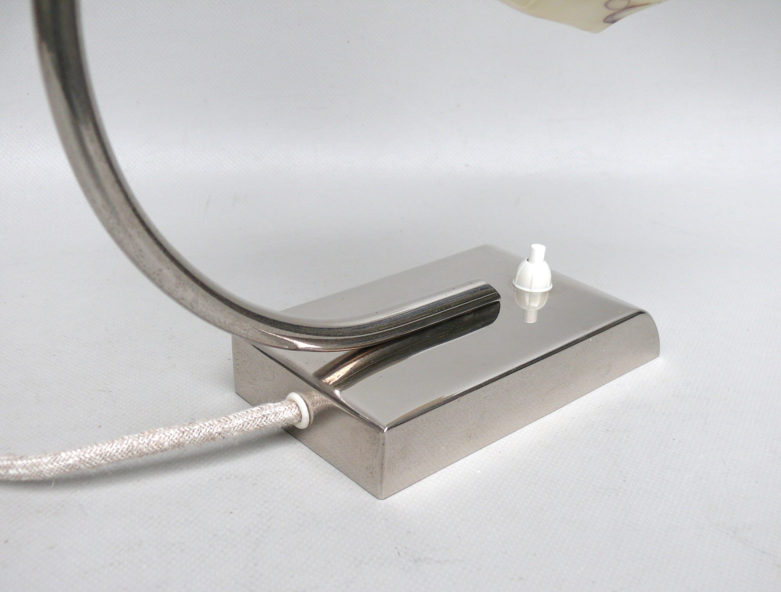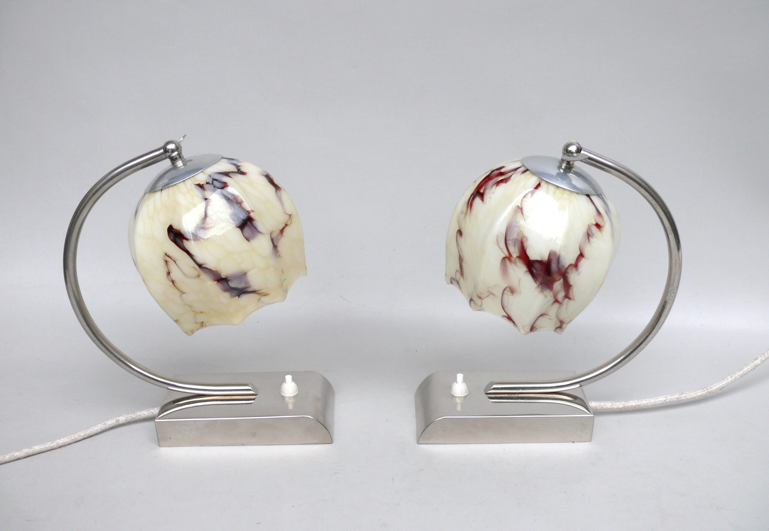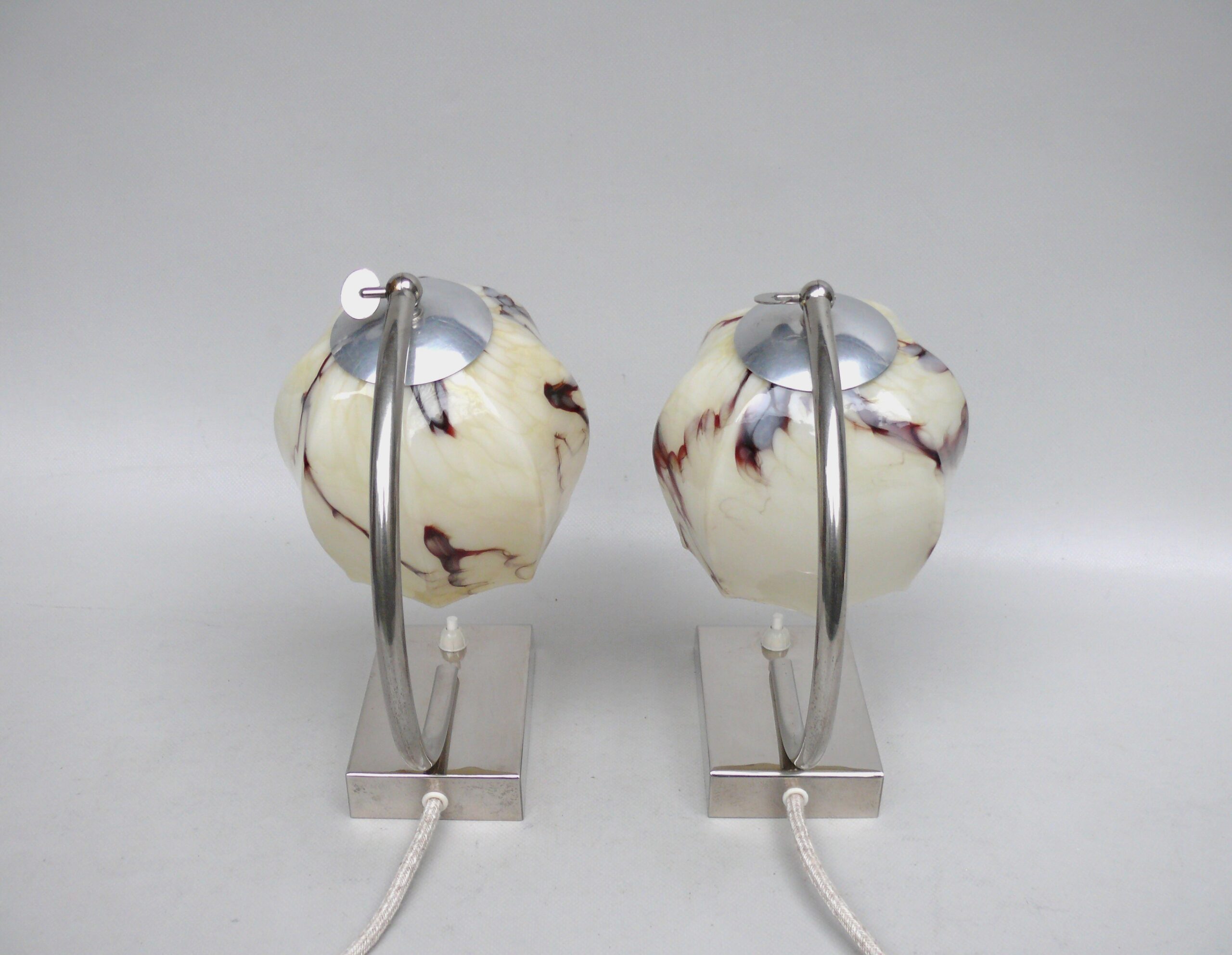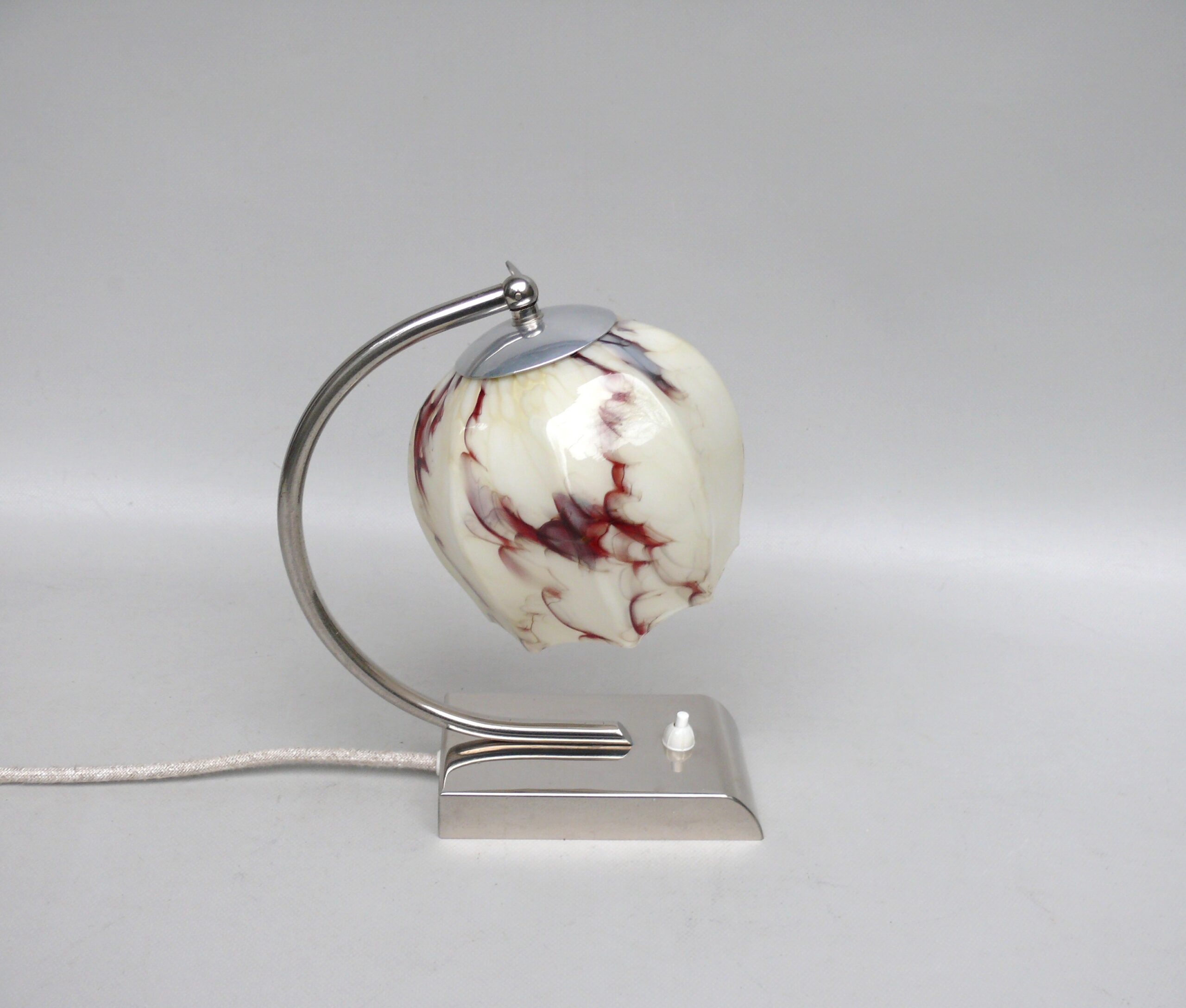 NP1 – 1 paif of bedside lamps, Art Deco, chromed, light beige flashed glass lampshade, extraordinary shape
