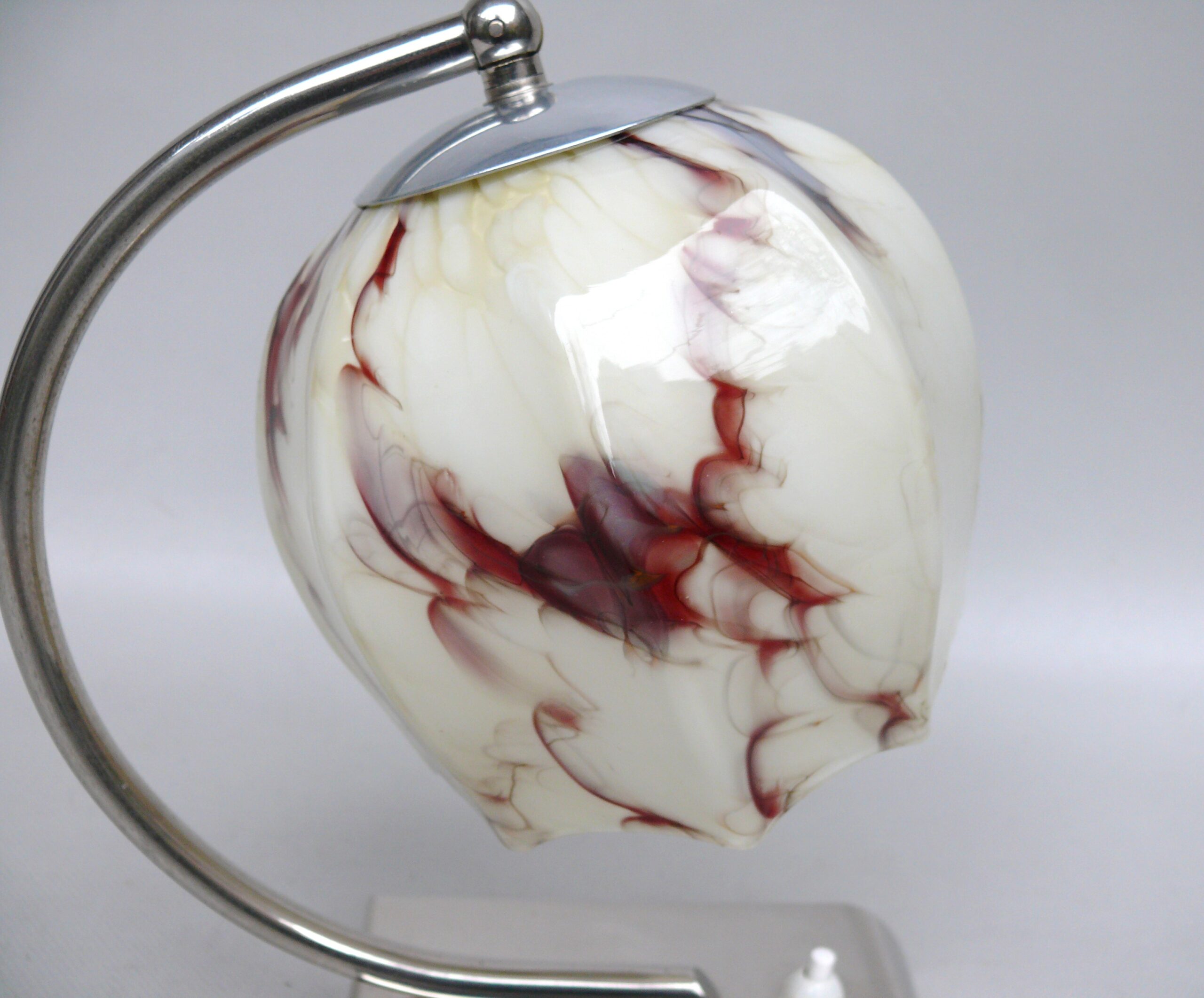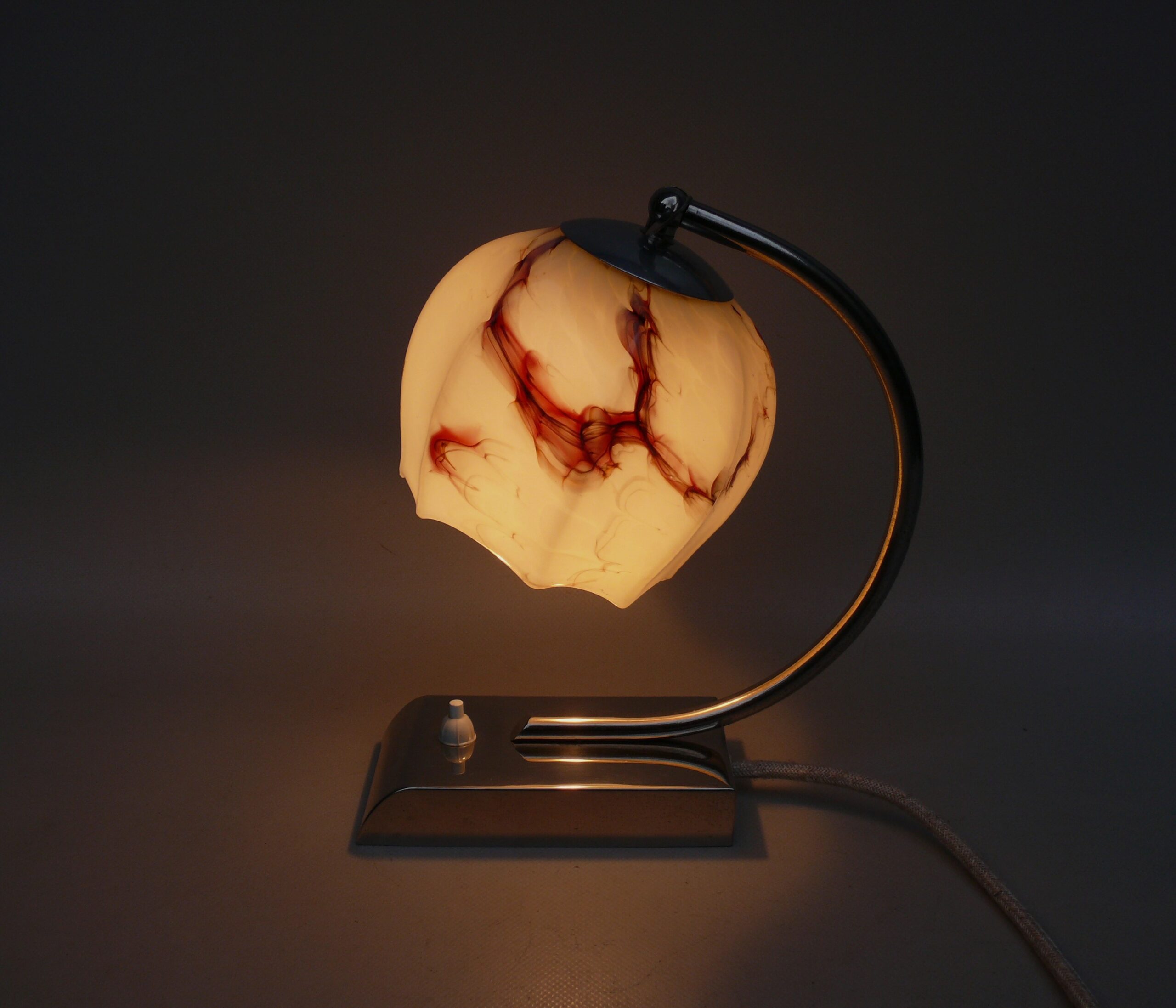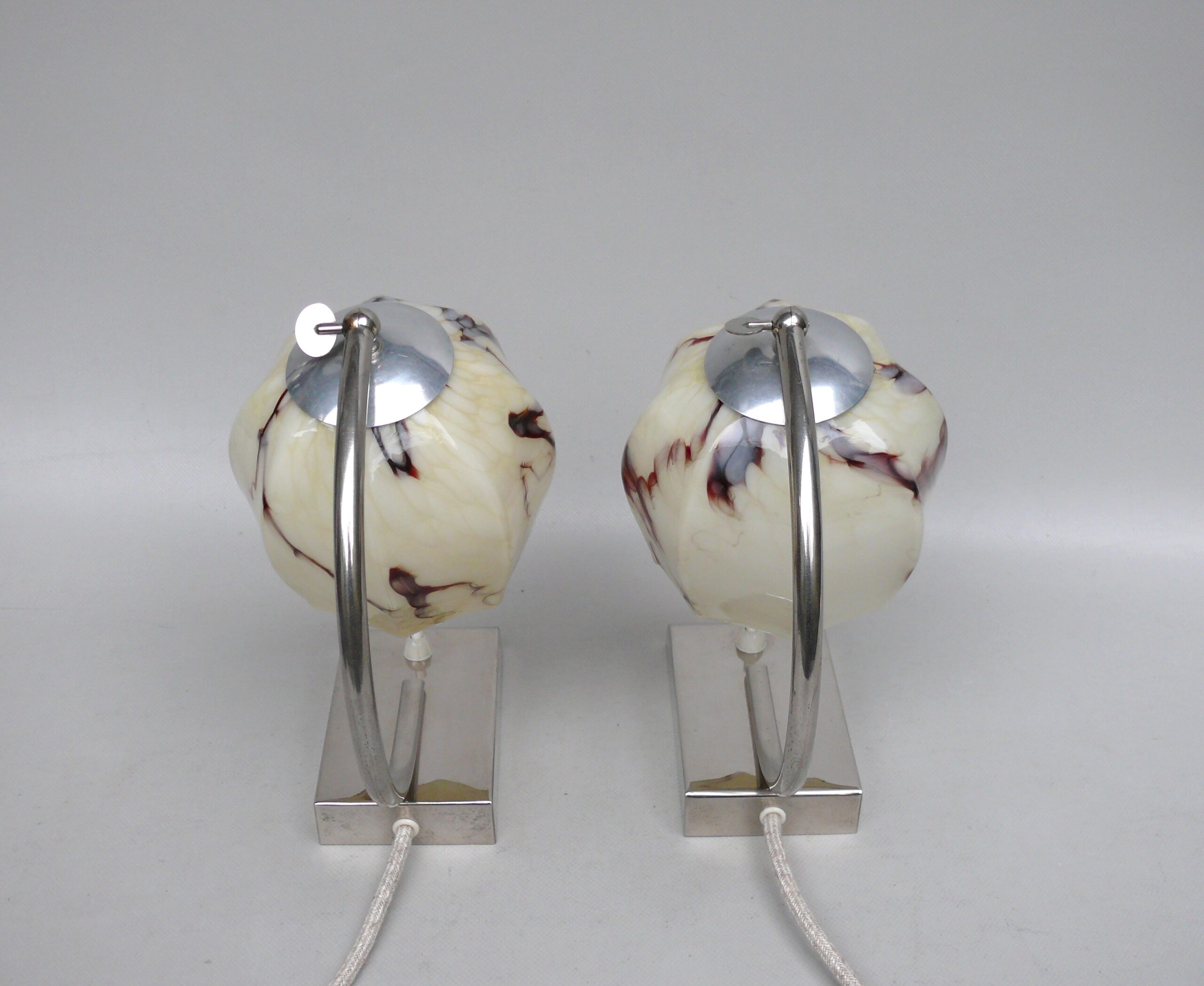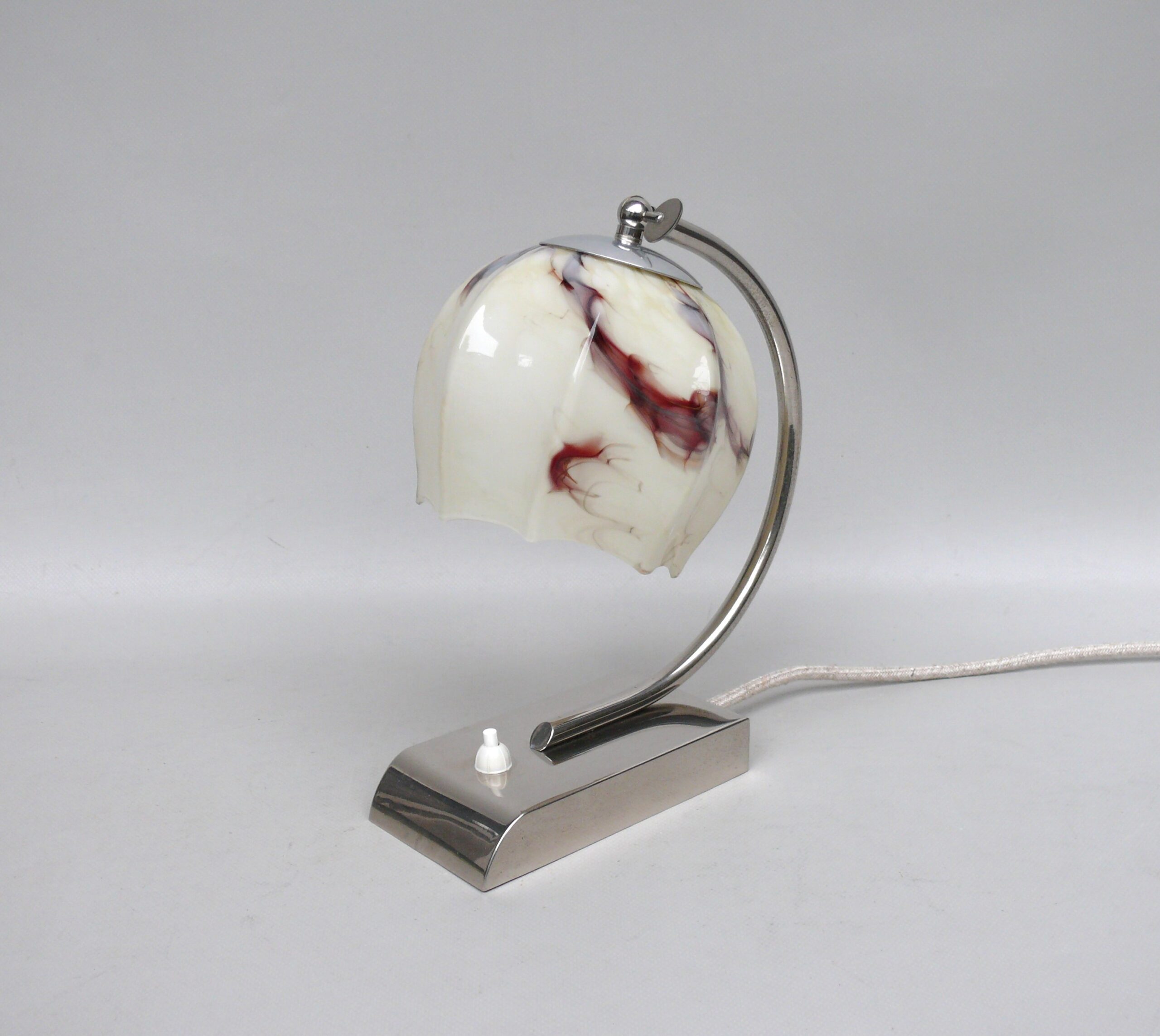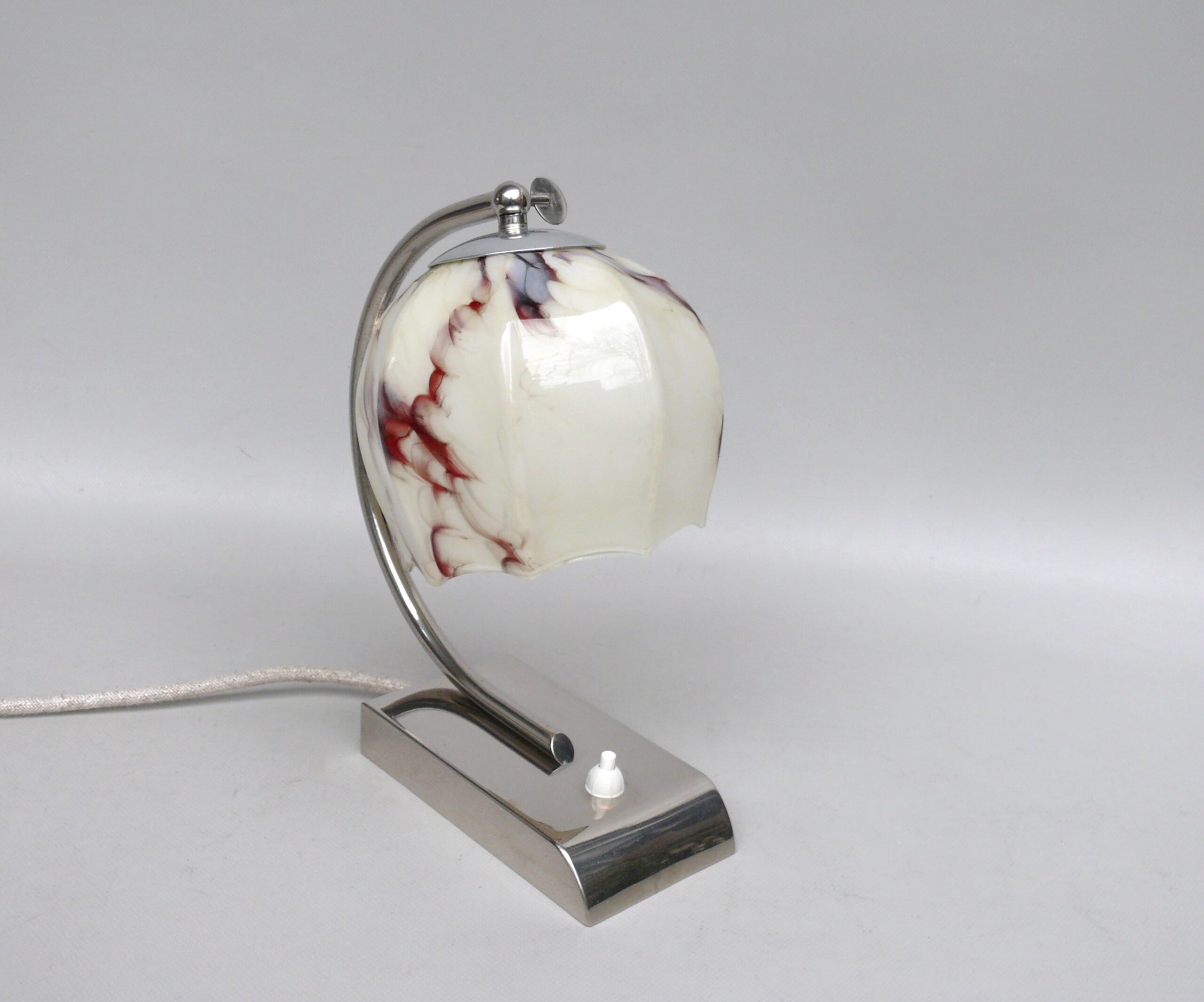 NP1 – 1 paif of bedside lamps, Art Deco, chromed, light beige flashed glass lampshade, extraordinary shape