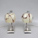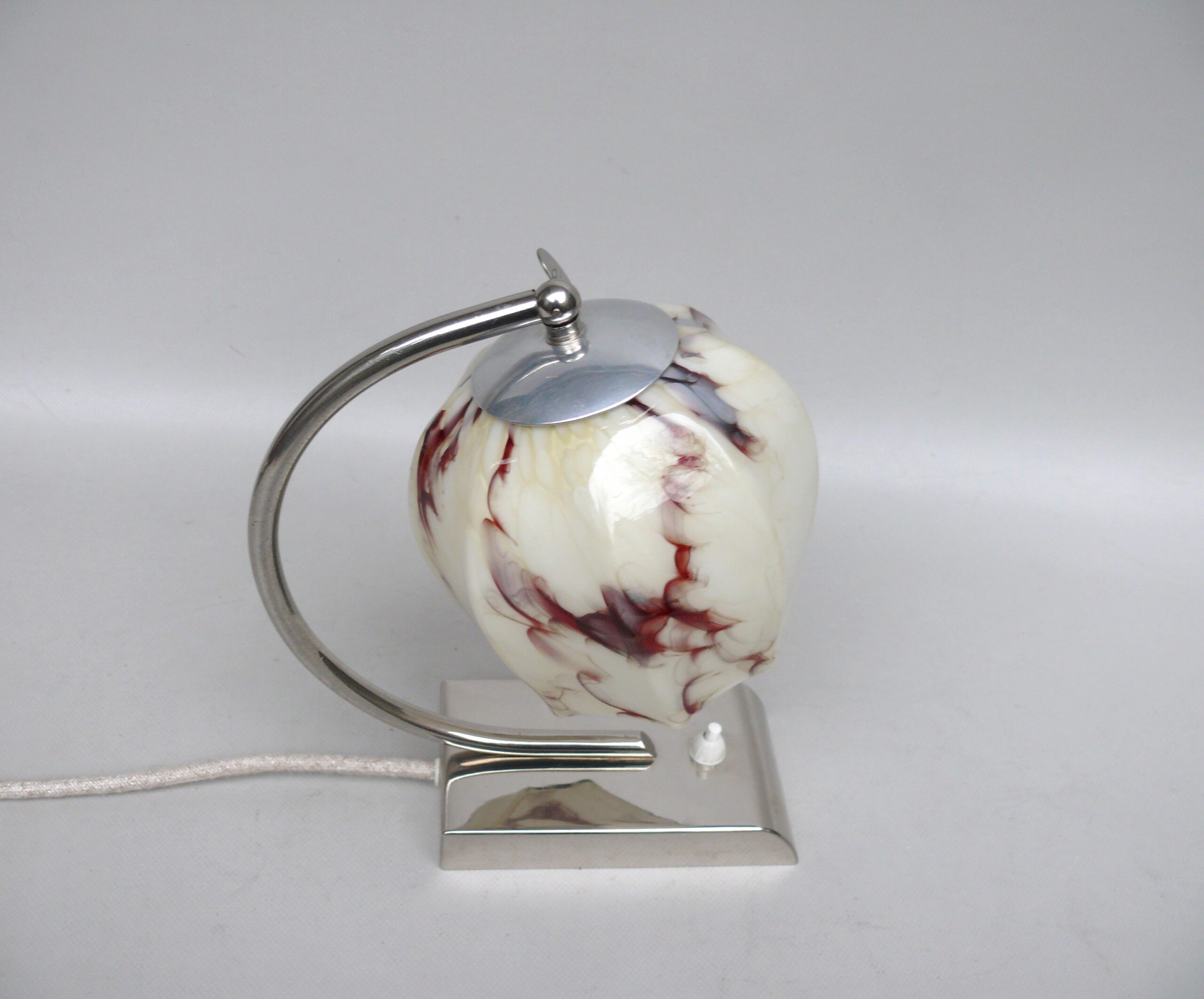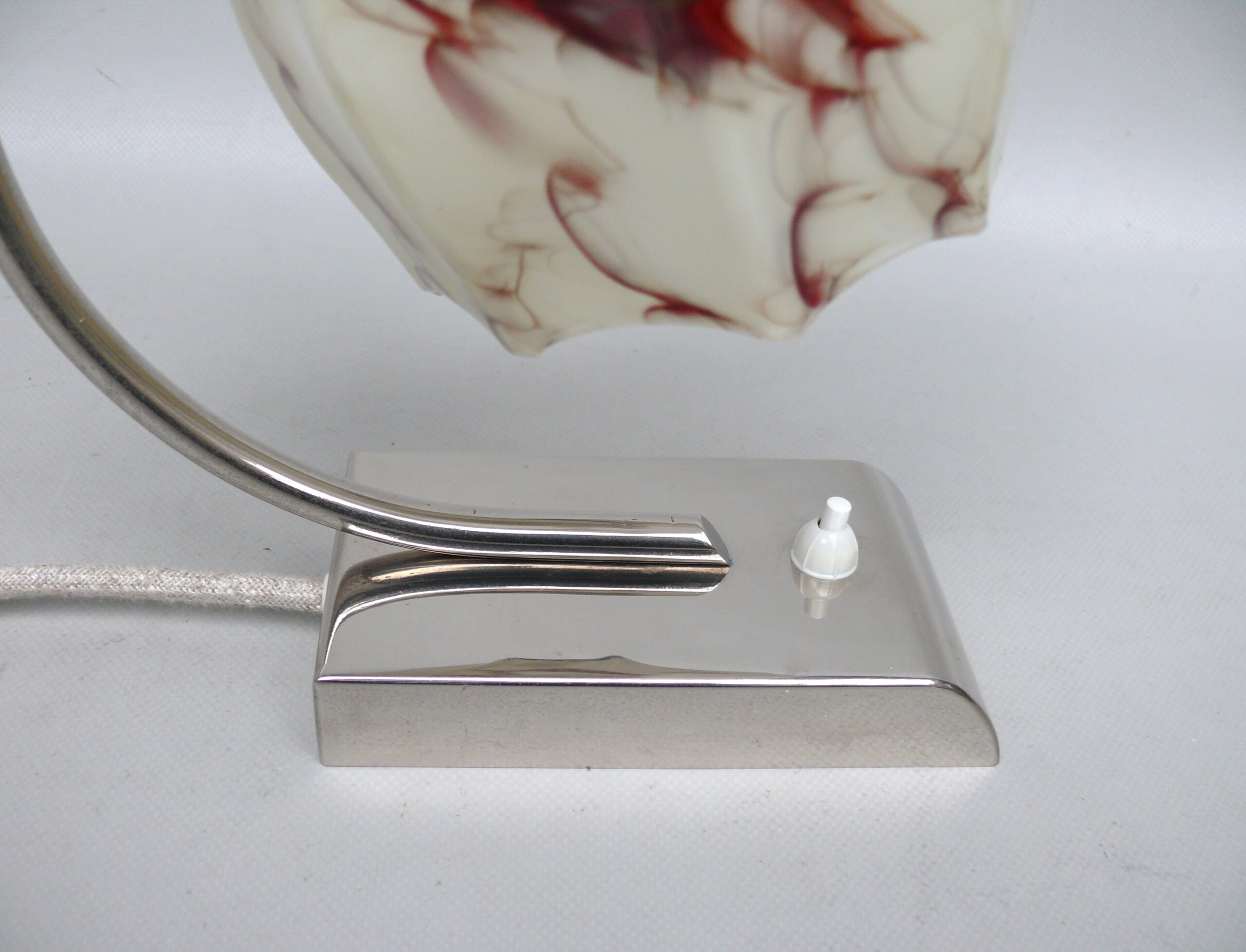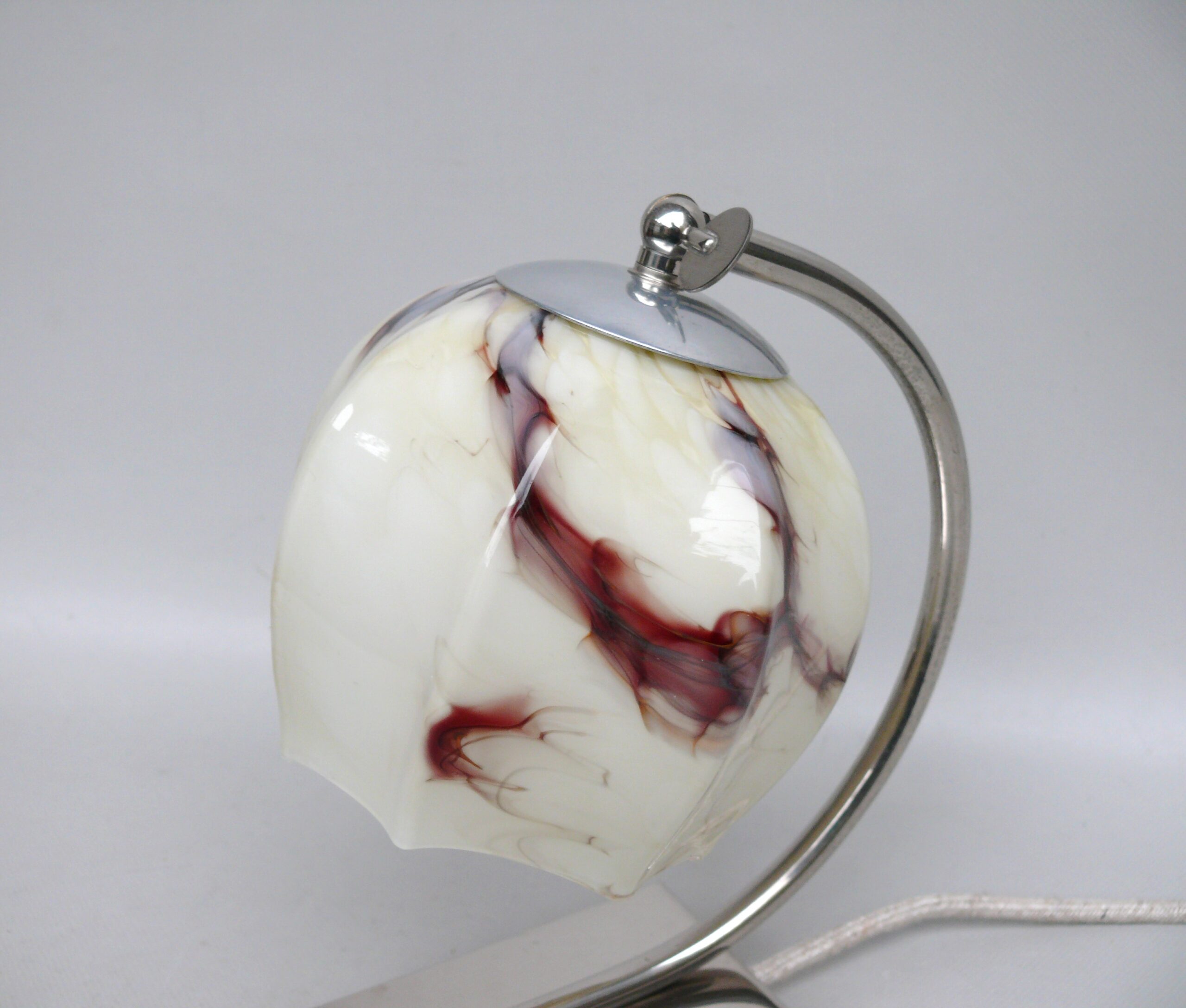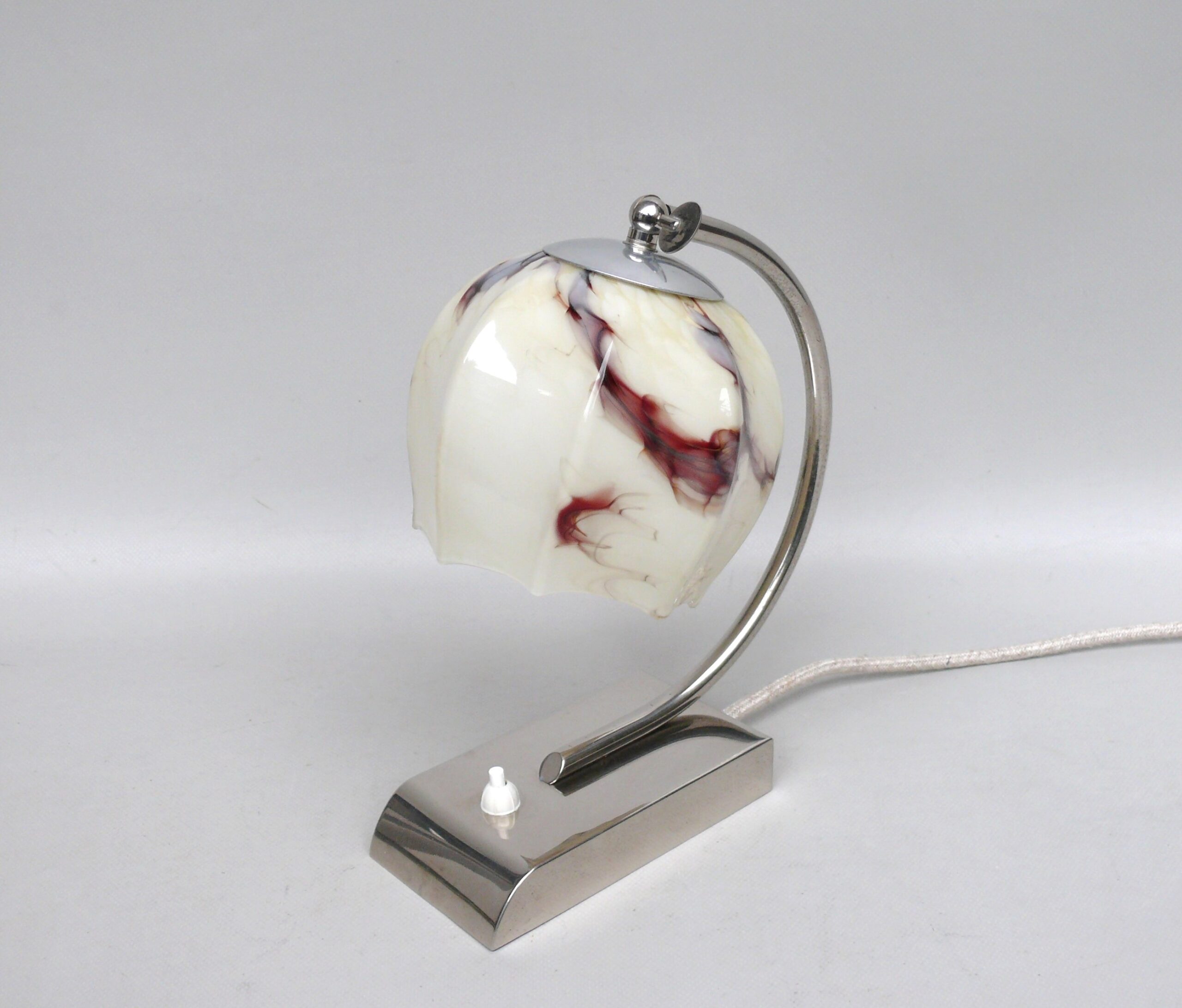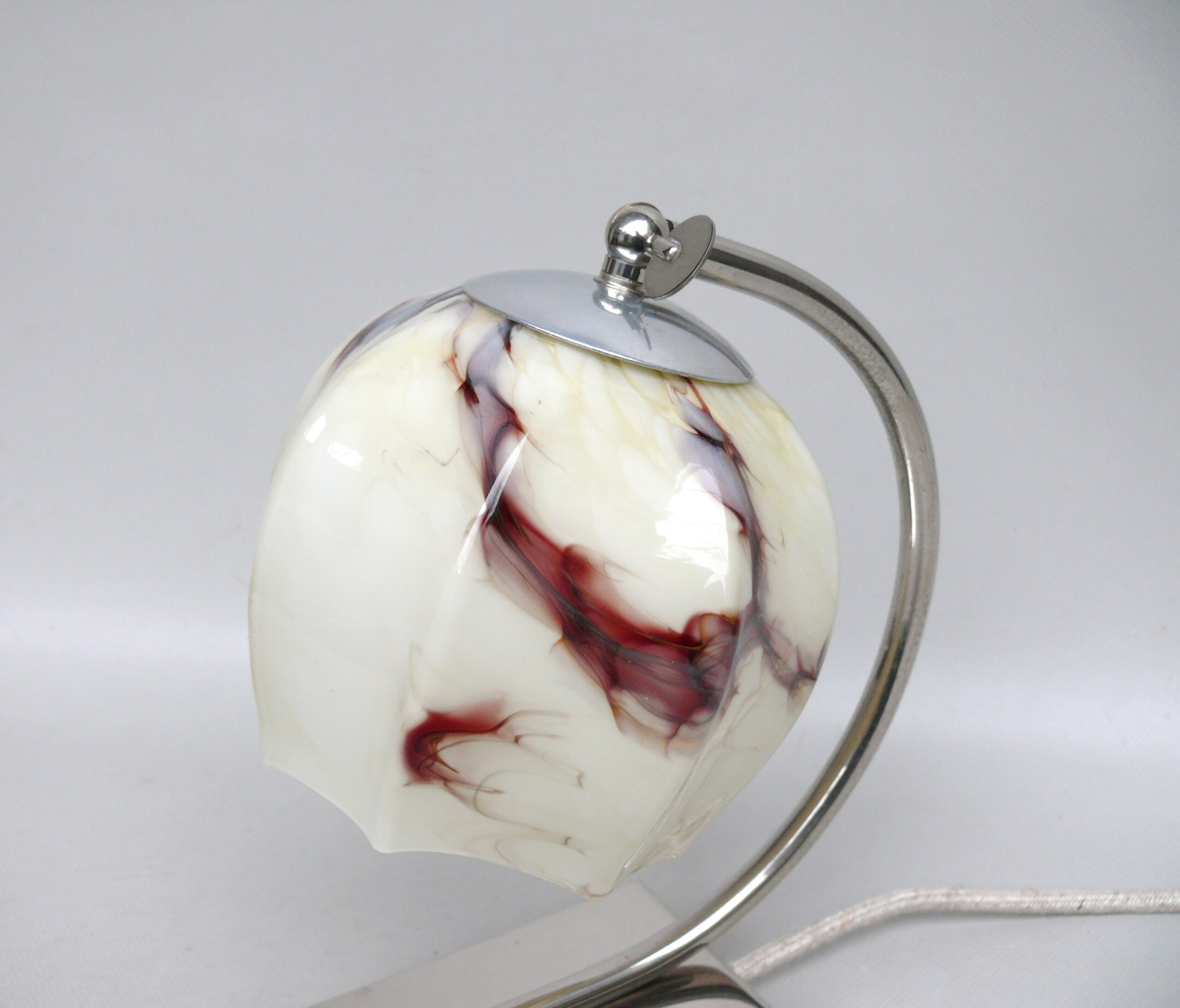 NP1 – 1 paif of bedside lamps, Art Deco, chromed, light beige flashed glass lampshade, extraordinary shape