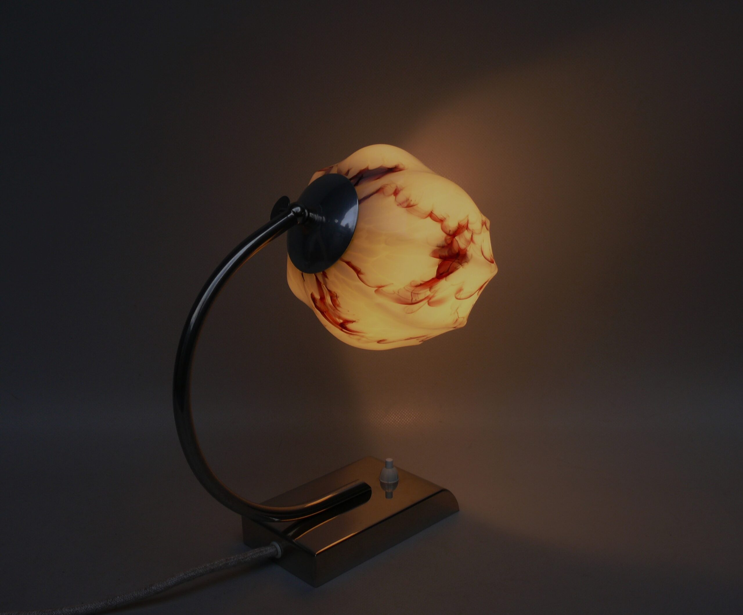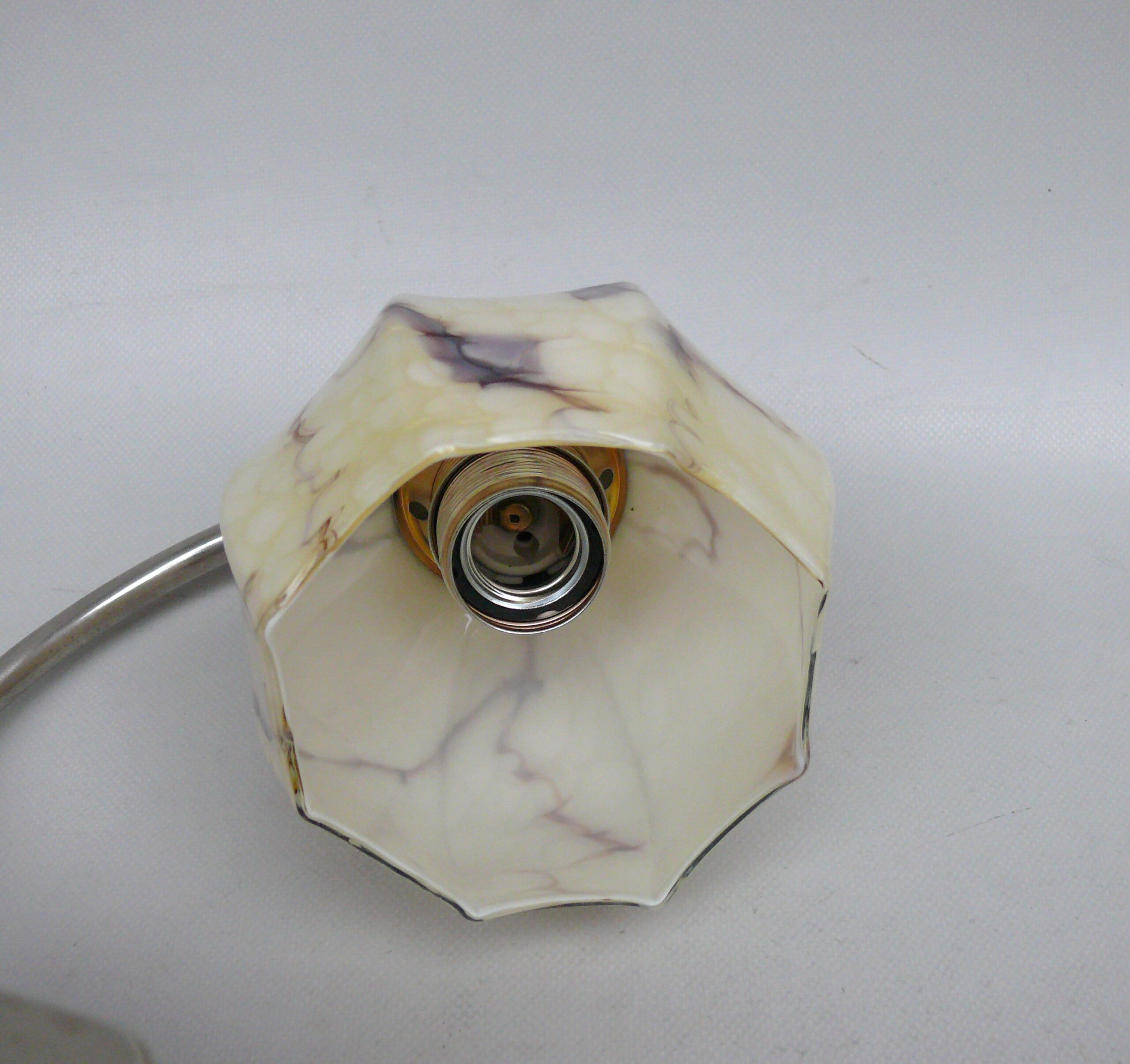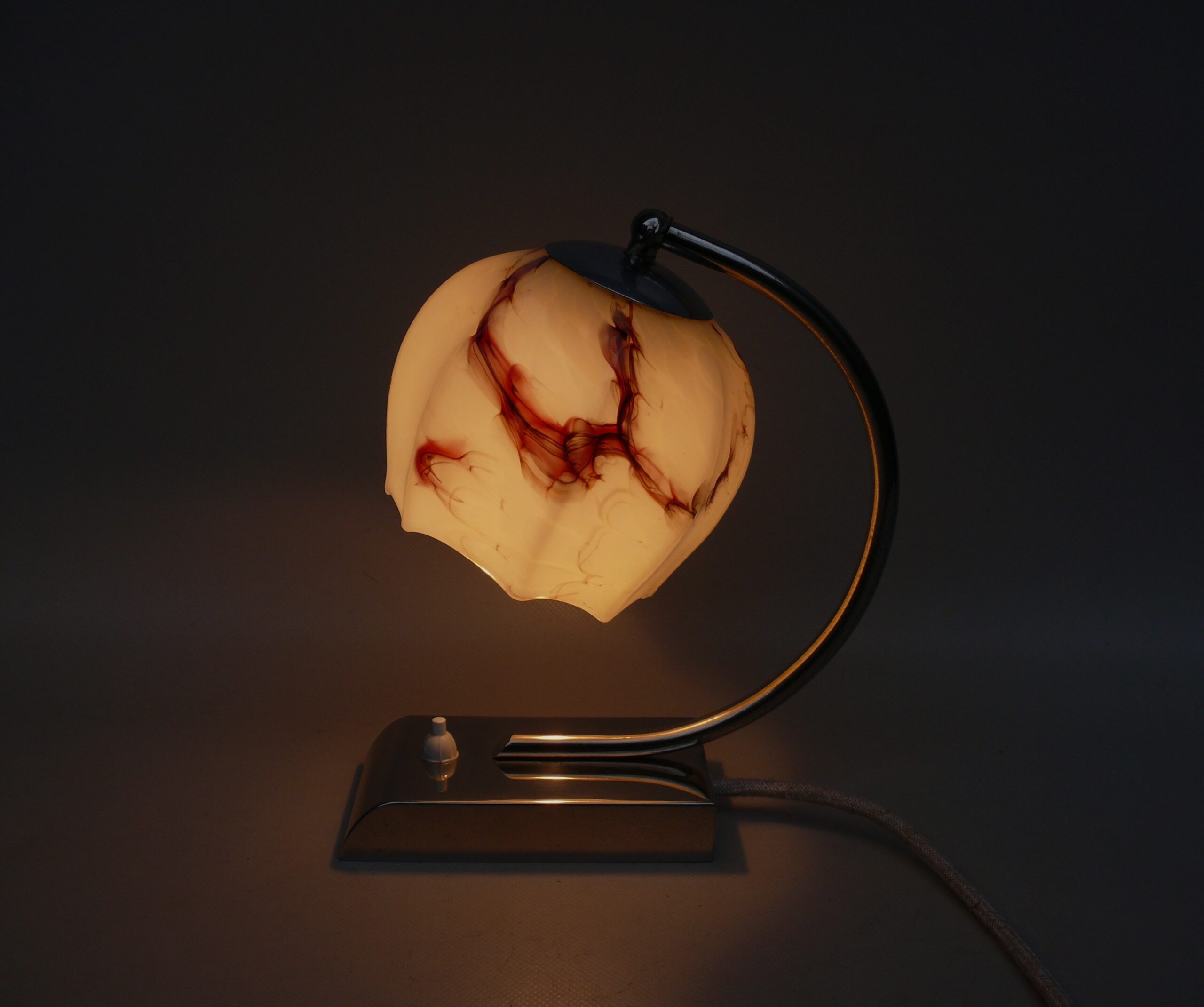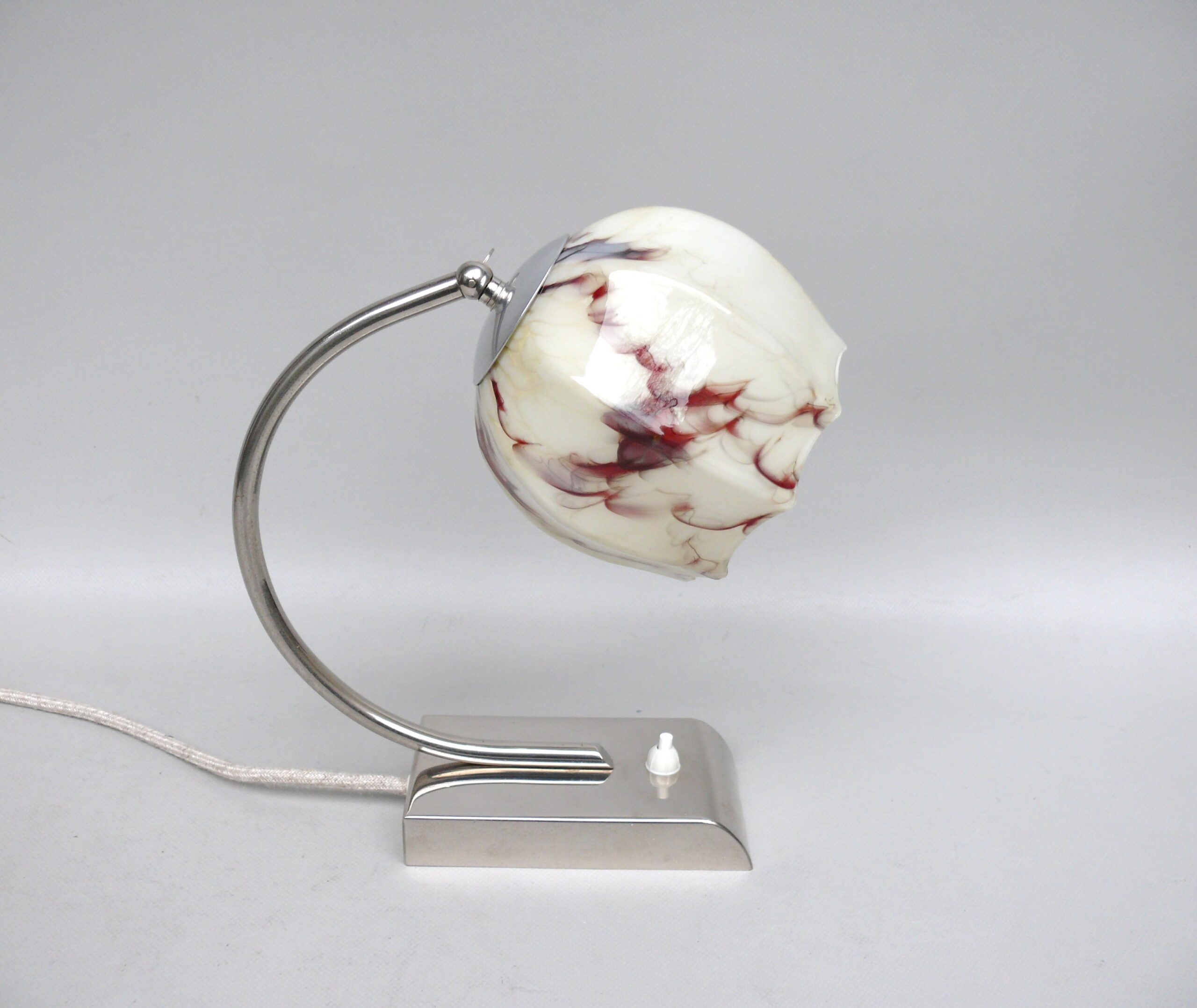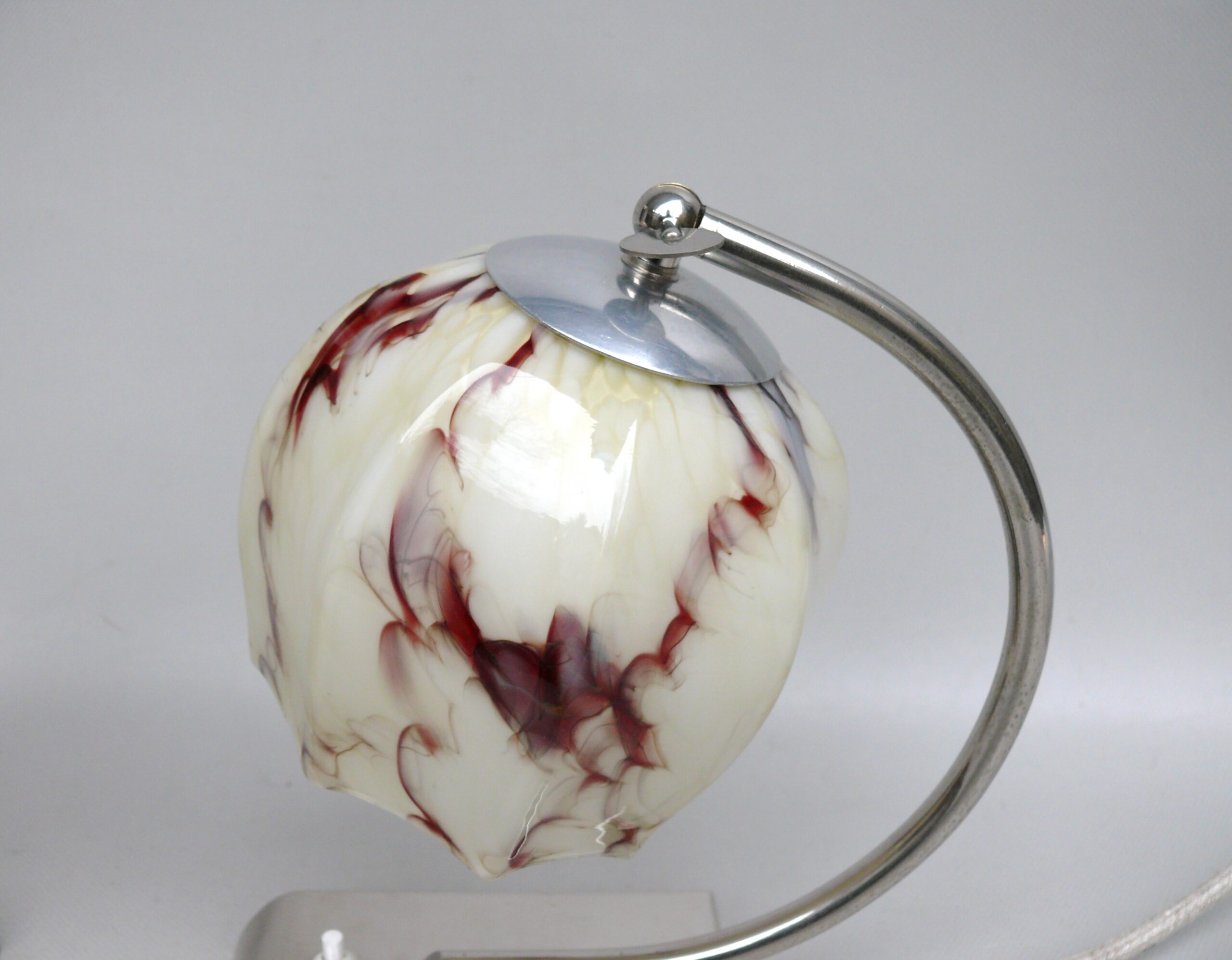 NP1 – 1 paif of bedside lamps, Art Deco, chromed, light beige flashed glass lampshade, extraordinary shape