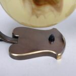 Sie sind detailverliebt und aufwendig gearbeitet: Messingaccessories – jeweils 2 Kugeln halten die Schirme, geschwugener Lampenarm, Stand in Schrumpflack schwarz lackiert.