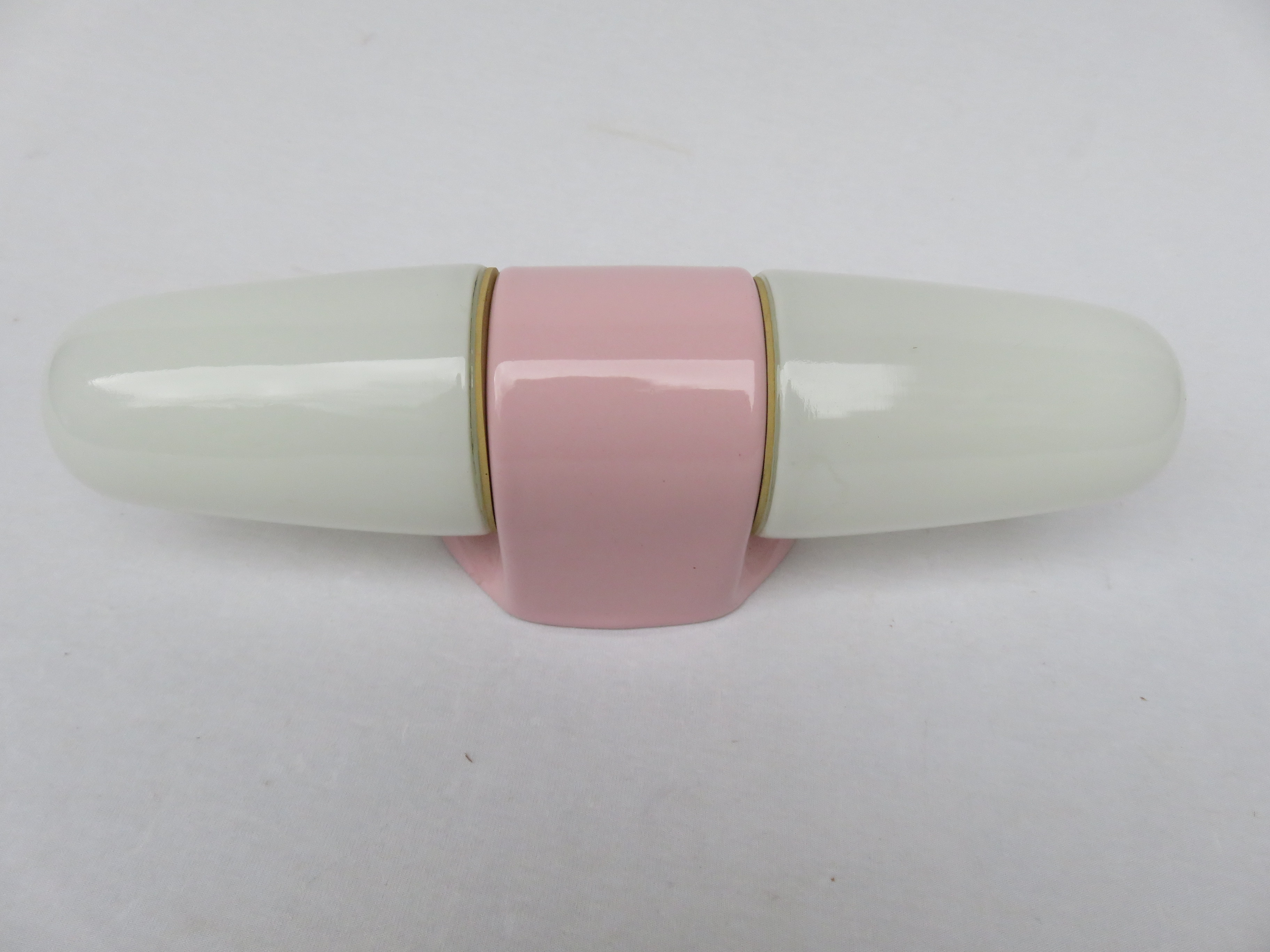 Hier in der Farbkombination rosa Porzellan mit weißen Lampenschirmen. Durch die Lampenschirme geben die Leuchten an angenehmes und blendfreies Raumlicht ab.