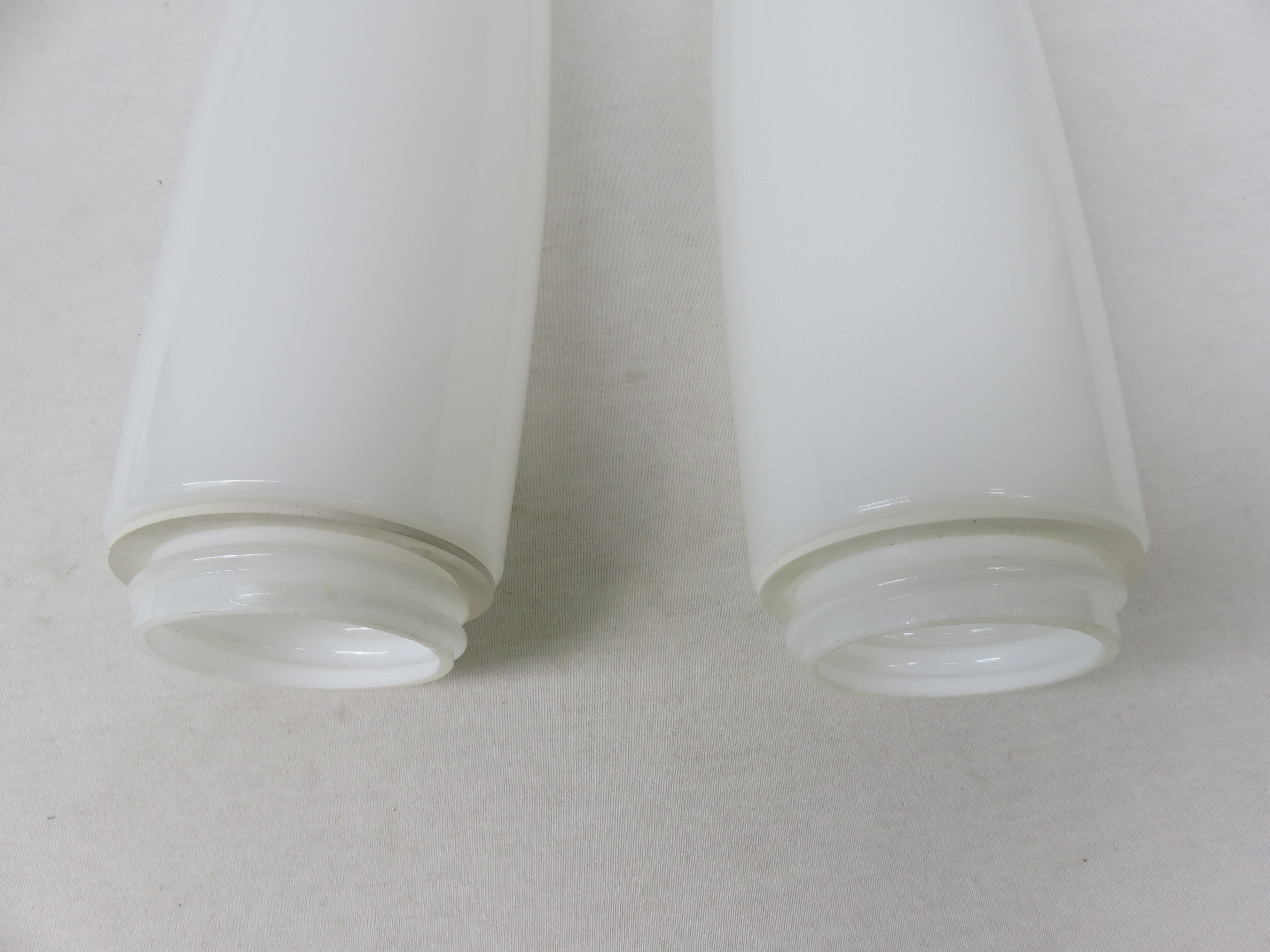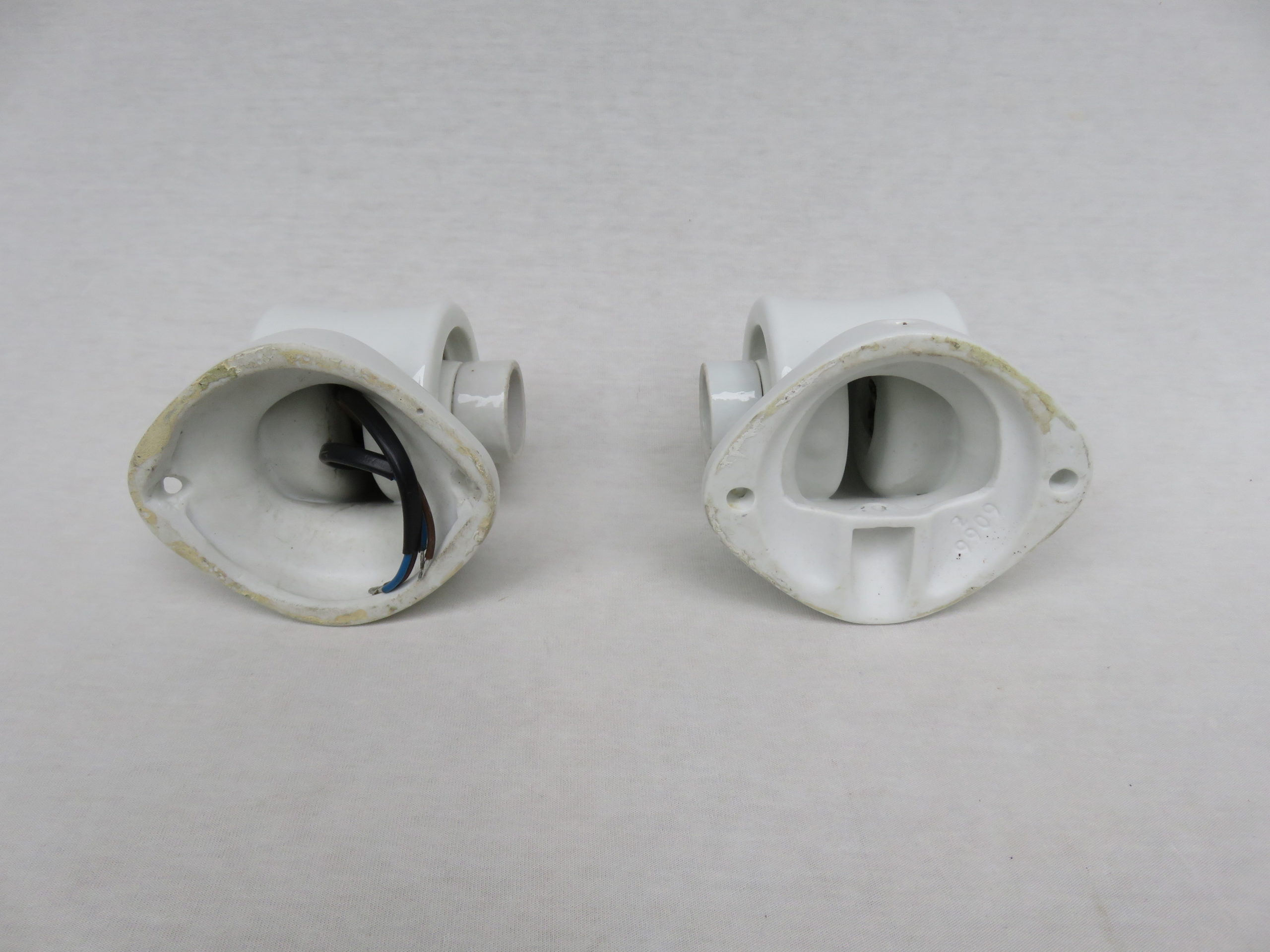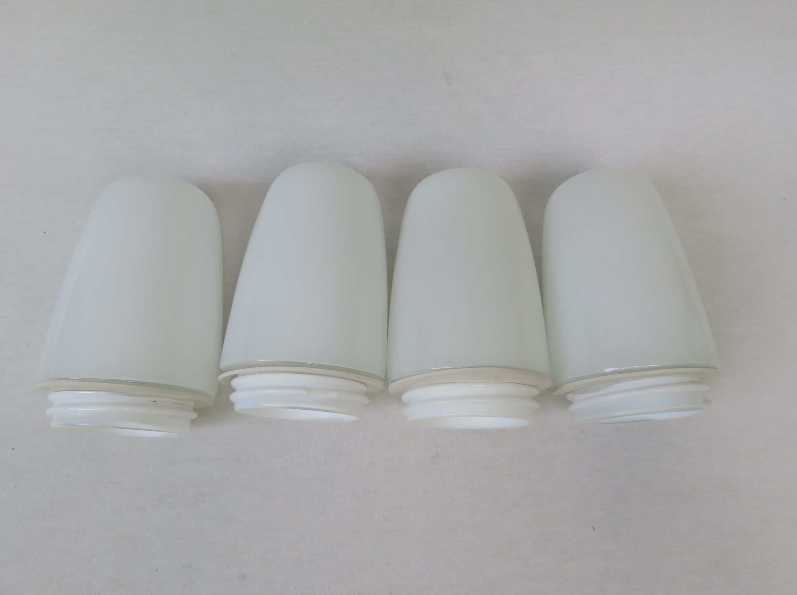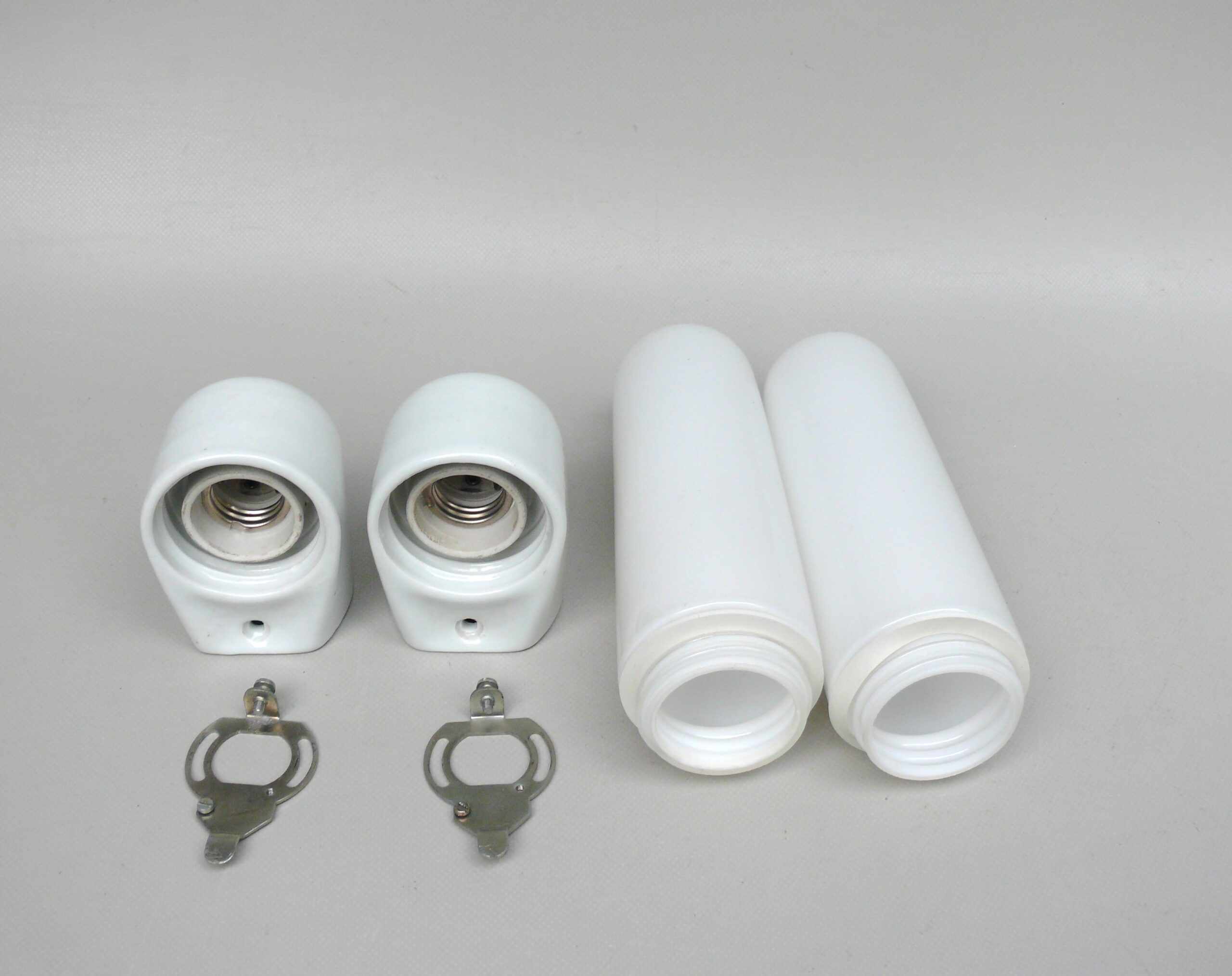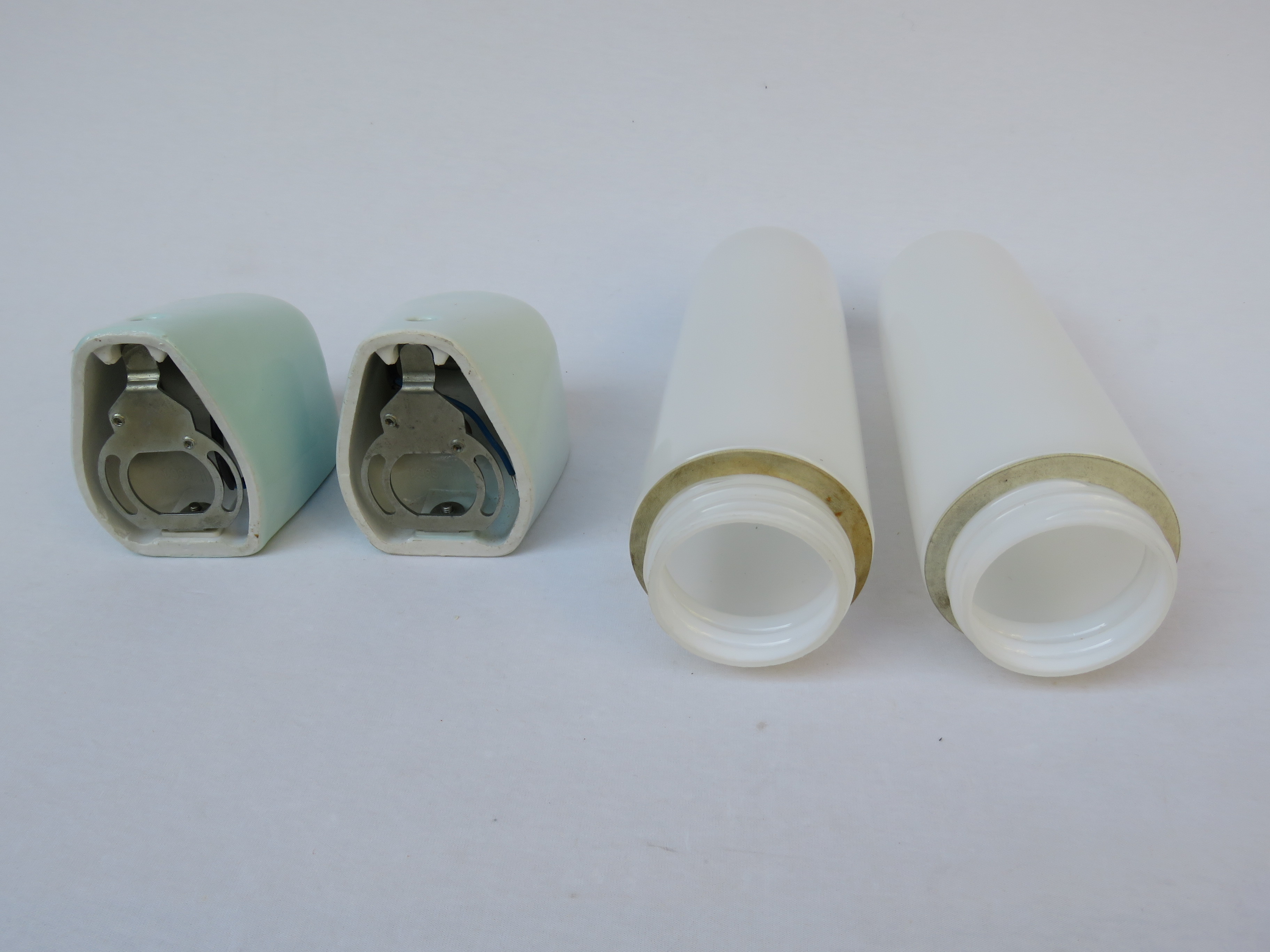 Die Mittelteile sind aus weißen Porzellan, die Lampenschirme aus weißem Überfangglas. Dadurch geben die Leuchten ein angenehmes und blendfreies Licht ab.