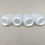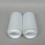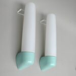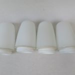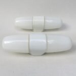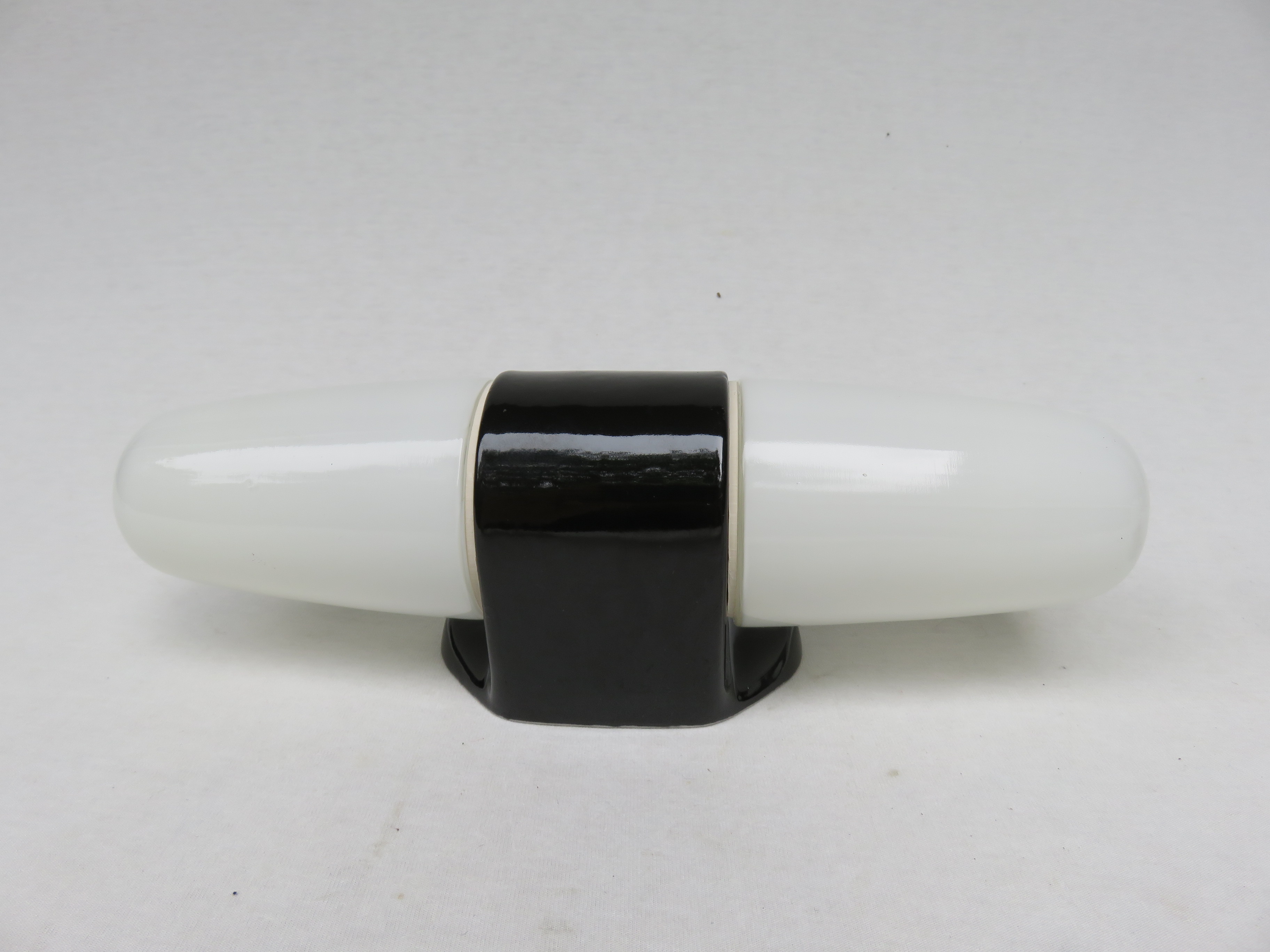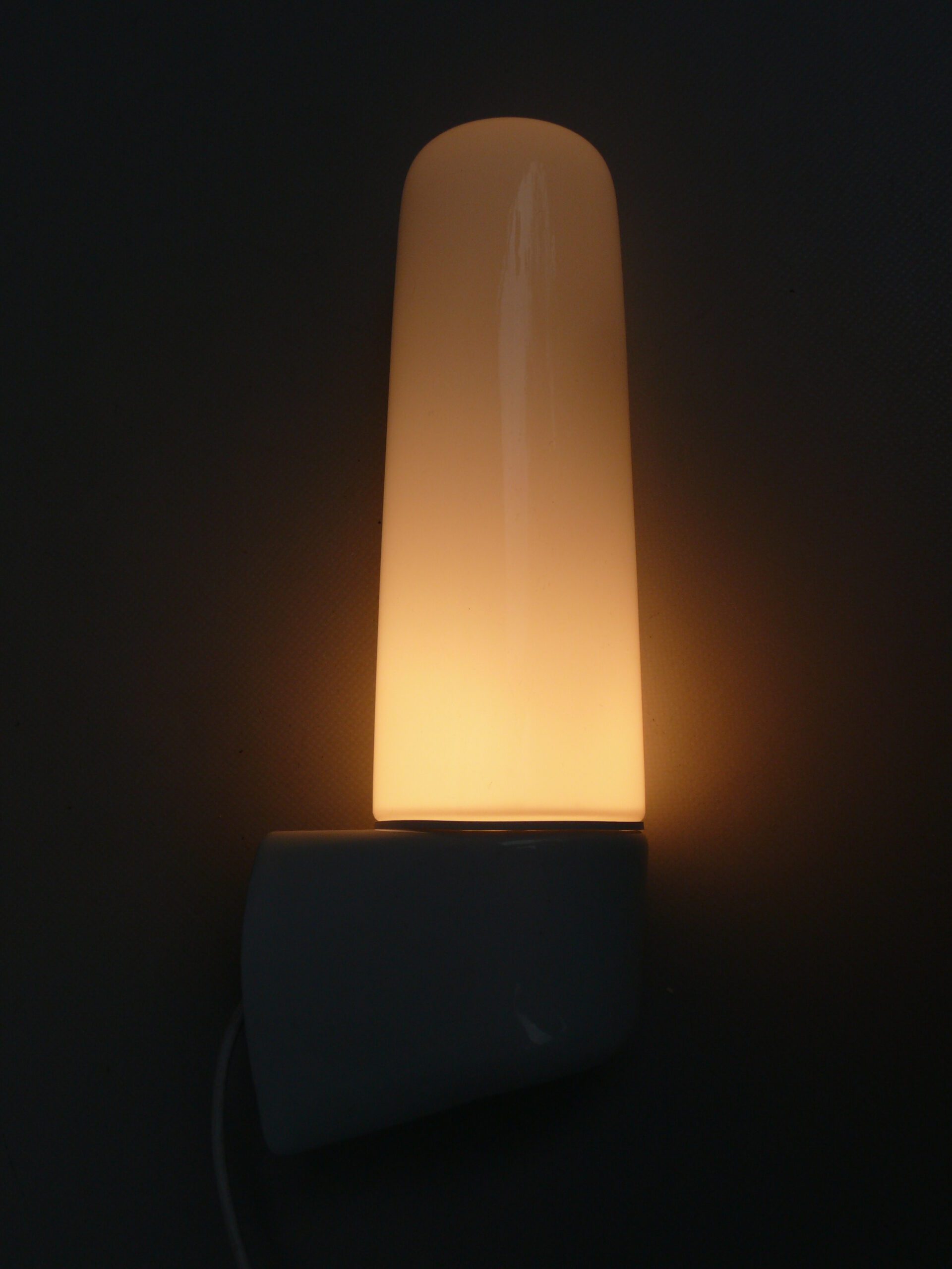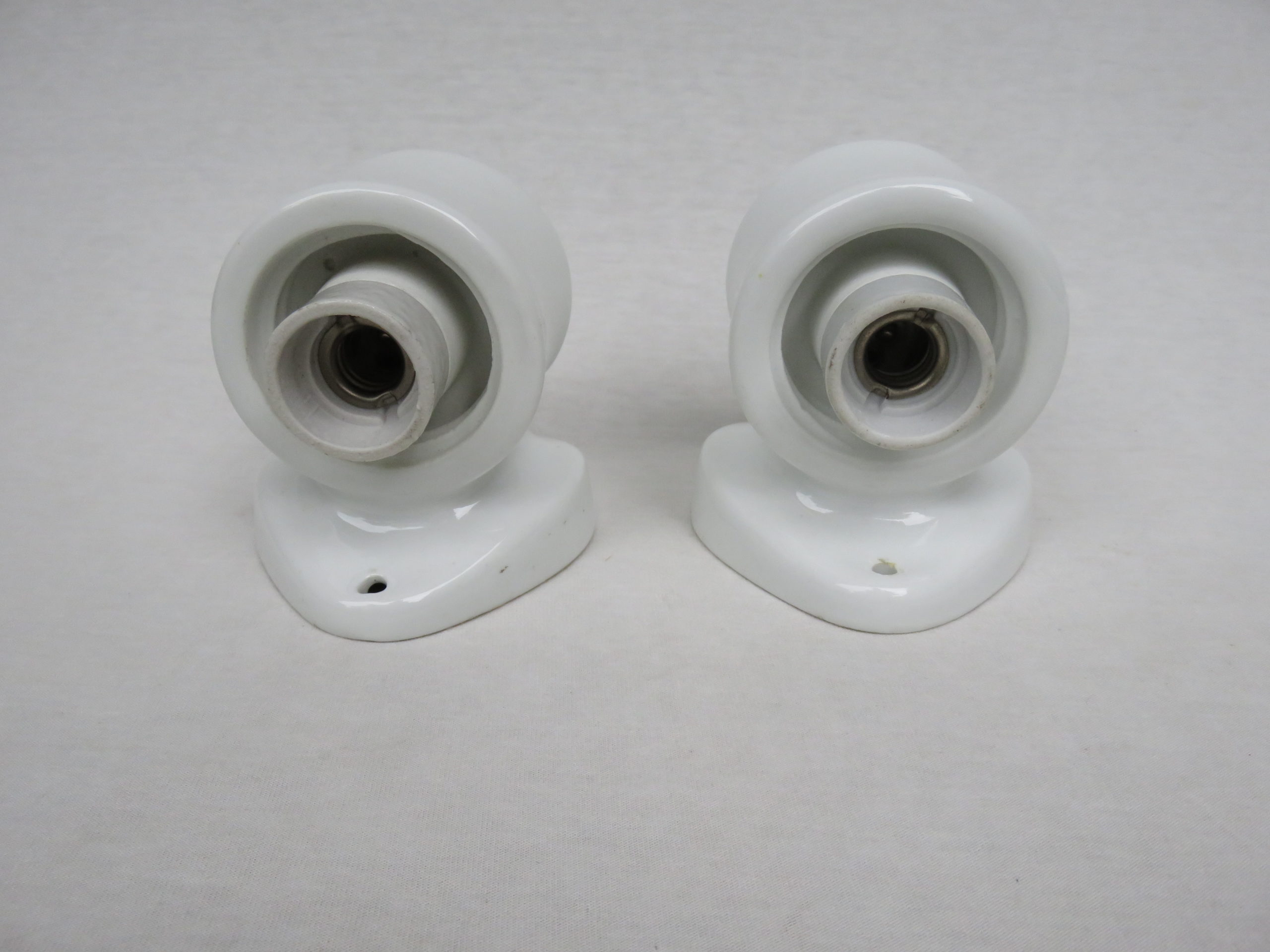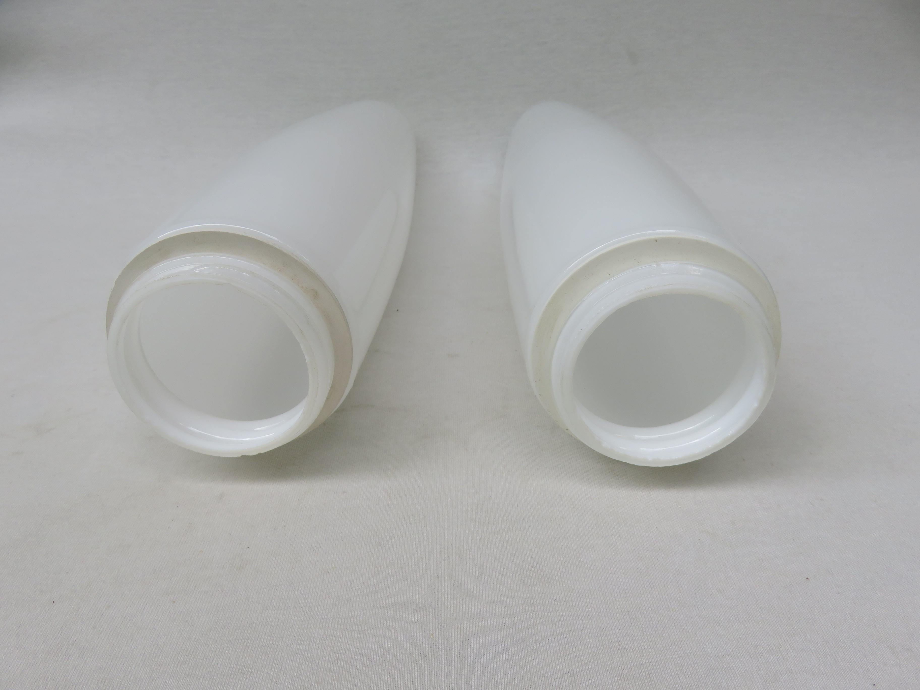 Die Mittelteile sind aus weißen Porzellan, die Lampenschirme aus weißem Überfangglas. Dadurch geben die Leuchten ein angenehmes und blendfreies Licht ab.