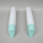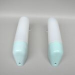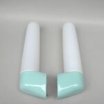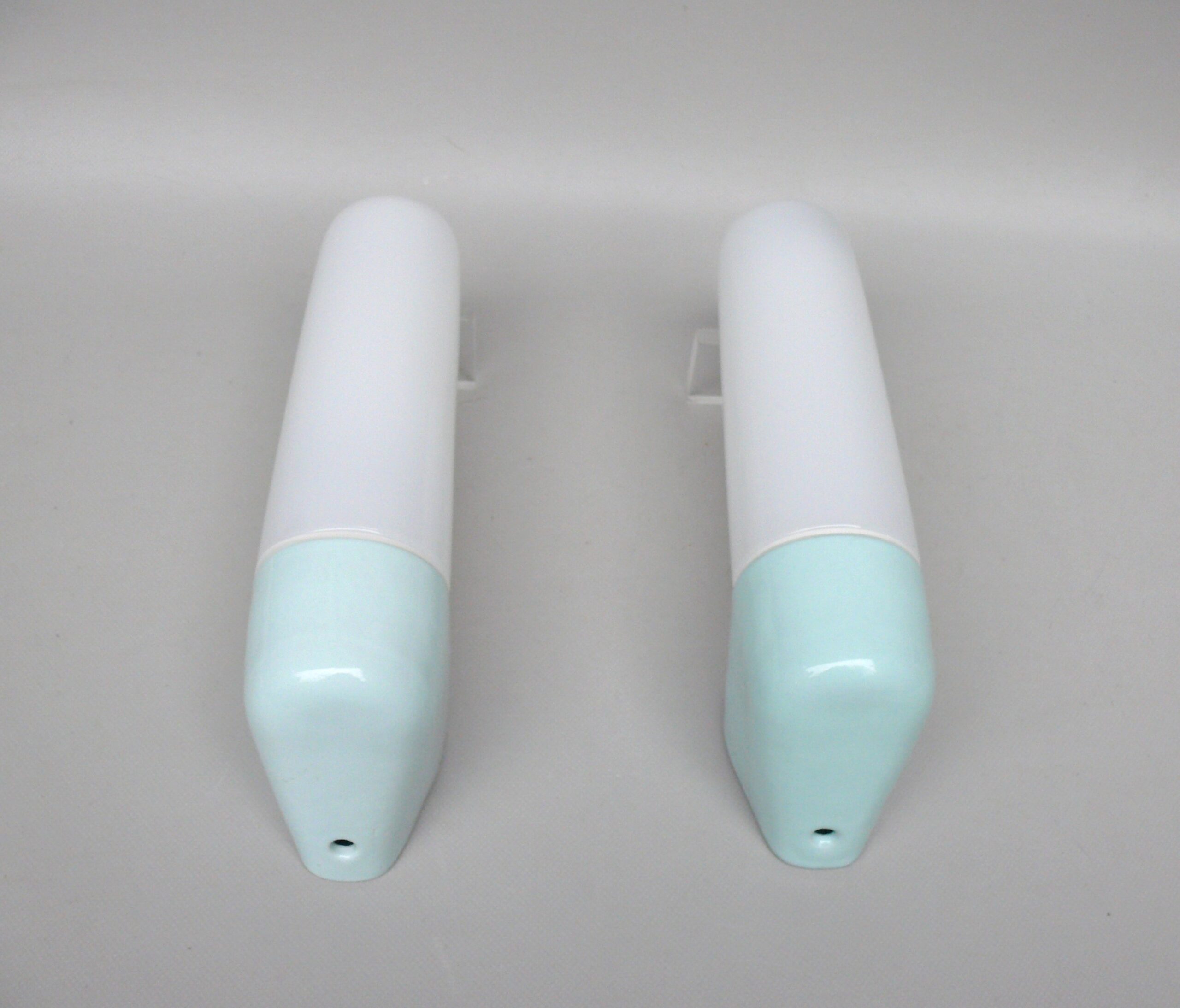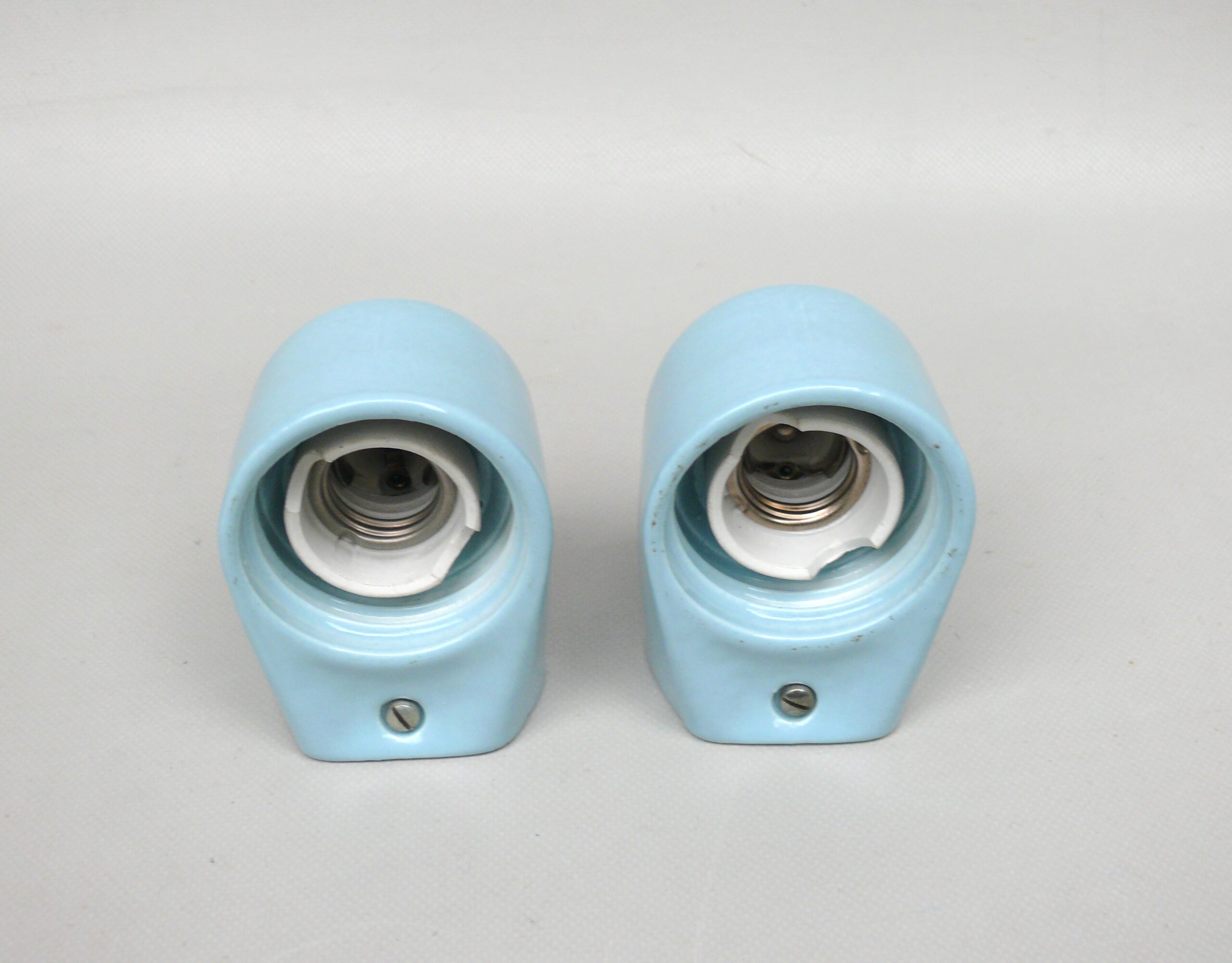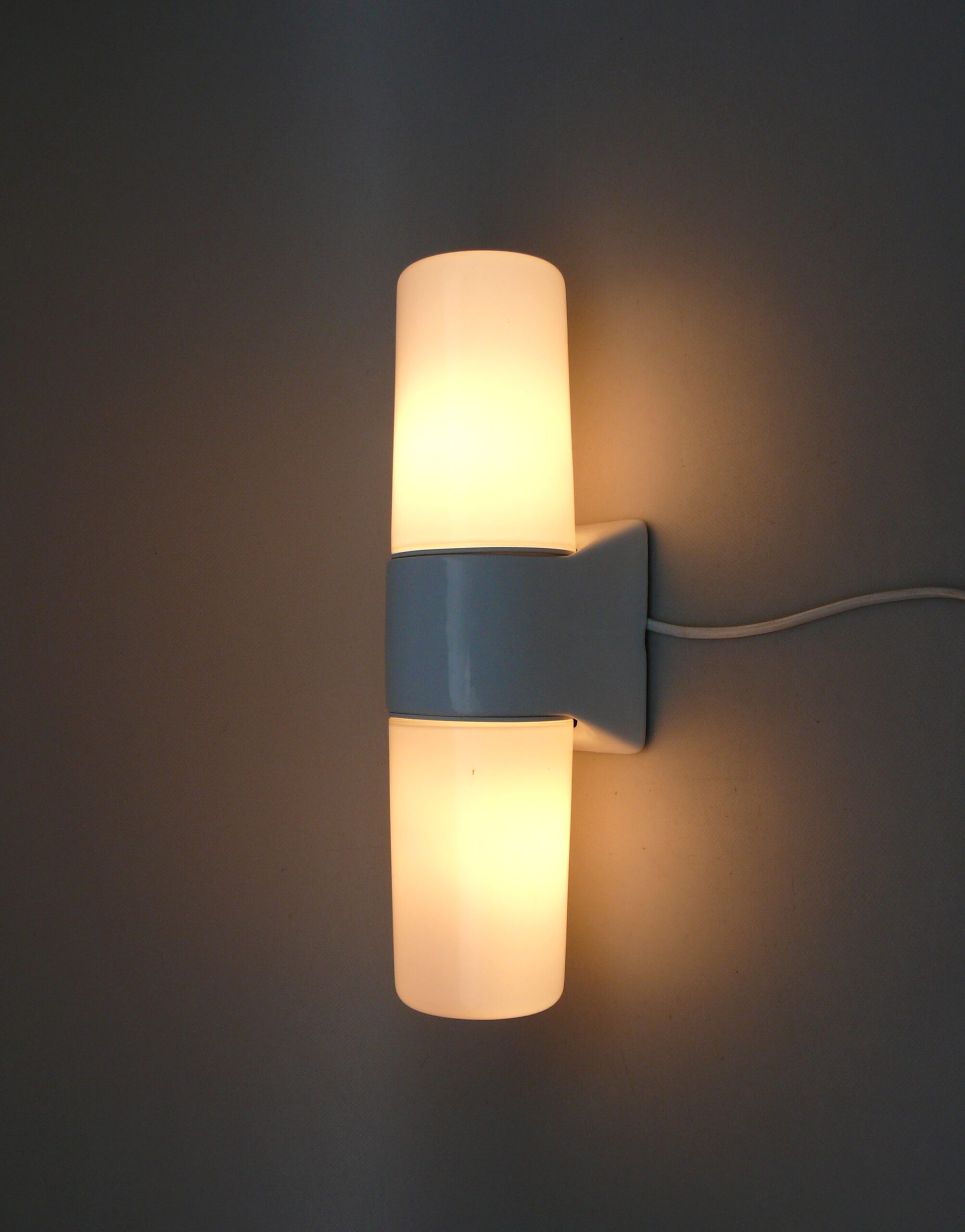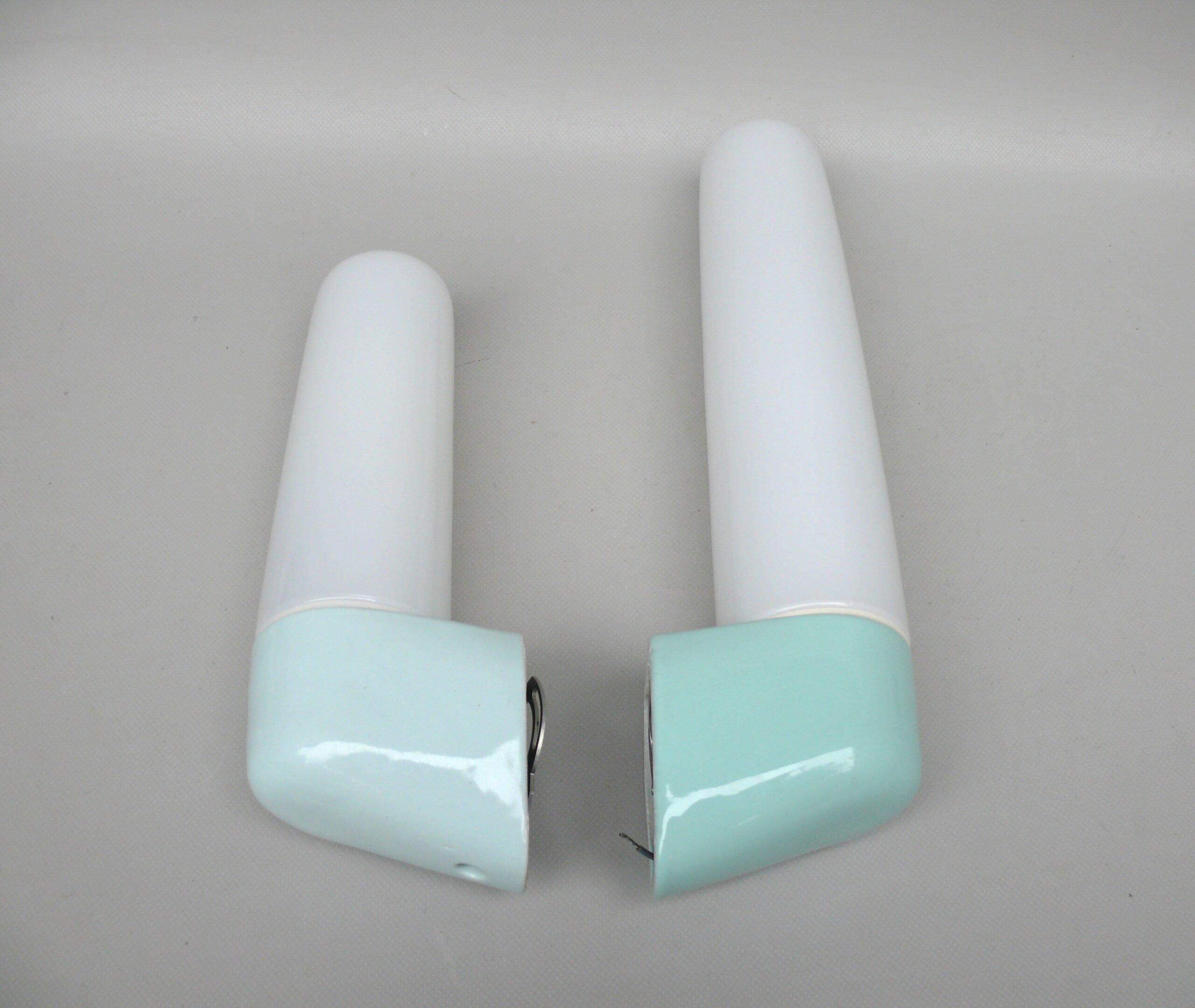 SP4 – 1 Paar Spiegelleuchten, Entwurf Wilhelm Wagenfeld für Lindner GmbH, Bamberg, WVZ 380, Entwurf 1960, H 272, L 95, in hellblau – Die Kleinen