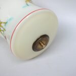 Die Wandhalterung ist aus beige lackiertem Metall mit einer Ziermutter aus Messing, die die Fassung hält. Der Lampenschirm aus Glas wird in eine Nut von oben in die Wandhalterung eingeschoben.