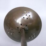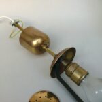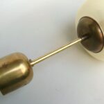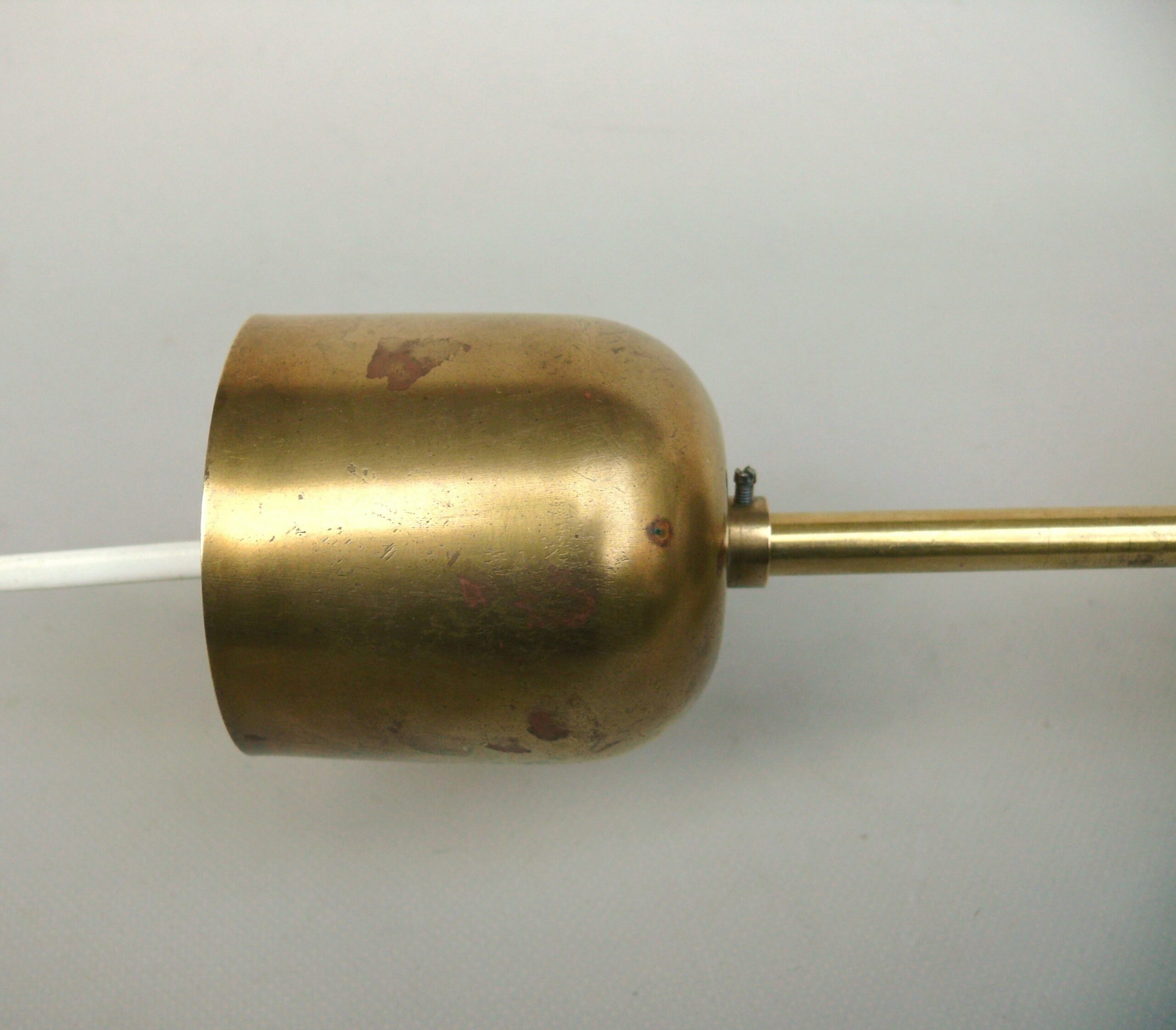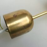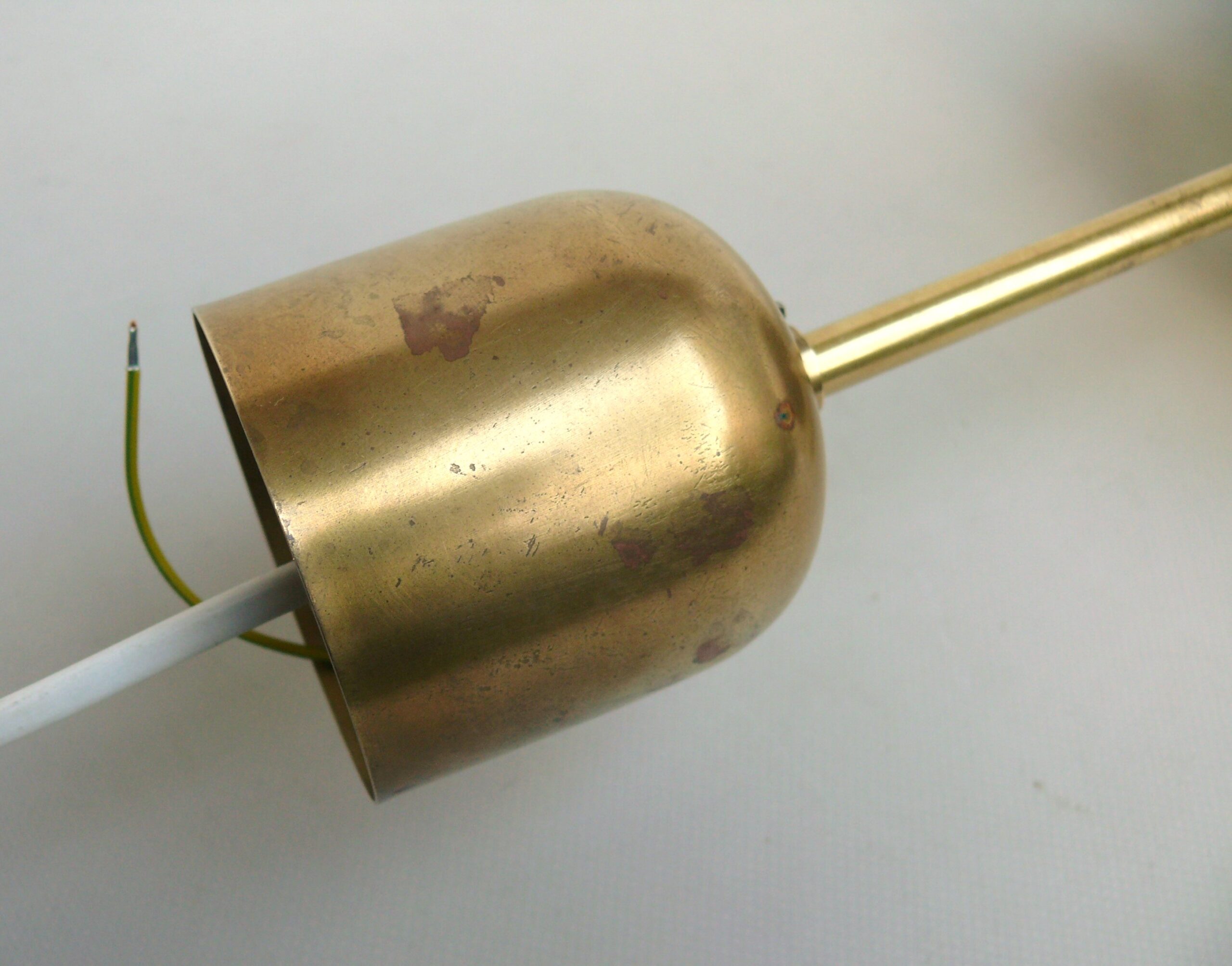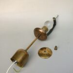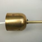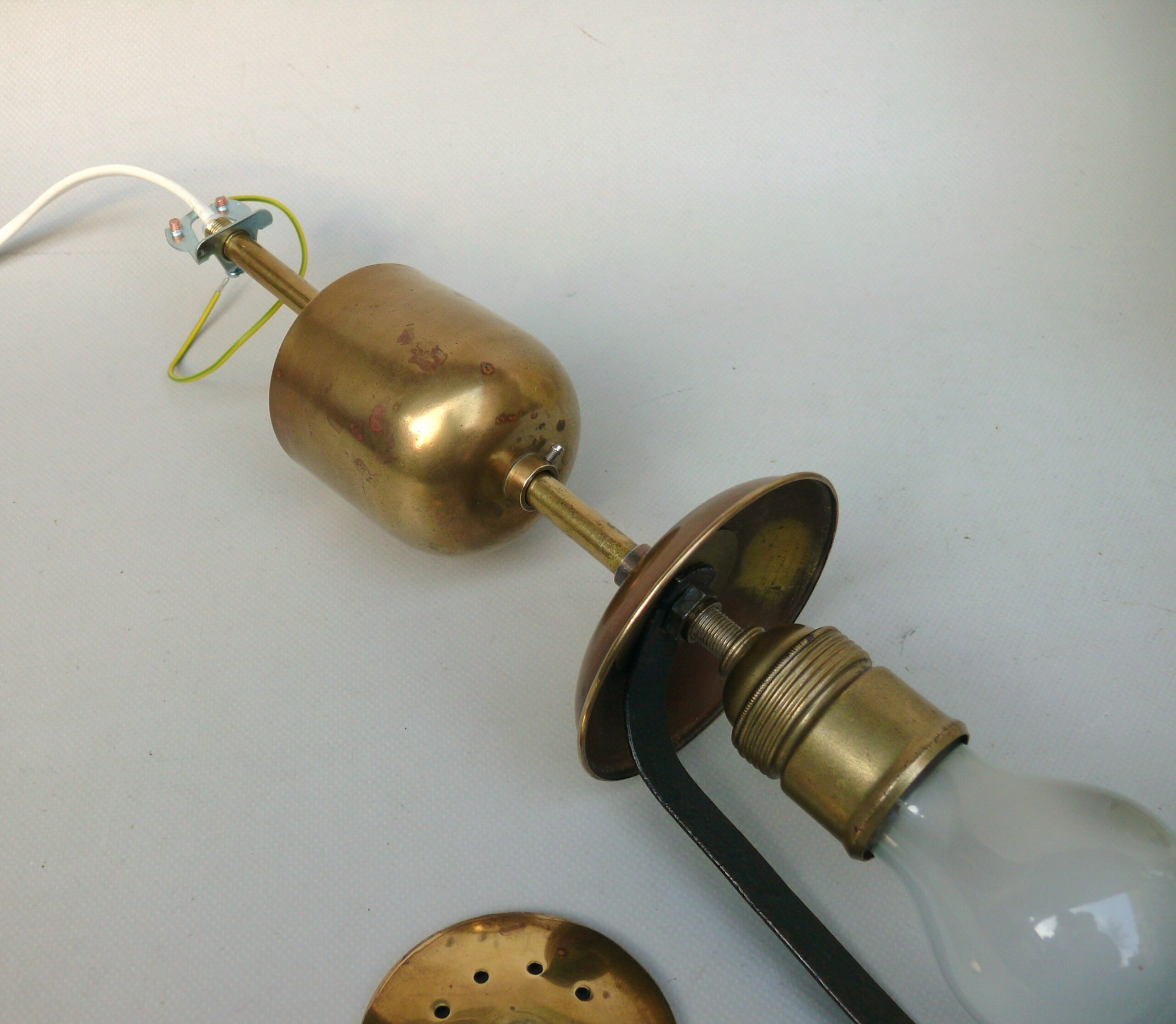 Das Messing zeigt eine warme Patina. Am Lampenschirm sind am oberen Rand leichte Flohbisse vorhanden – diese stammen vom Einsetzen des Lampenschirm und sind im hängenden Zutand nicht sichtbar.