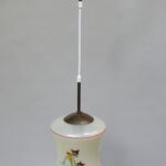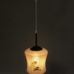 Die Halterung des Lampenschirms ist vernickelt, das Baldachin ist aus weißem Melamin. Der Lampenschirm ist aus leicht beigem Überfangglas und trägt den original Herstelleraufkleber DORIA.