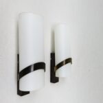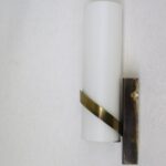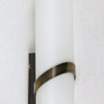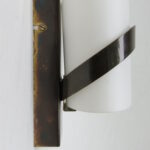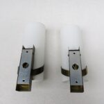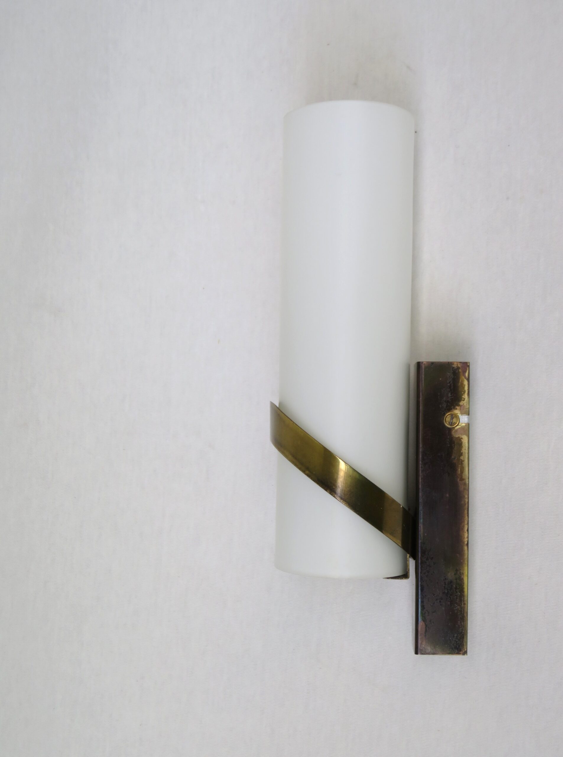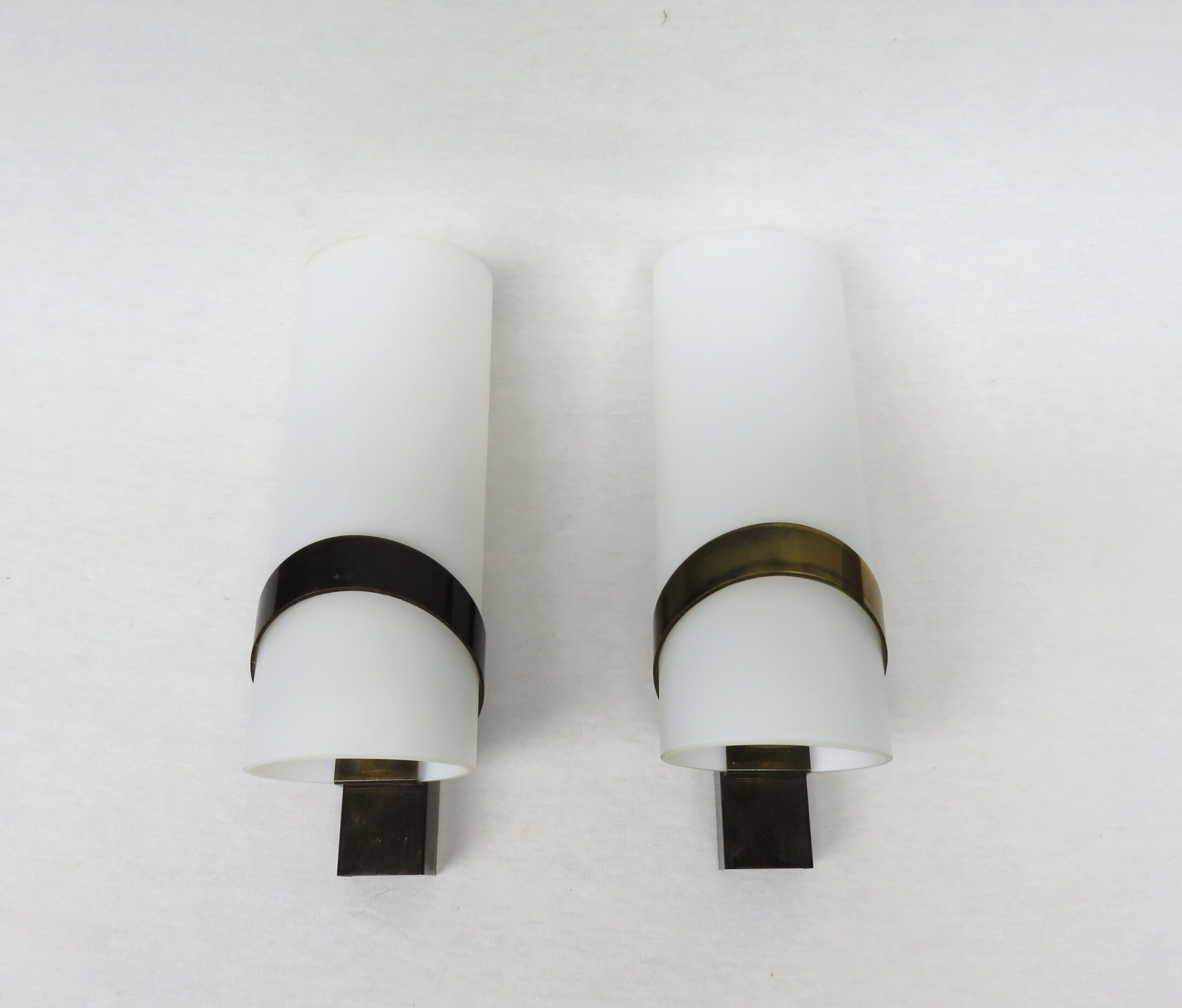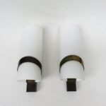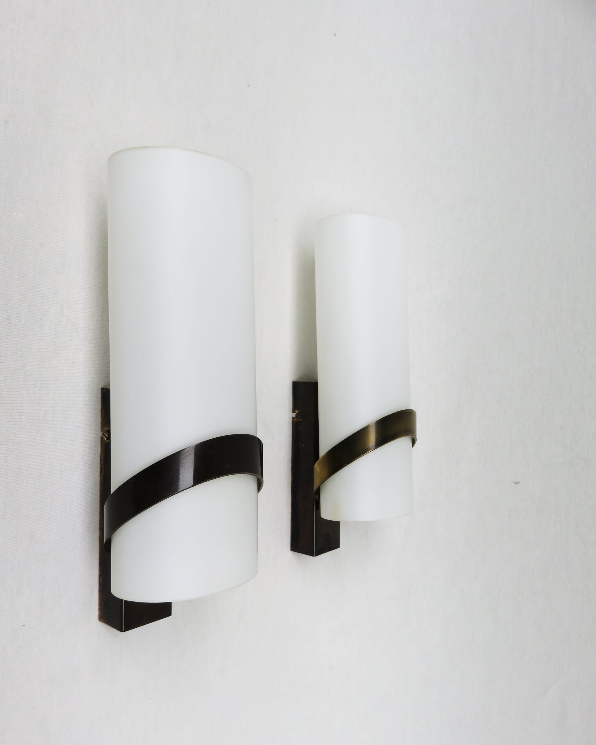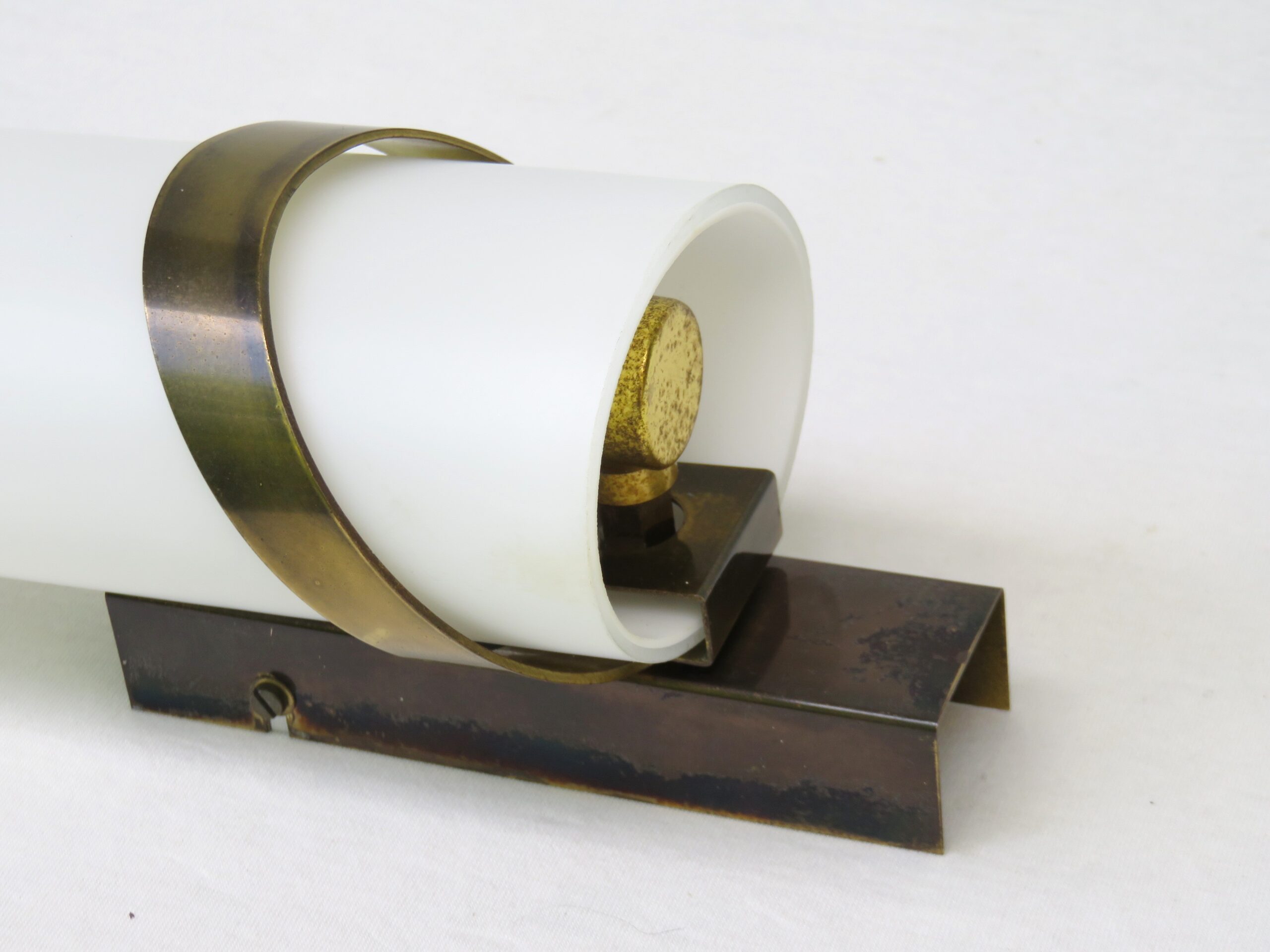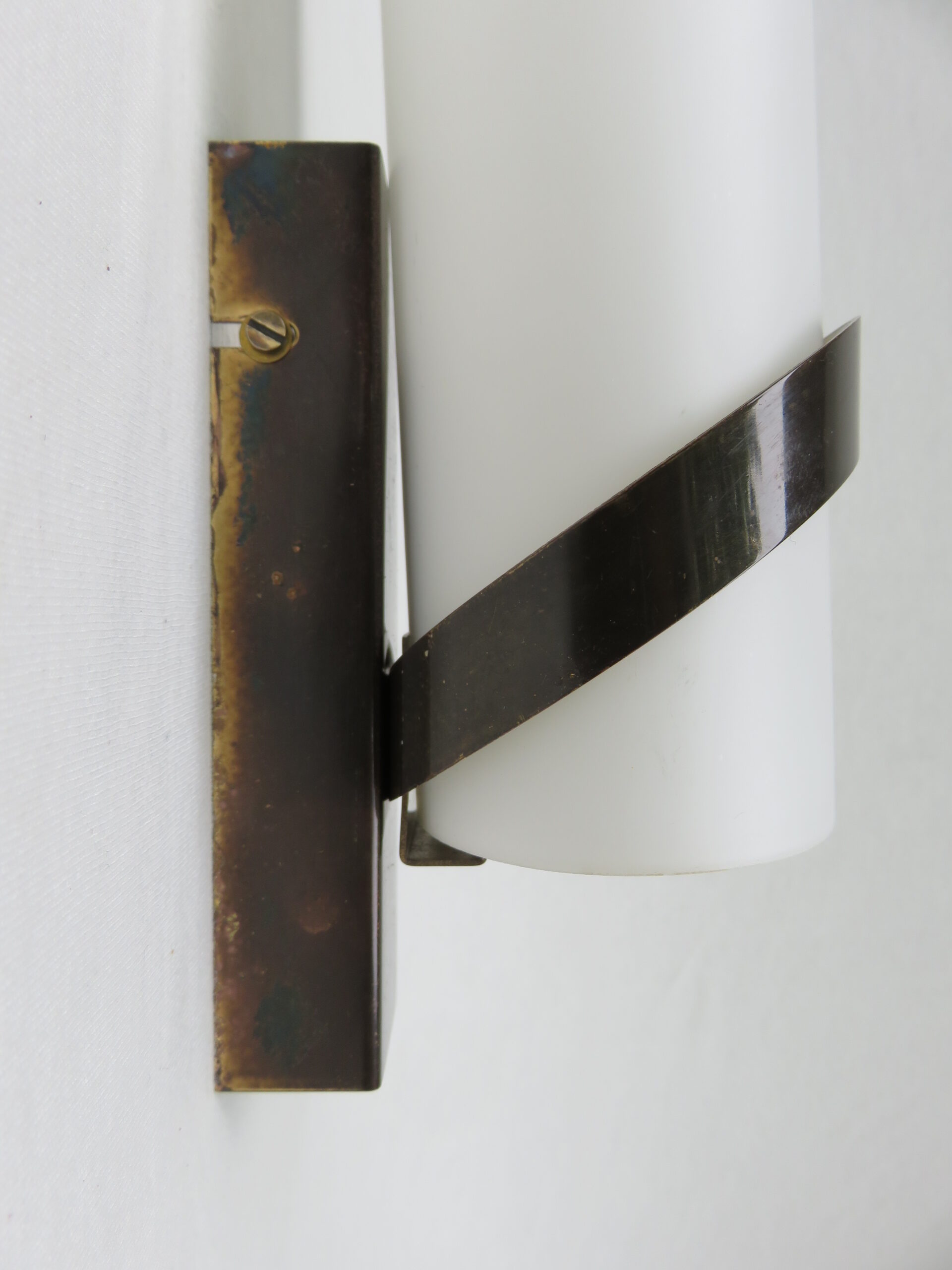 W96 – 1 Paar Wandleuchten, 60er Jahre, Italien, patiniertes Messing, ovale Glaszylinder Überfangglas satiniert