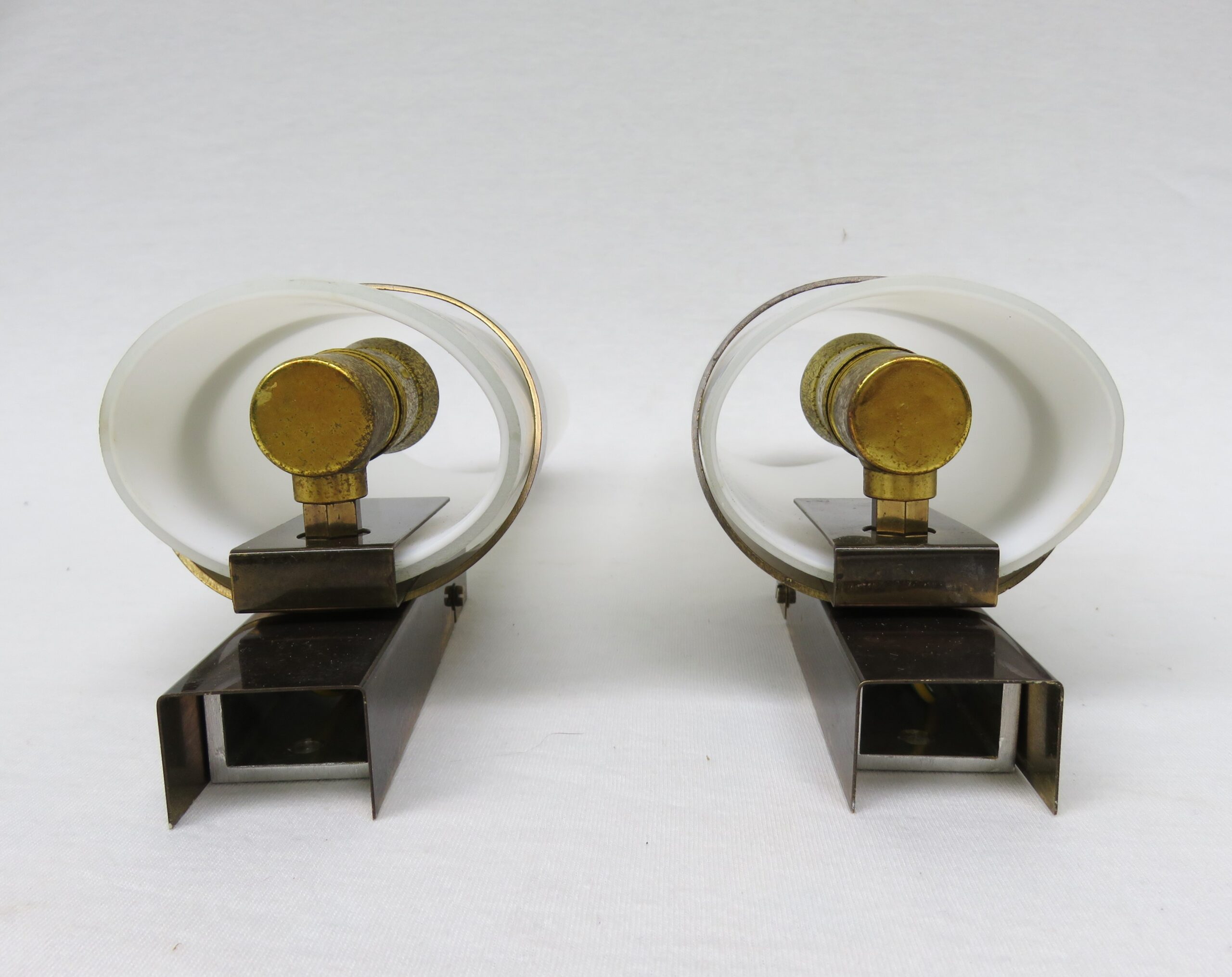 Ein Paar Wandleuchten, hergestellt in den 50er Jahren in Handarbeit. Die Leuchten sind ausgeführt in der Kombination von poliertem mit patiniertem Messing.