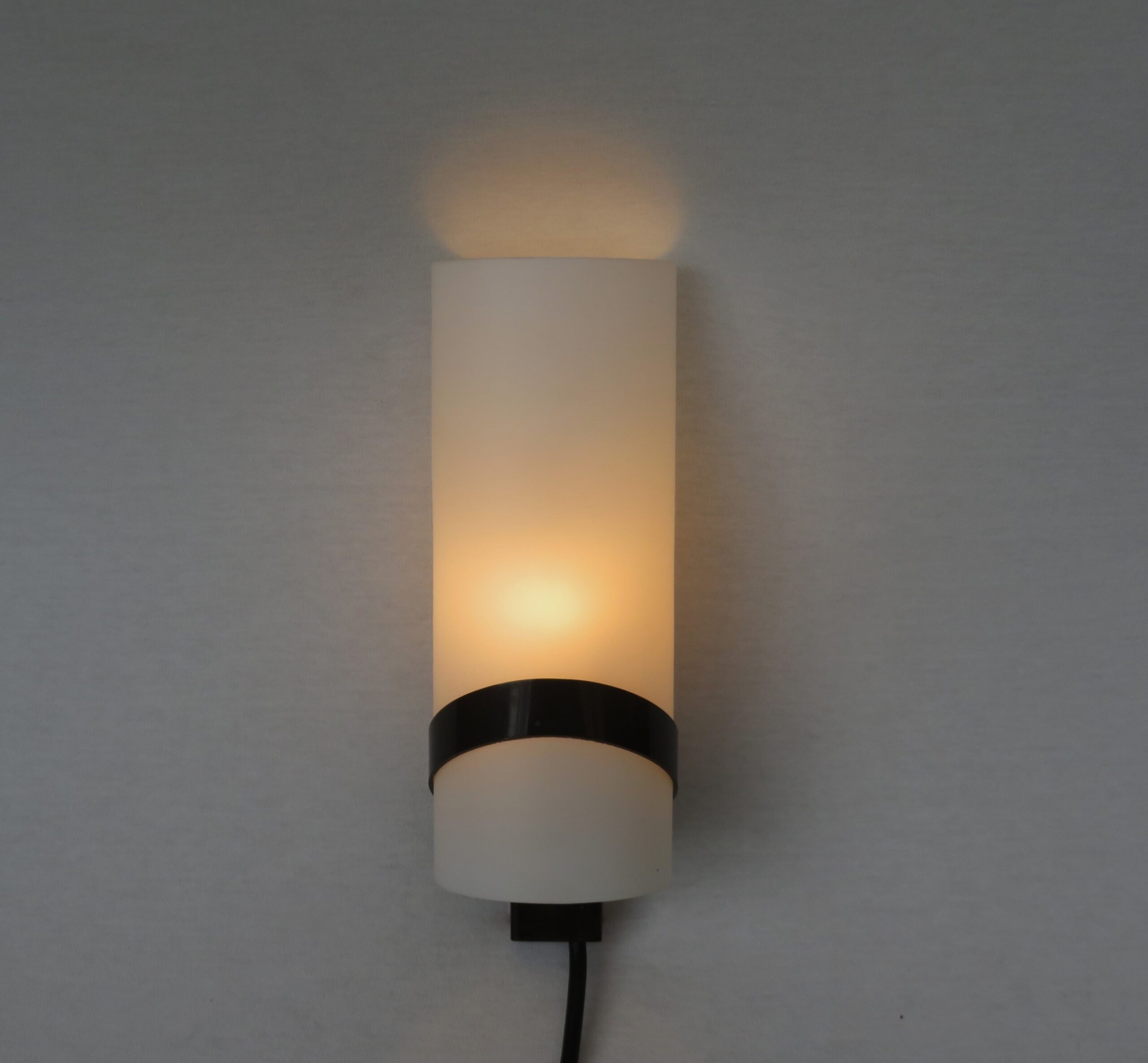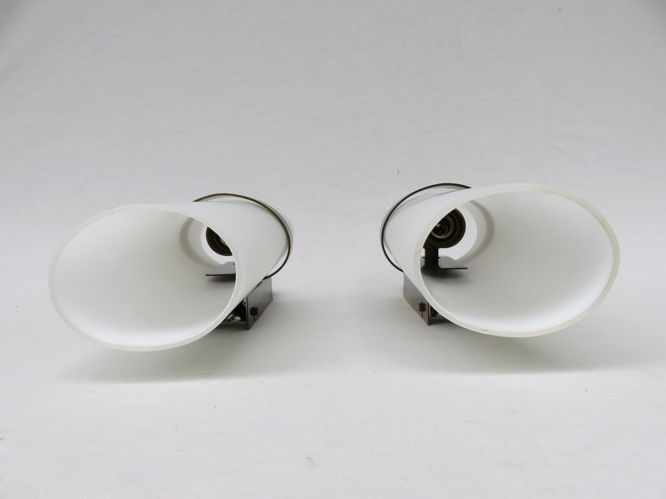 W88 – 1 Paar Wandleuchten, 50er Jahre, schwarz, Messing, Lampenschirme Überfangglas satiniert, Hersteller LBL, vormals Kandem