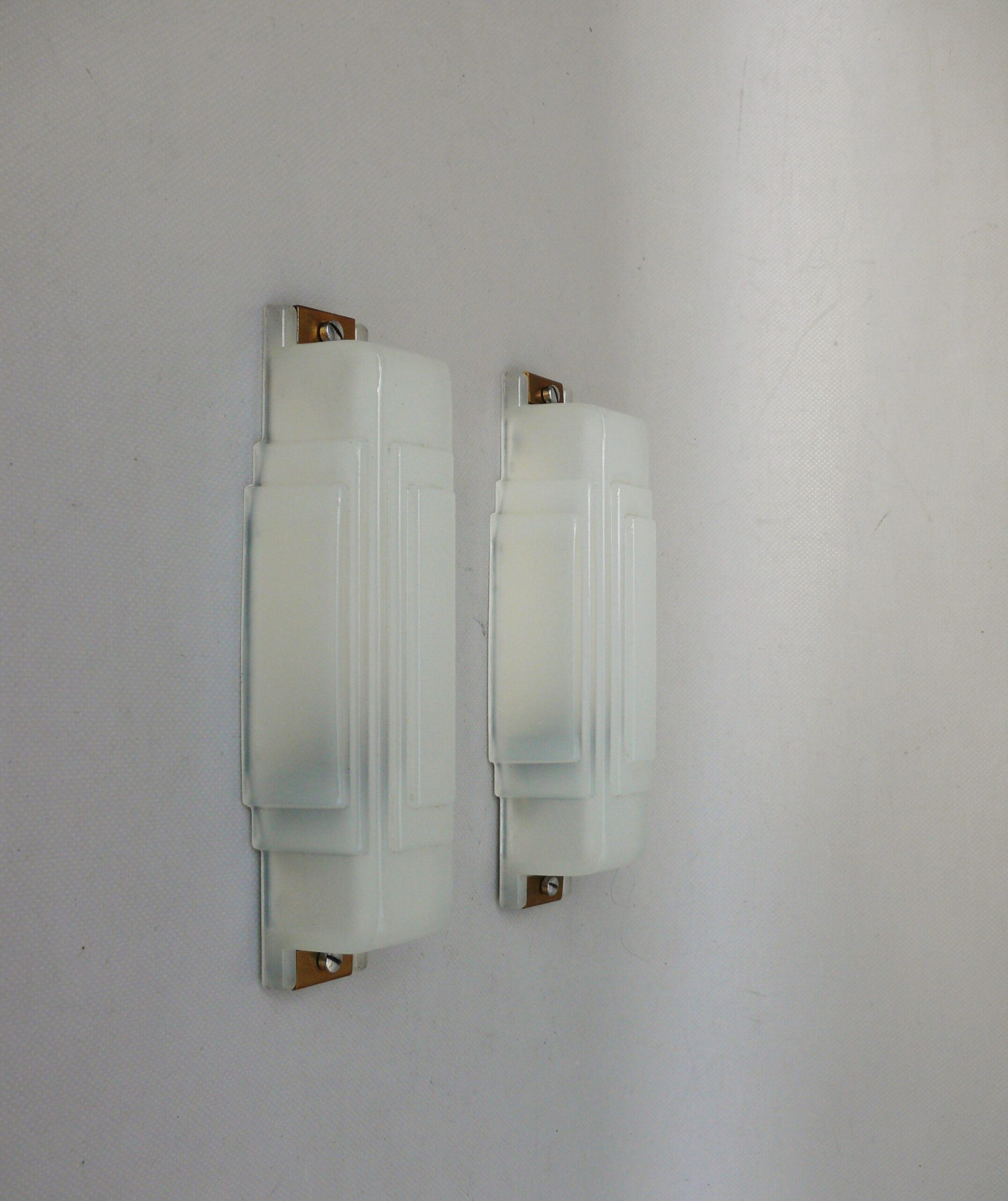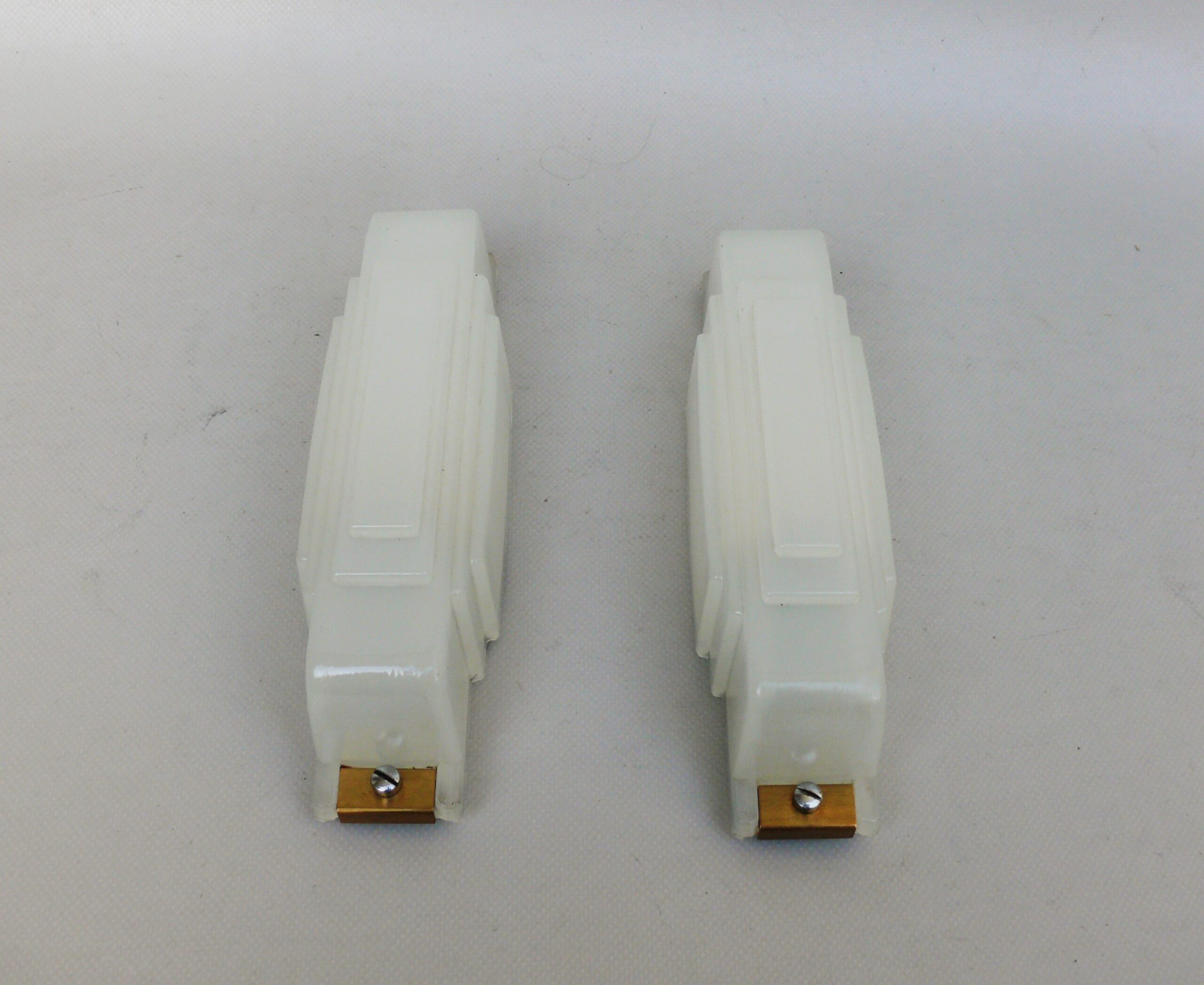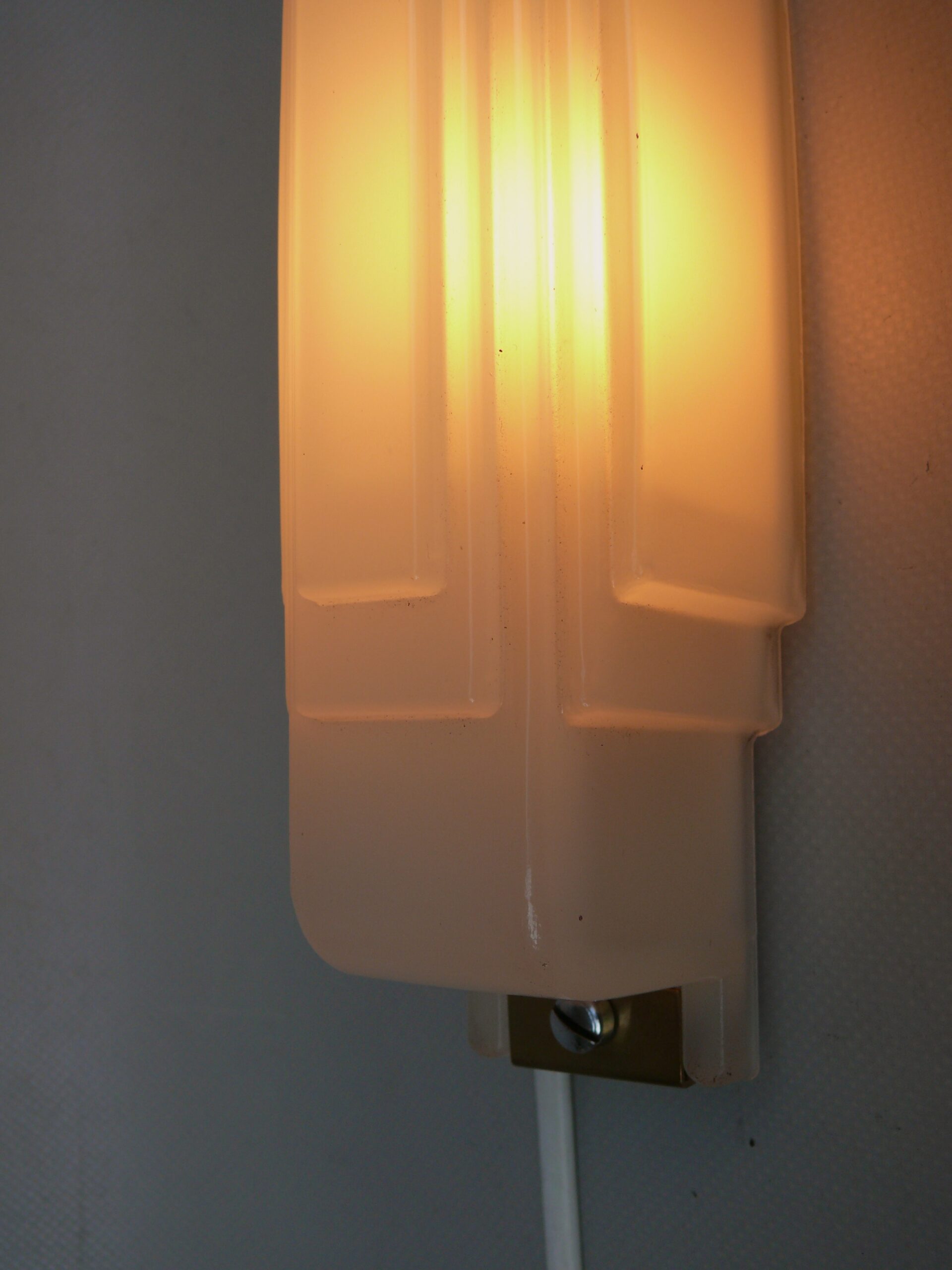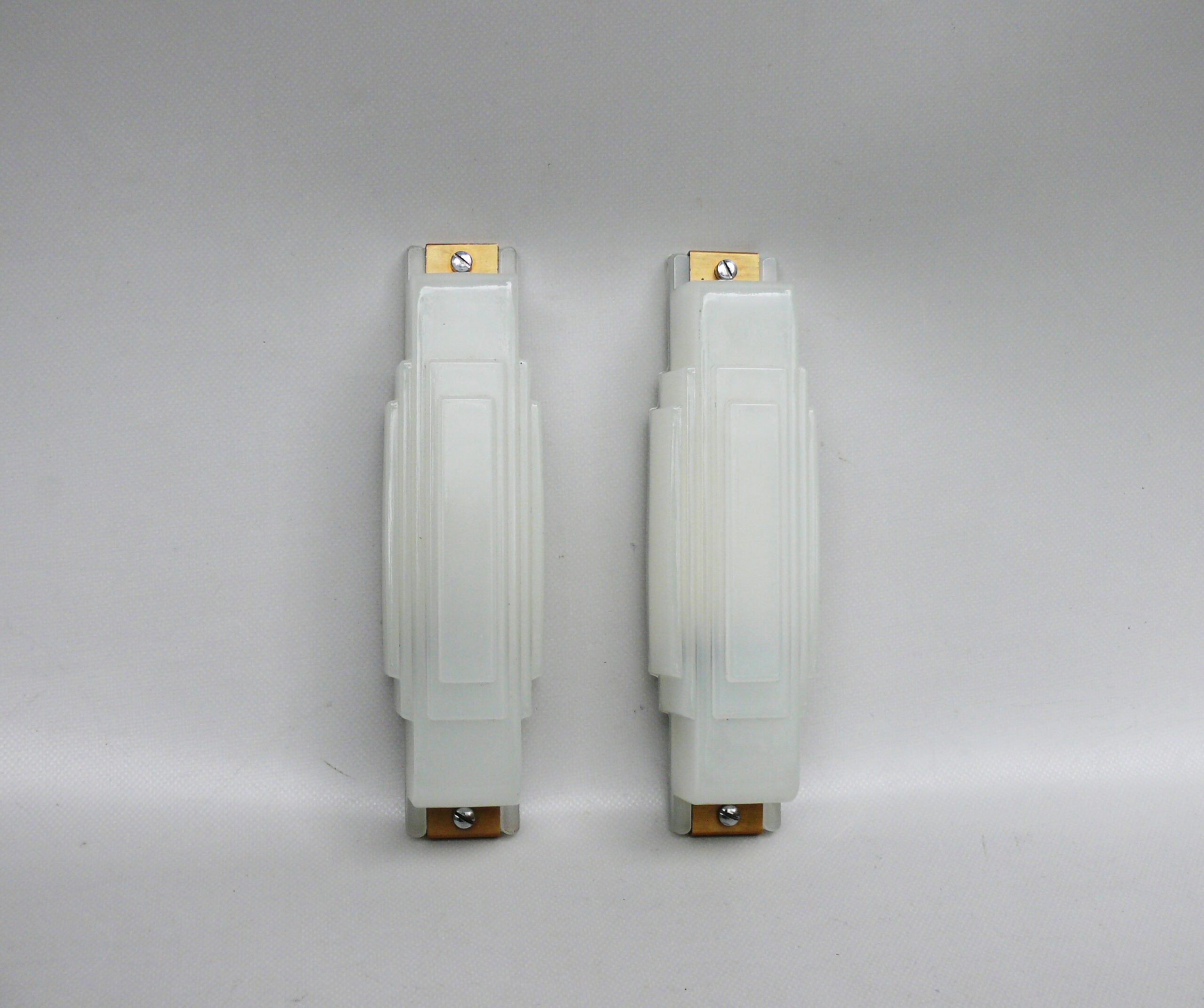 Ein Paar zierliche und elegante Wandleuchten aus der Zeit des Art Deco, hergestellt in Frankreich. Durch den Lampenschirm in zeittypischer Skyscraper-Optik aus satiniertem Opalinglas geben sie ein angenehmes und blendfreies Raumlicht ab.