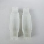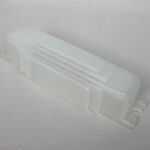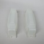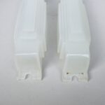 Die geschwungenen Lampenschirme aus Plexiglas sind in zwei Schichten aufgebaut, die obere Schicht in durchscheinend dunklem Gelb und die darunterliegende Schicht in satiniertem Weiß.
