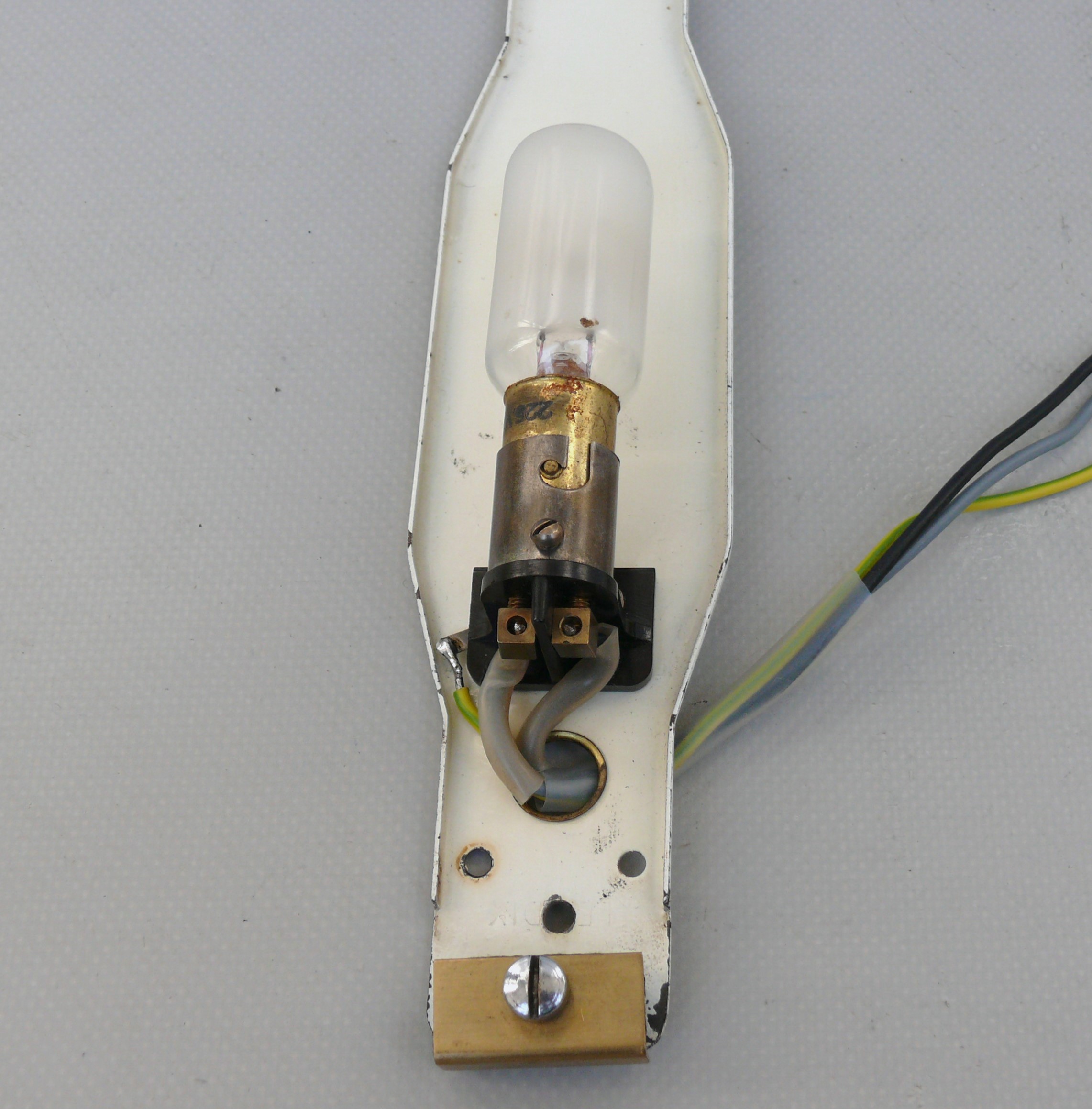 Die Wandleuchte ist mit einem Zugschalter und einer E27-Fassung ausgestattet. Die Leuchte ist in einem guten Zustand mit nur wenigen Gebrauchsspuren.
