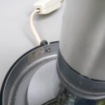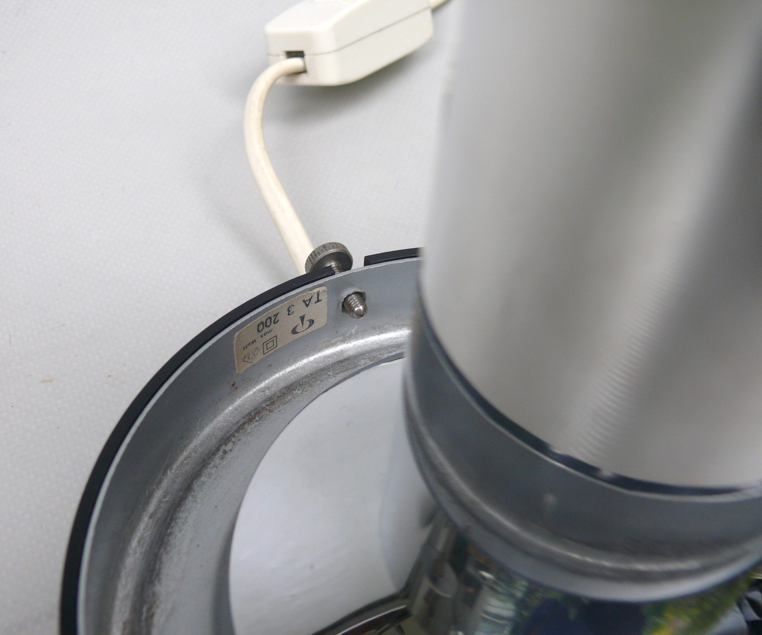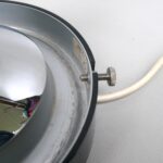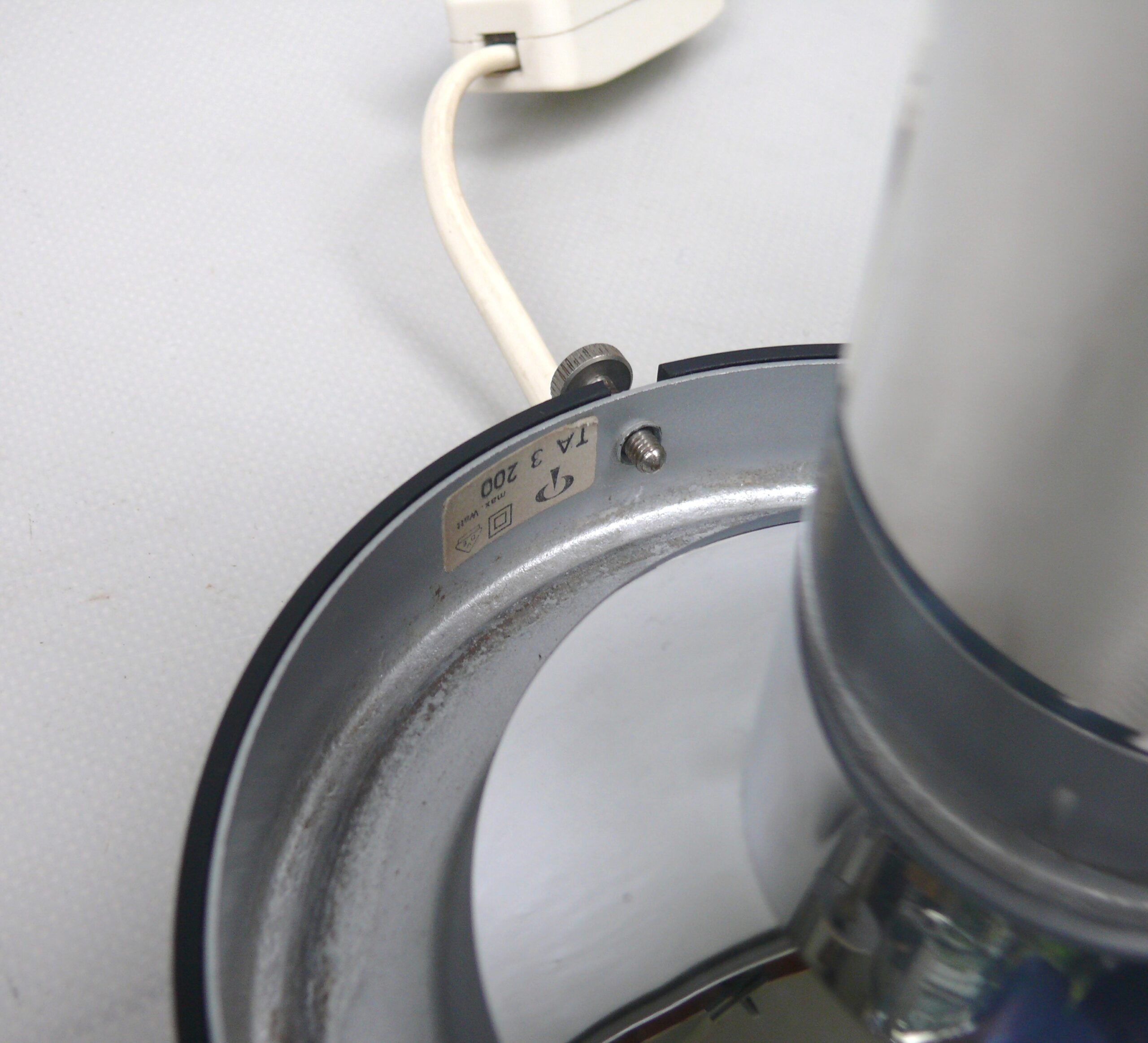 Die Verchromung zeigt ein einer Stelle (unten hinten neben dem Kabelaustritt) Spuren der Zeit – ca. 3 cm x 0,2 cm an der unteren Kante. Der weiß lackierte Sockel zeigt Farbverluste, was im zusammengesetzten Zustand nicht sichtbar ist – siehe Fotos.