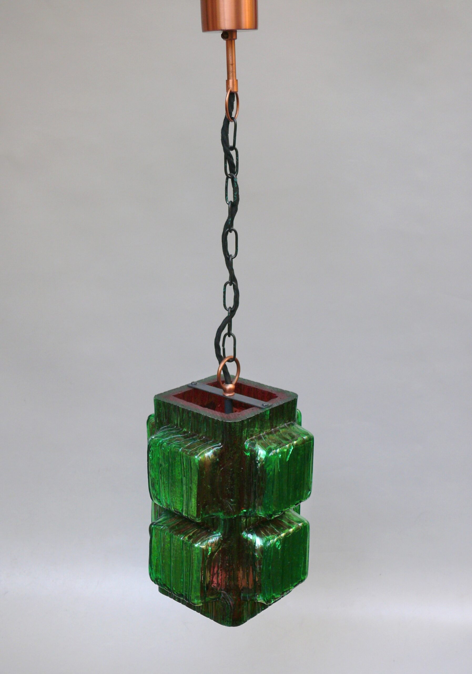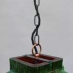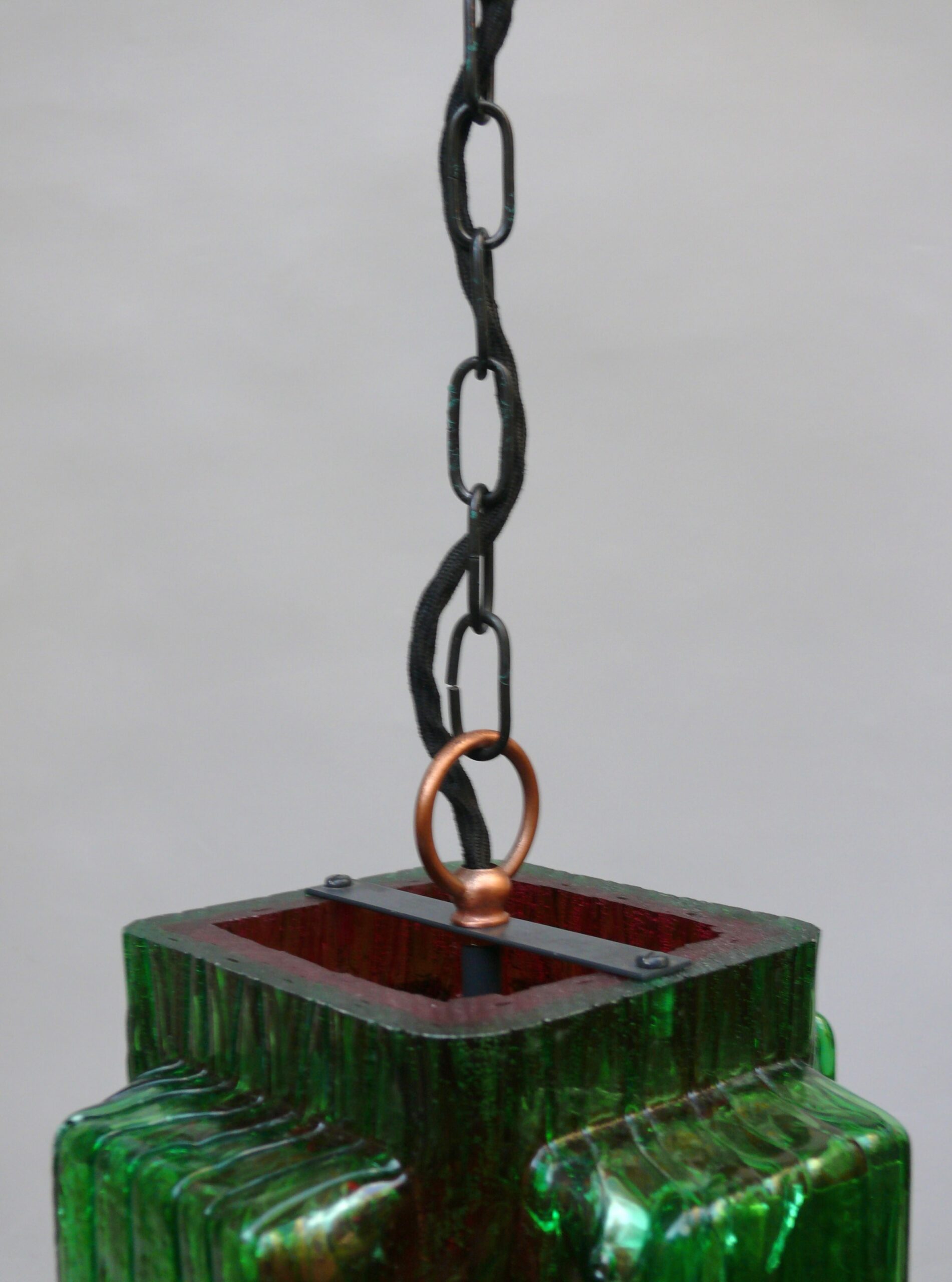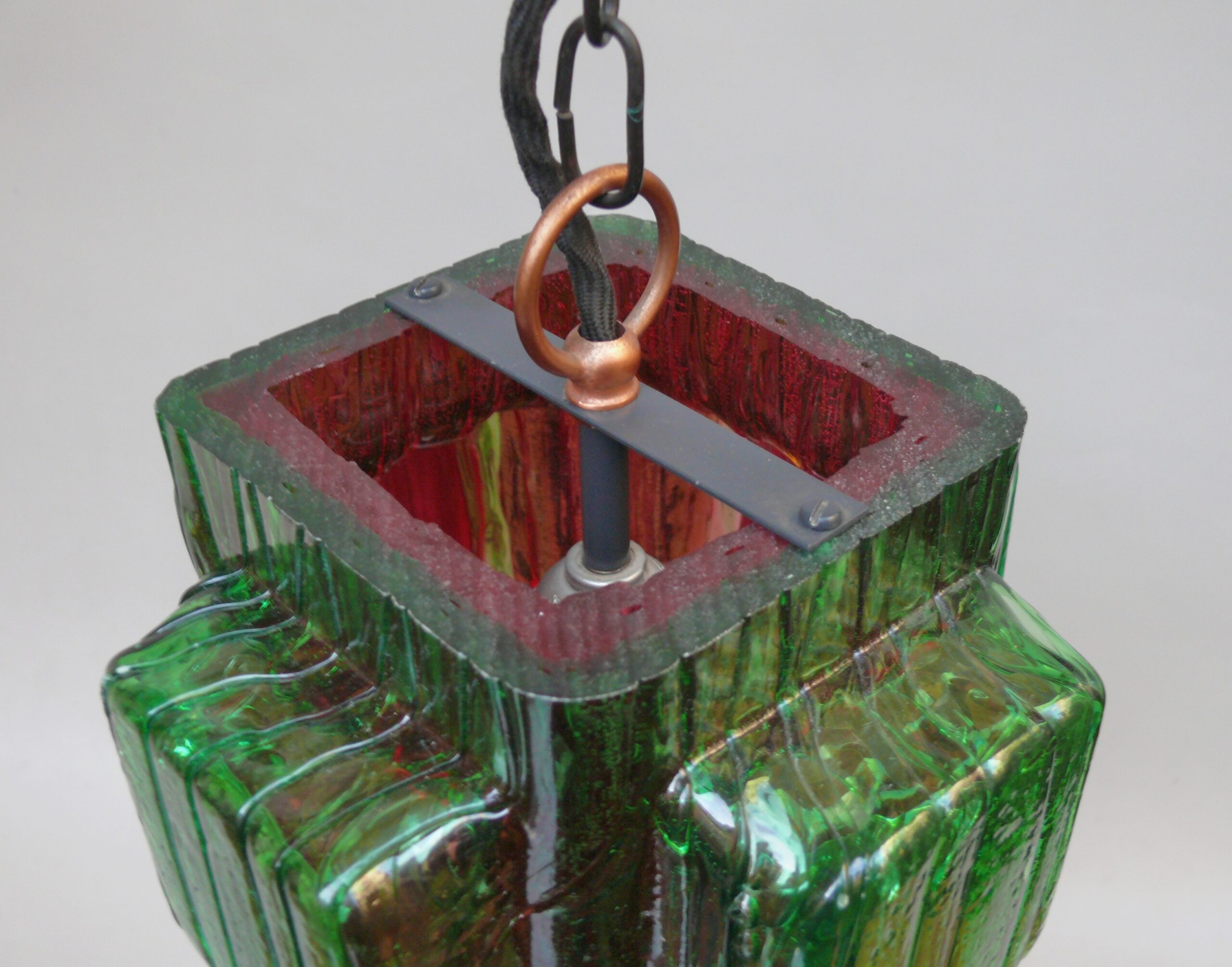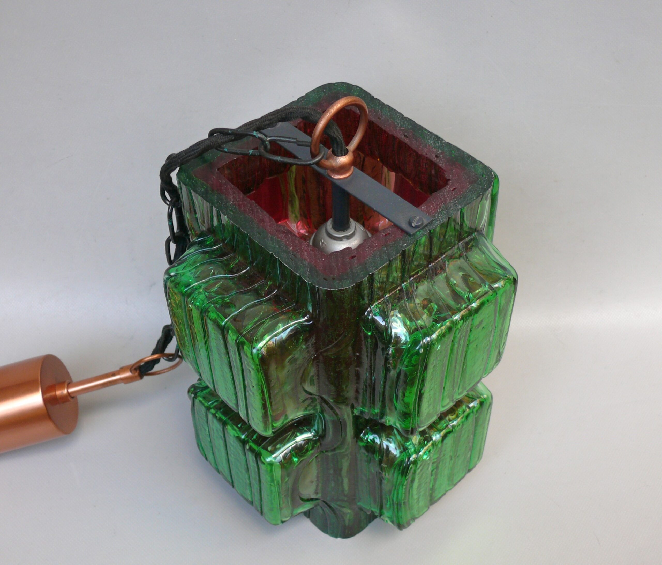 Die Aufhängung ist aus Kupfer mit einer Kette aus Stahl, der Lampenschirm aus dickwandigem Kunststoff in rot und grün. Der Kunststoff-Lampenschirm erinnert an „Eisglas“ und zeigt eine belebte Oberflächenstruktur.