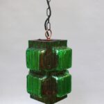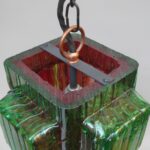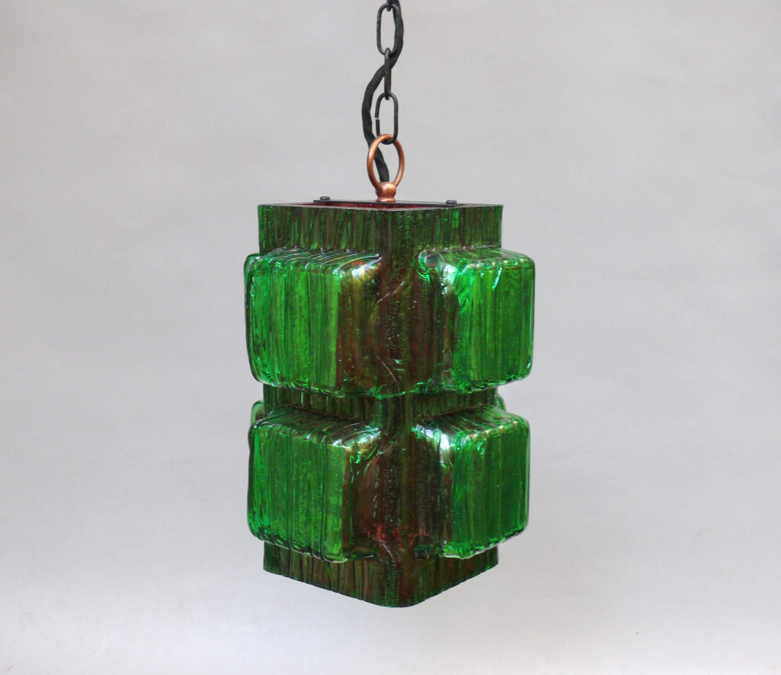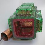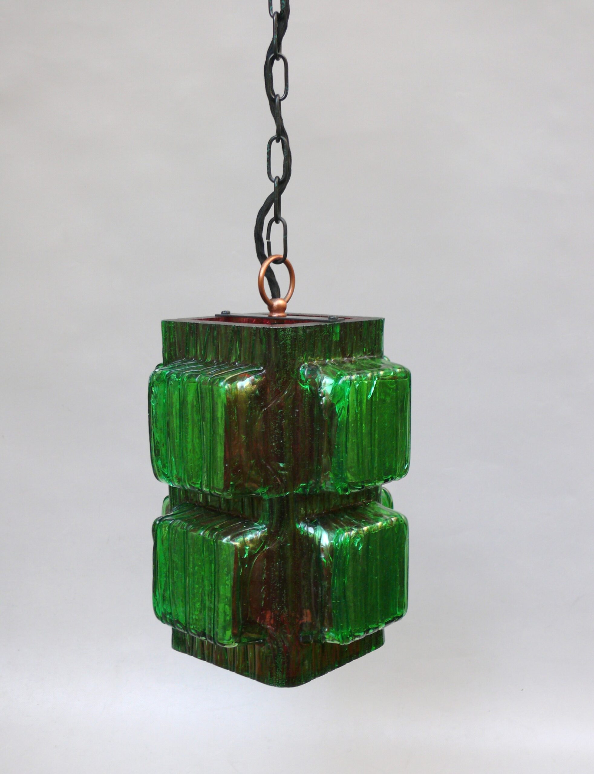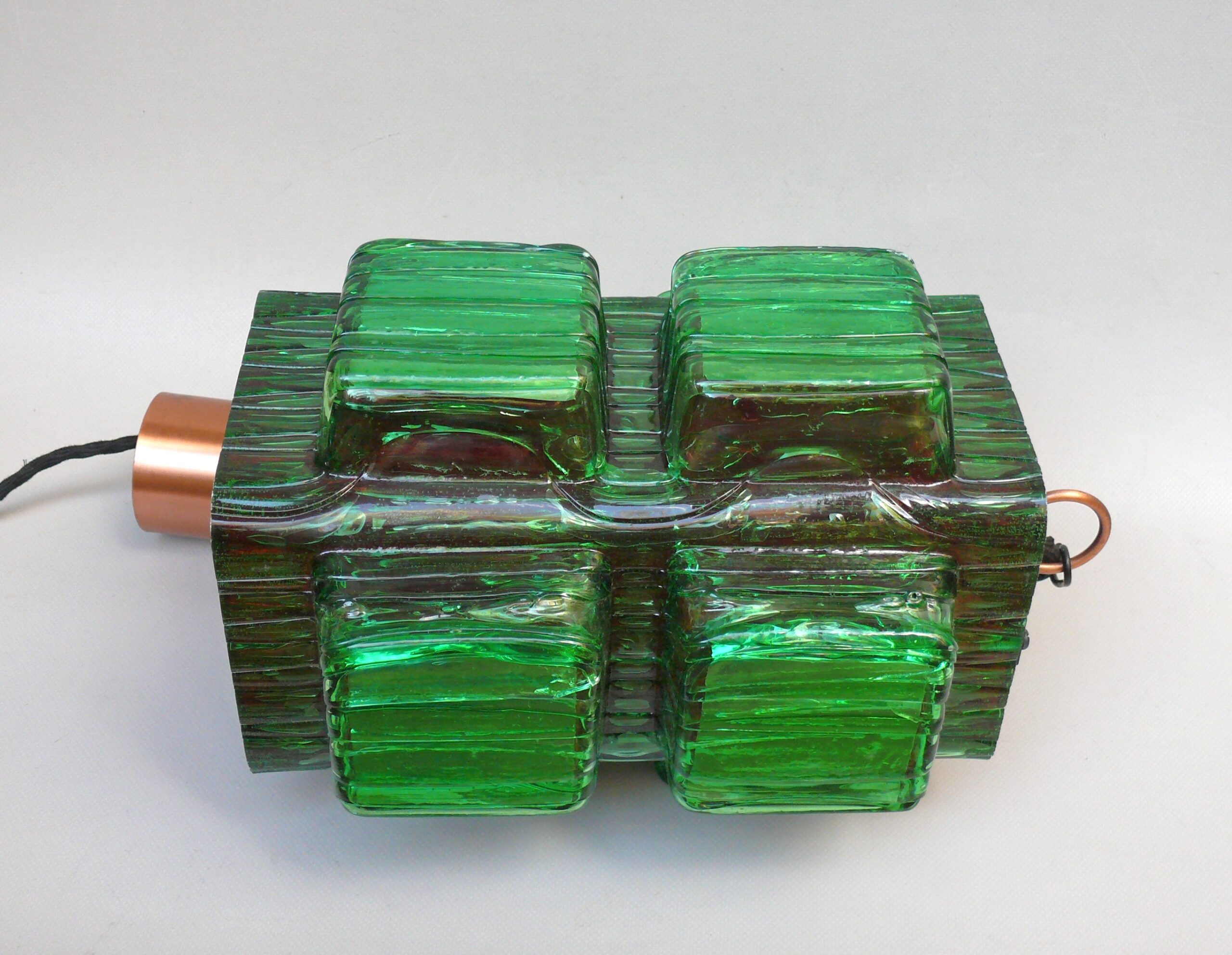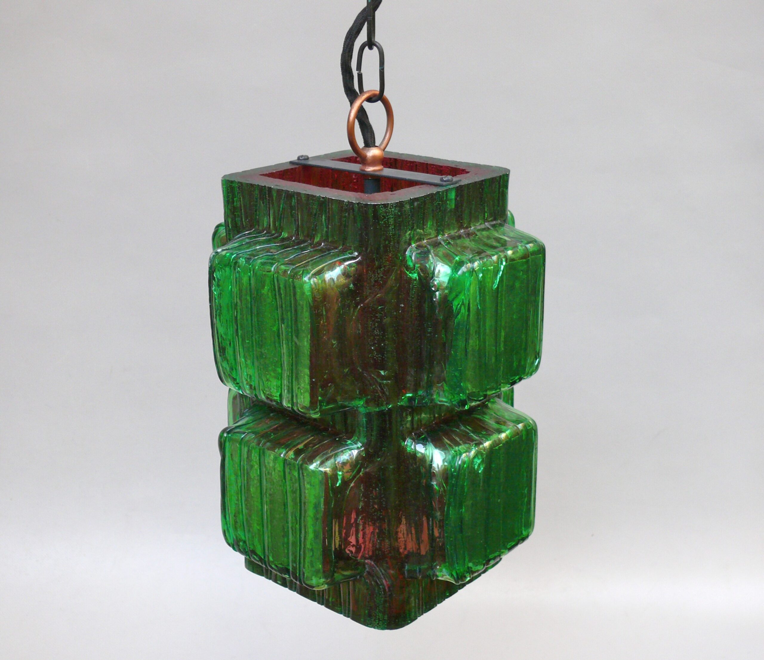 Die Aufhängung ist aus Kupfer mit einer Kette aus Stahl, der Lampenschirm aus dickwandigem Kunststoff in rot und grün. Der Kunststoff-Lampenschirm erinnert an „Eisglas“ und zeigt eine belebte Oberflächenstruktur.
