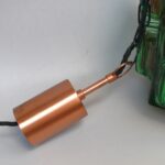 Die Leuchte wurde hochwertig imd detailverliebt gearbeitet. Der Lampenschirm und der Baldachin sowie die Halterung für das Glas sind aus Kupfer. Die Halterung ist anthrazitfarben lackiert.