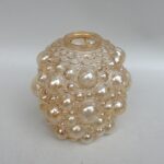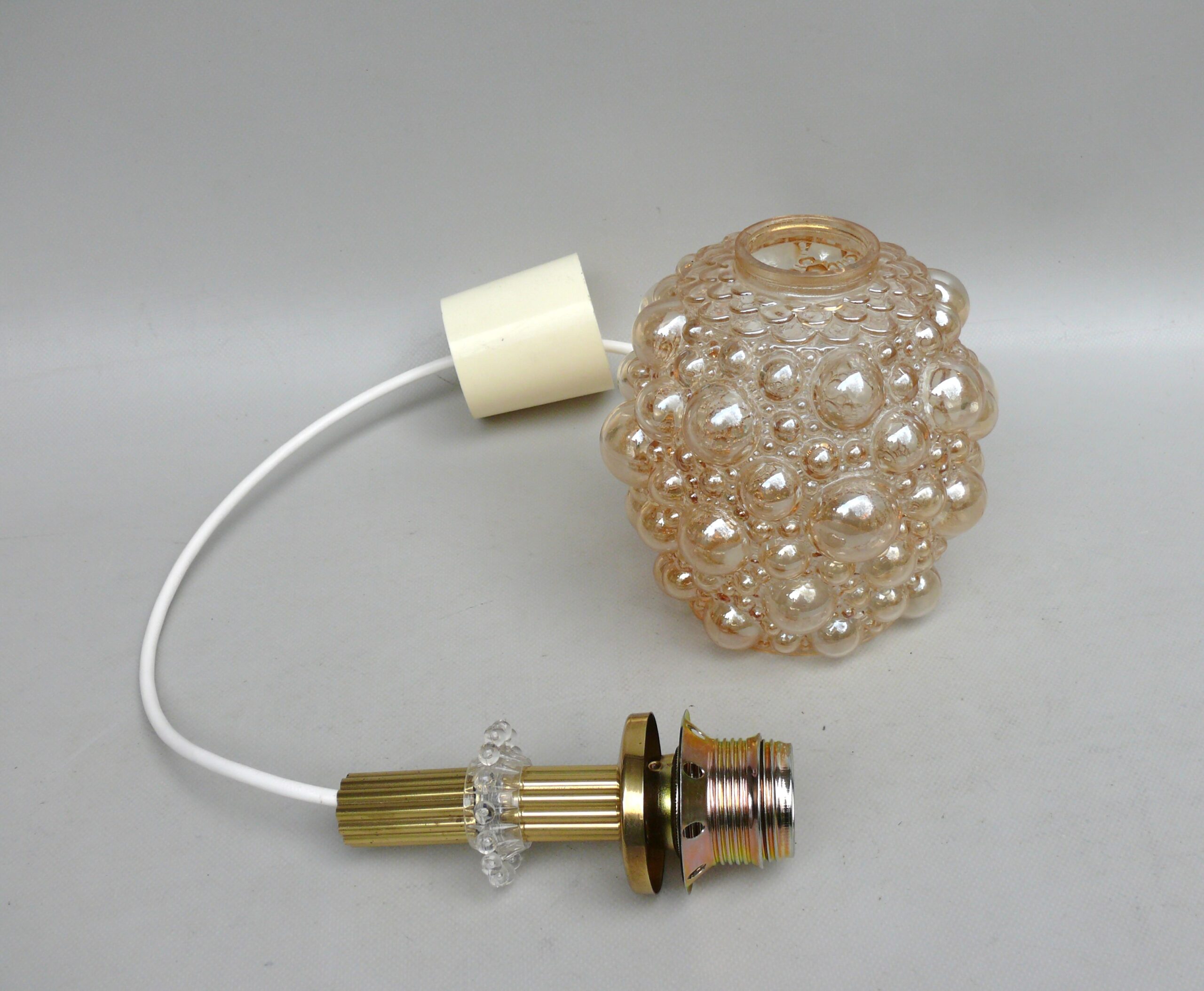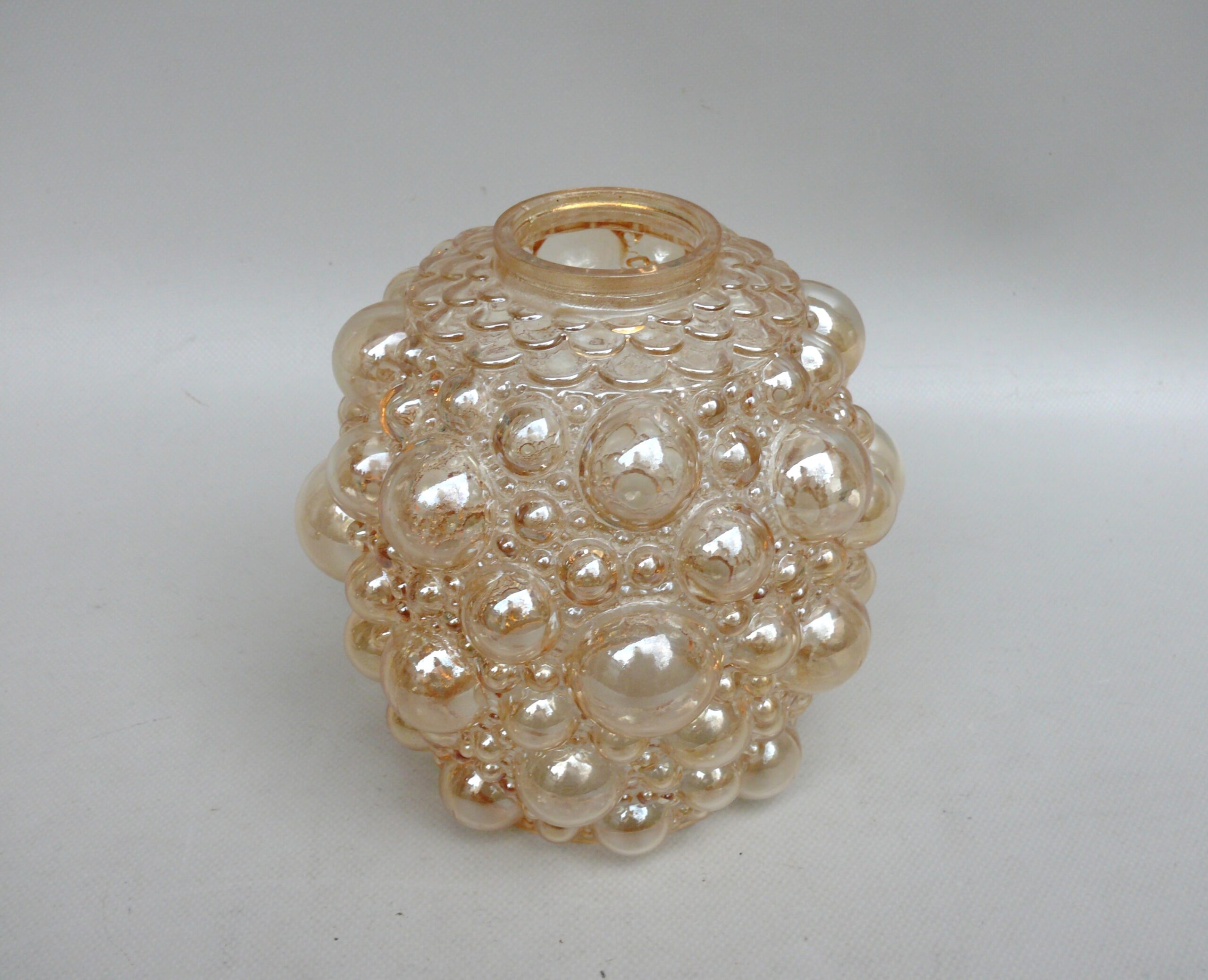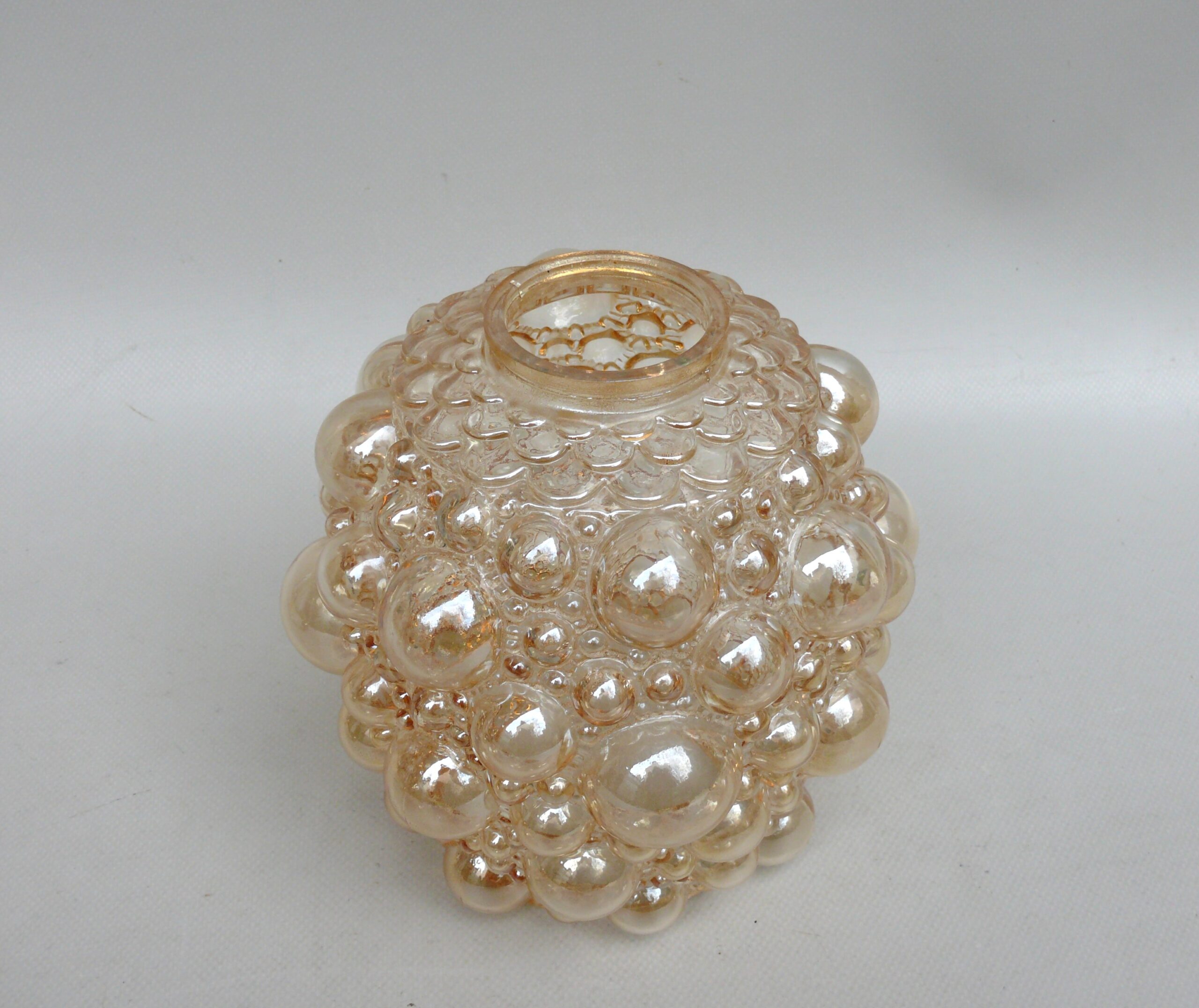 Durch den Lampenschirm mit Luftblasen in unterschiedlichen Größen und farblichen Einschlüssen entstehen interessante Lichteffekte. Diese werden verstärkt durch die verchromten Messingstäbe im Inneren des Glasschirms, die das Leuchtmittel umschließen.
