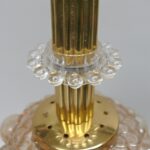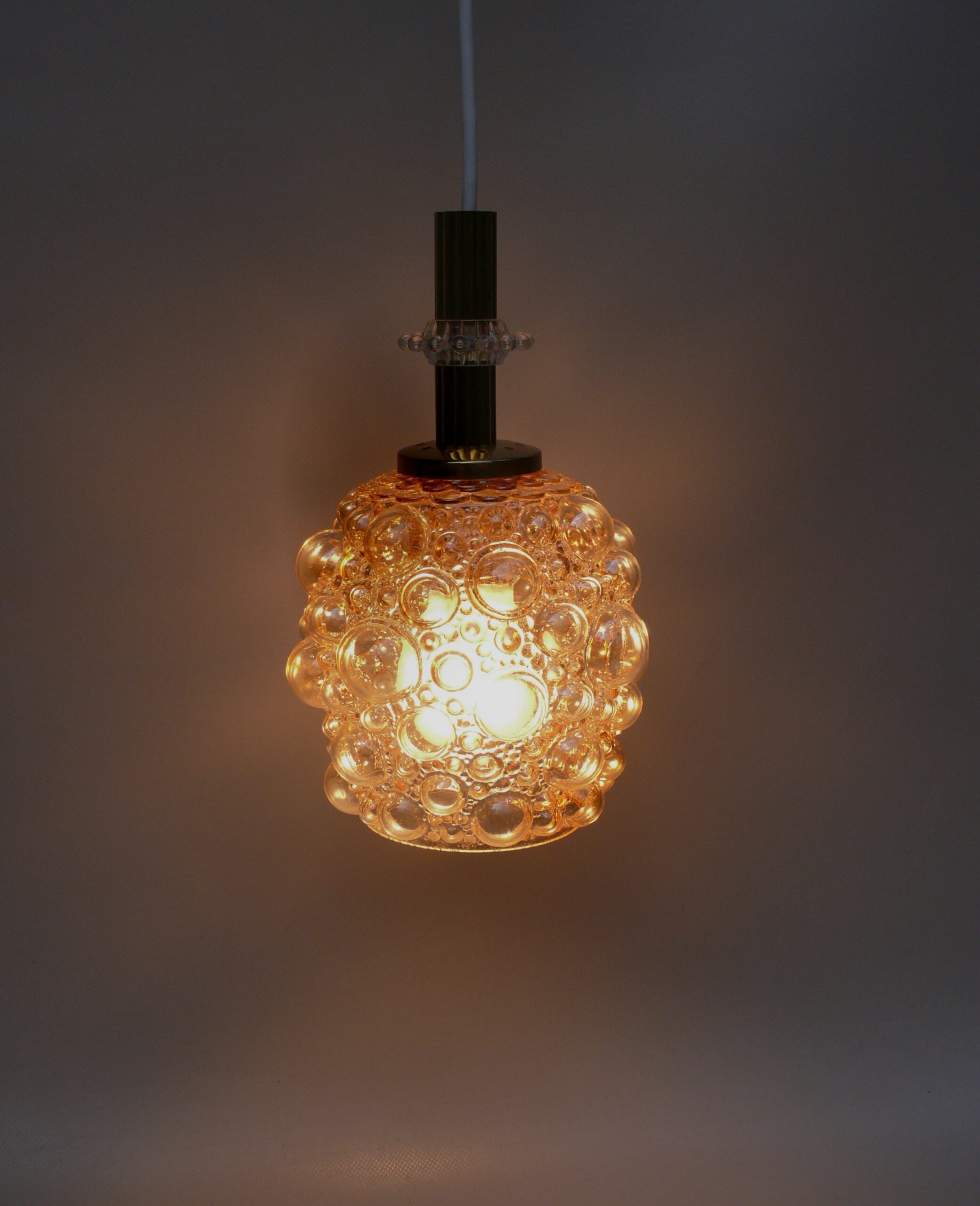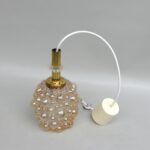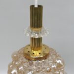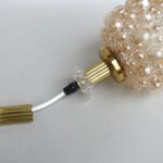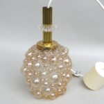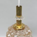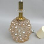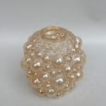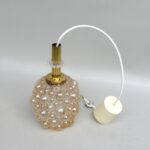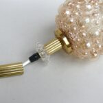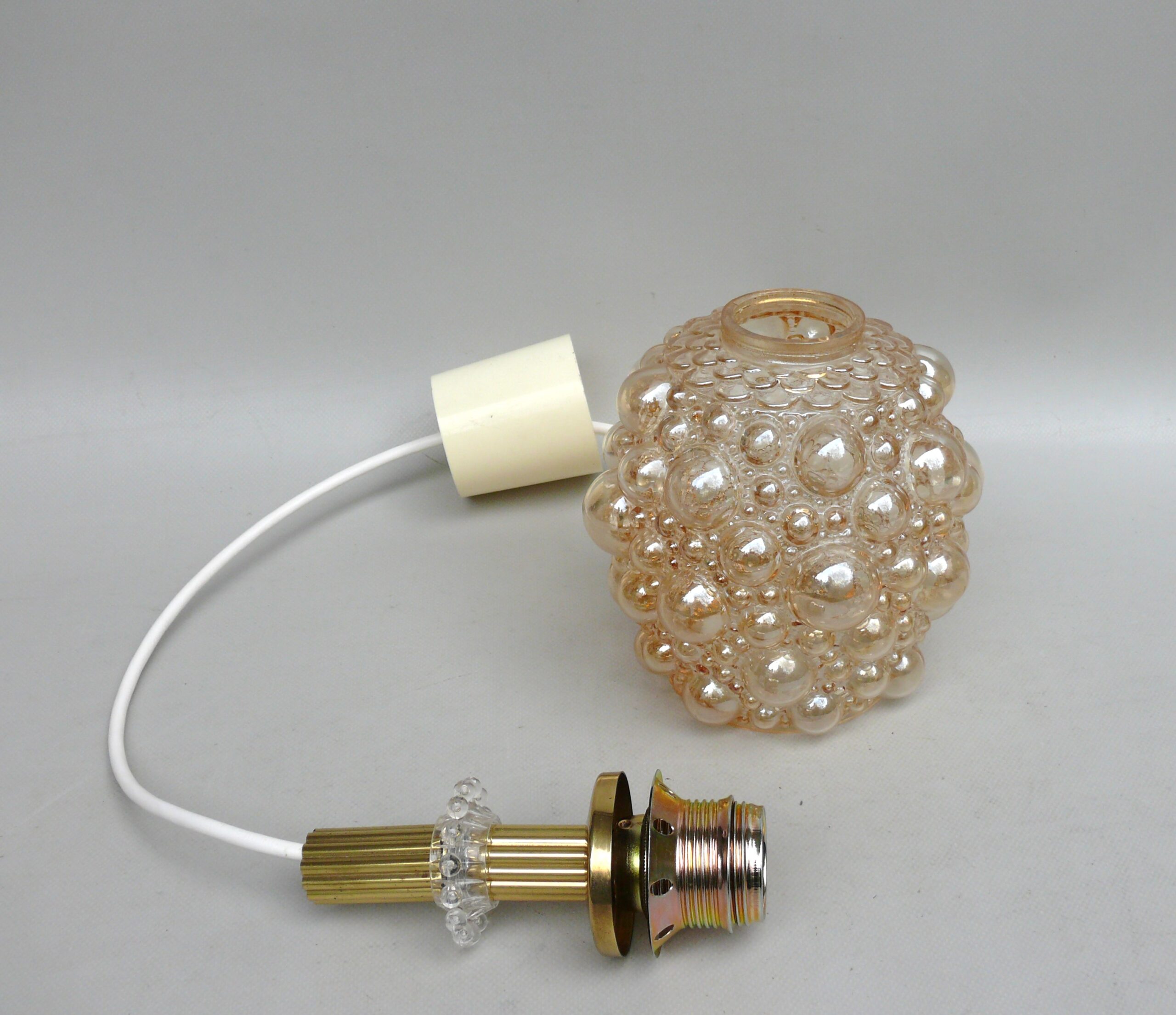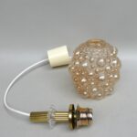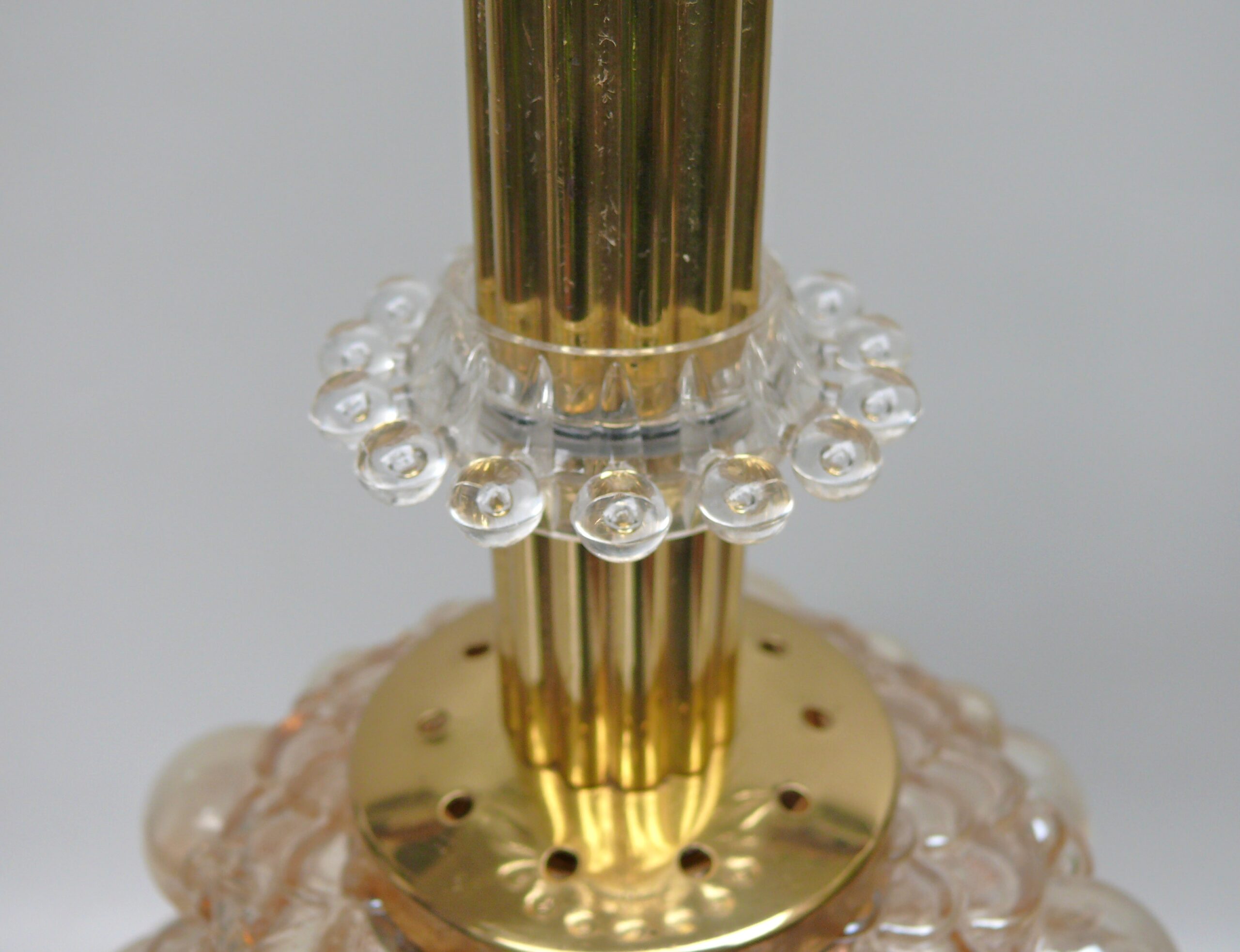 Durch den Lampenschirm mit Luftblasen in unterschiedlichen Größen und farblichen Einschlüssen entstehen interessante Lichteffekte. Diese werden verstärkt durch die verchromten Messingstäbe im Inneren des Glasschirms, die das Leuchtmittel umschließen.